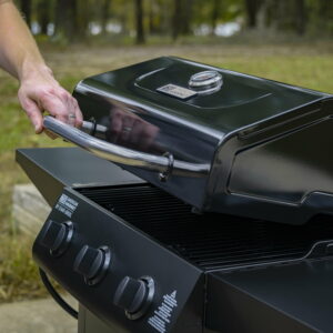– Lid-mounted temperature gauge to monitor the temperature of your grill