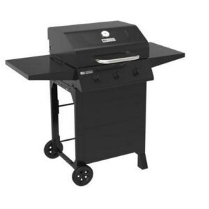 The American Gourmet by Char-Broil 3-Burner Cart Liquid Propane (LP) Gas Grill features a sleek black design with 30,000 BTUs of cooking power. With 360 square-inches of primary cooking space and 94 square inches of secondary cooking space, this gas grill offers sufficient space to cook up to 25 burgers at once. Heavy-duty porcelain coated grates that are rust-resistant and are easy-to-clean. This full-size grill with traditional styling is easy to assemble and is Gear Trax enabled. Features an easy to start with integrated ignition. Stainless steel burners ensure even cooking. Features a cart design with 6-inches wheels for easy mobility.
