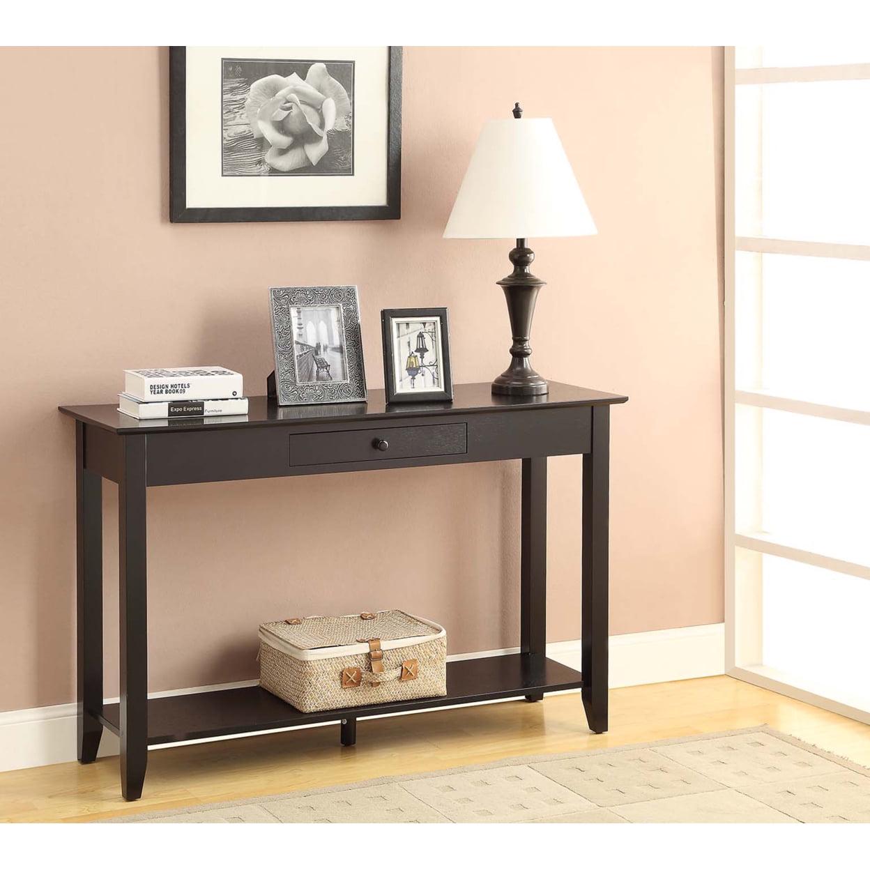American Heritage Console Table with Drawer, Black In a Classic American style, that will fit any decor, the American Heritage Console is a great choice for any home. Featuring a drawer for concealed storage, and a bottom shelf that is perfect for collectibles. Whether you use it in the living room, or any other room it will be sure to make a statement. Now available in multiple finishes.