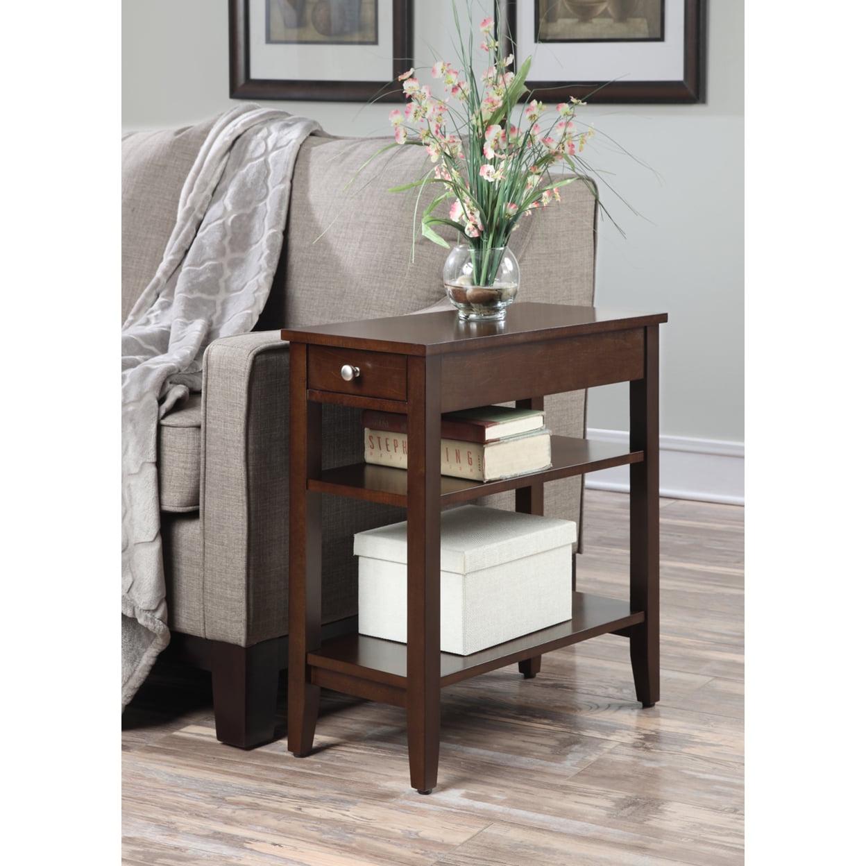 American Heritage Three Tier End Table with Drawer, Espresso The American Heritage 3 Tier End Table is the perfect complement to any home. Featuring a drawer for hidden storage, you can hide away unsightly controls and accessories. Also featuring a middle and bottom shelf, you will have plenty of space to display collectibles, or store magazines. Available in multiple finishes this piece will complete the look of any home decor.