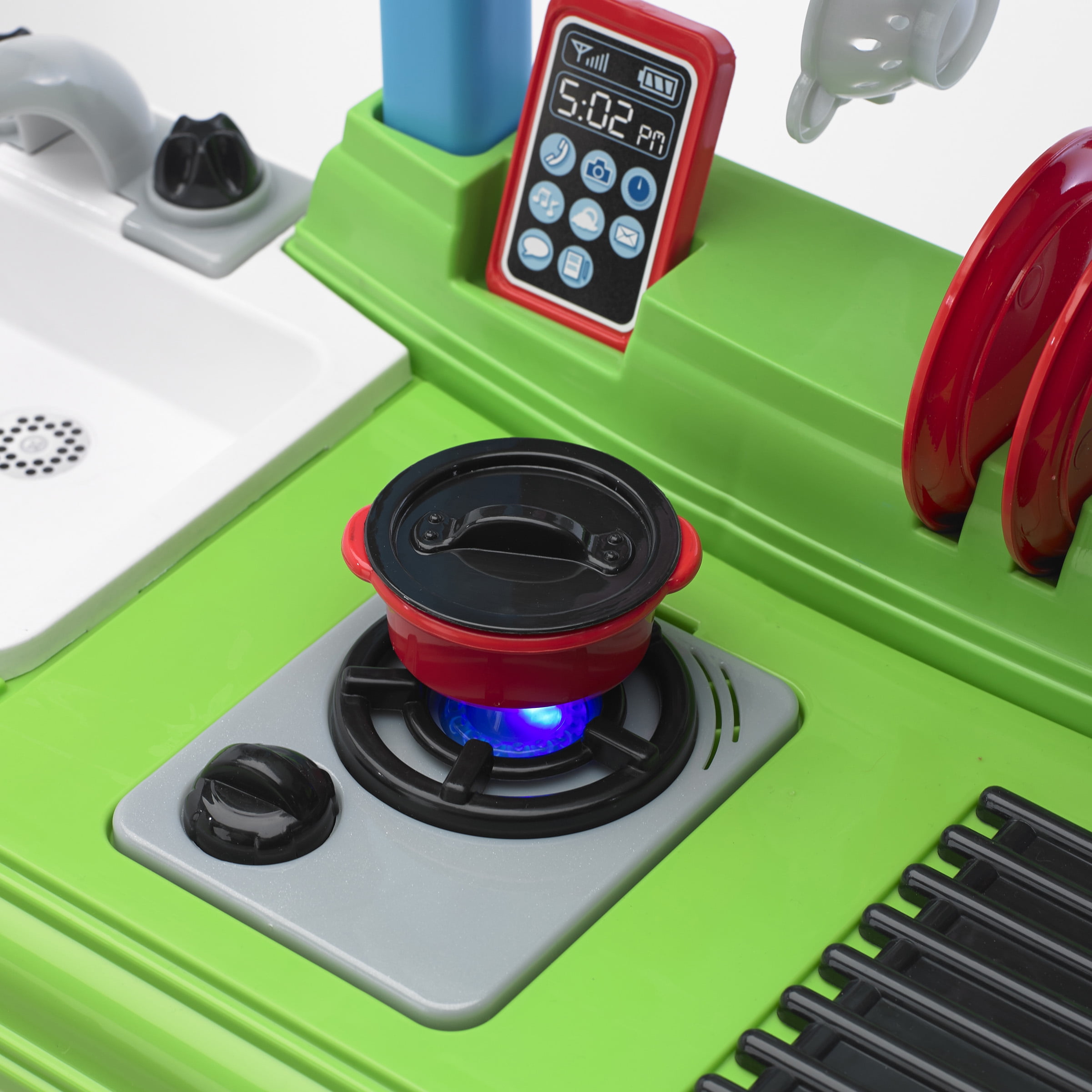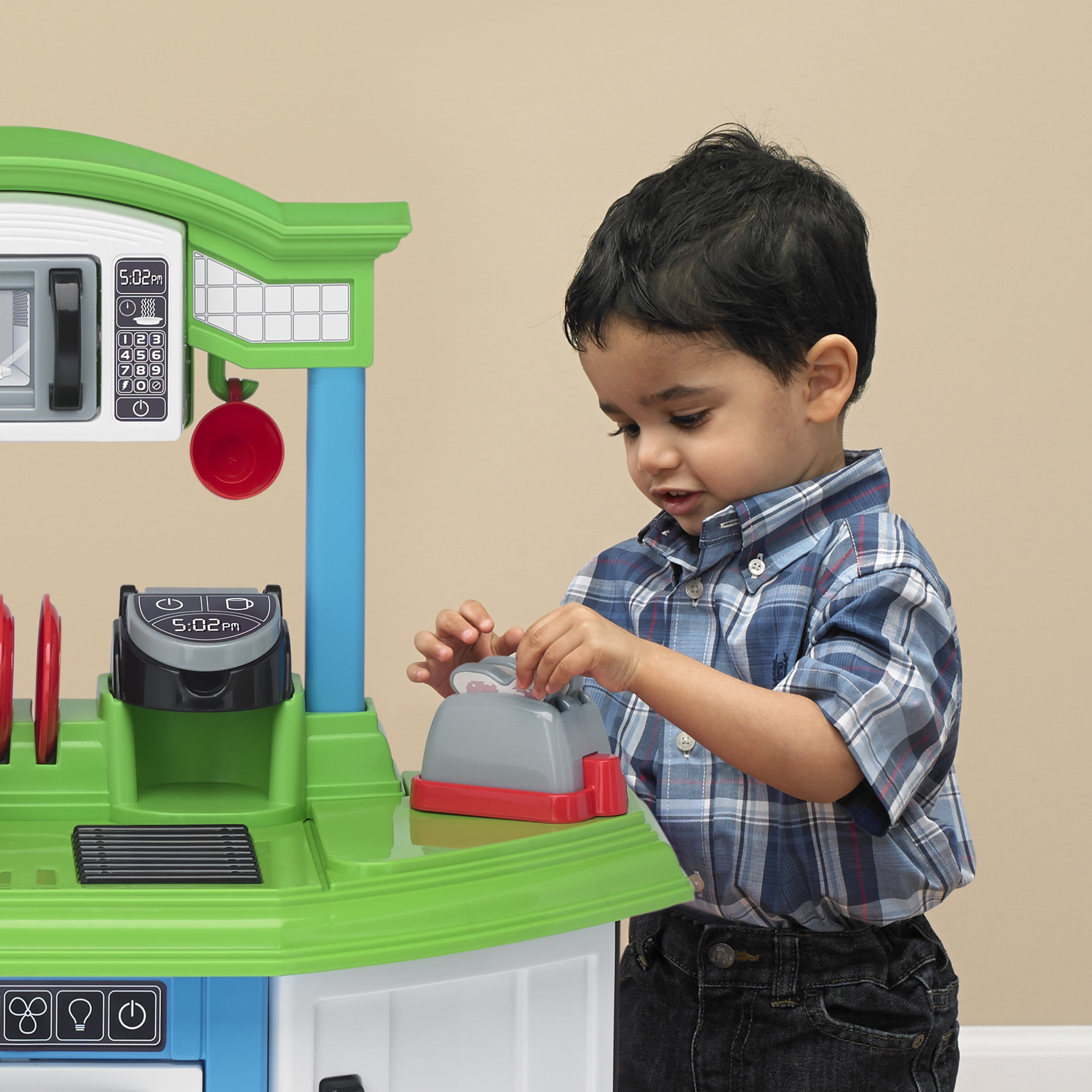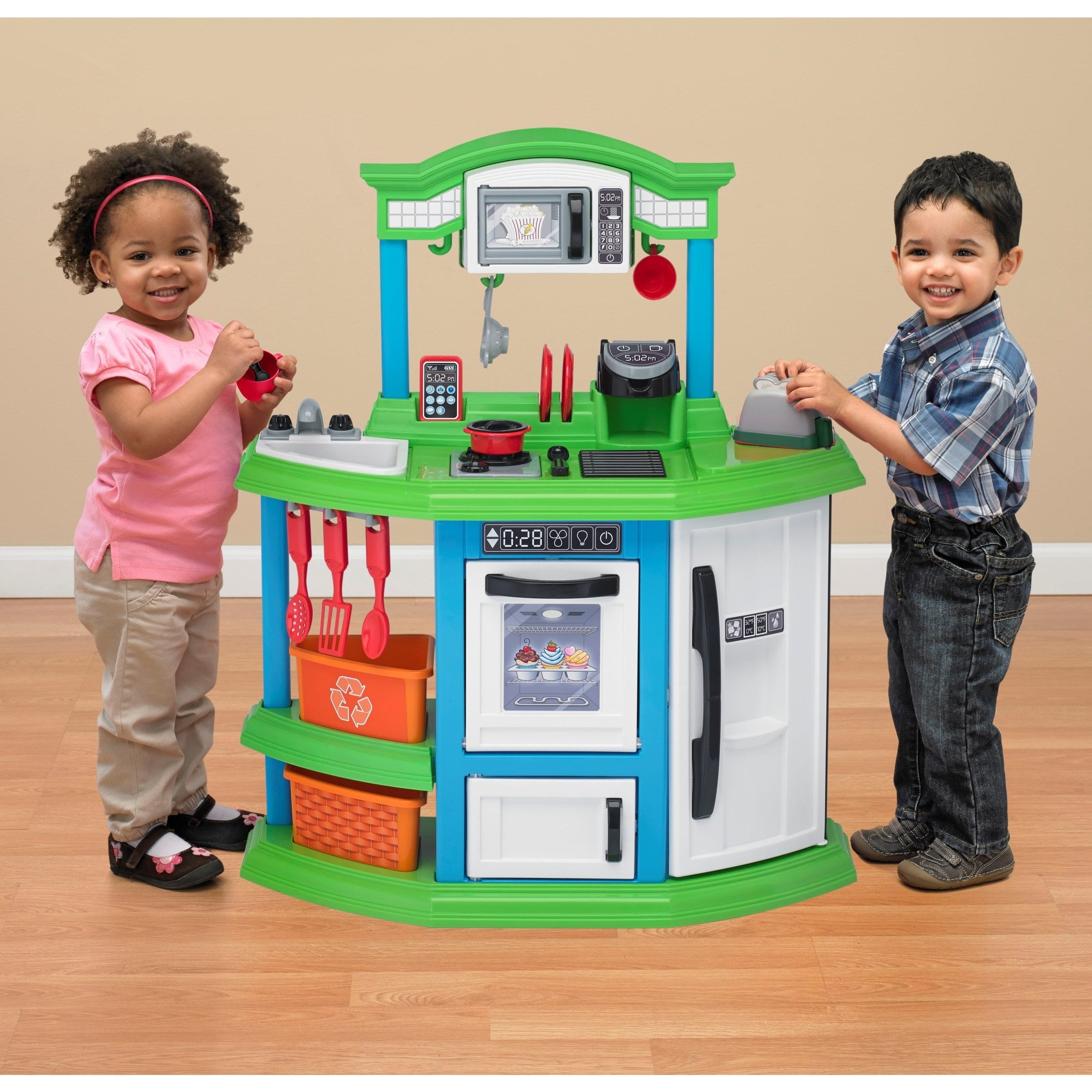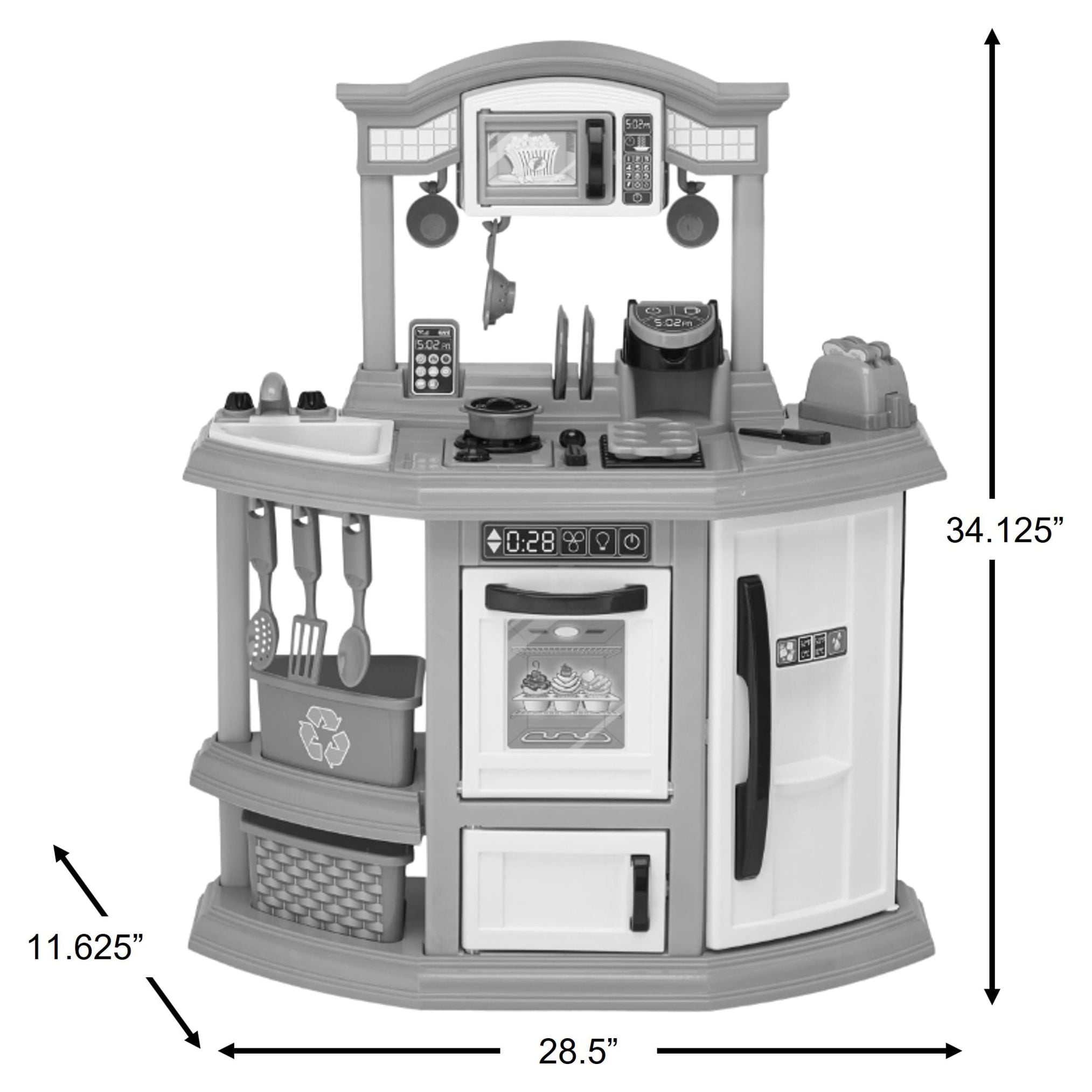 Cozy Comfort Play Kitchen with 22 Piece Accessory Play Set Unisex Indoor & Outdoor Toy for Kids Ultra-modern design Features single-cup coffee machine, microwave, refrigerator, oven, and toaster Realistic raised burner that lights up and make sounds when pots and pans are placed on it Easy, snap-together assembly No trimming or clipping required Includes 22 play kitchen accessories: plates, cups, forks, knives, spoons, toast, muffin tin, pan with lid, cell phone, spatula, large spoon, strainer spoon, and strainer Appliance doors open and close to enhance interactive play Recycling and play bins optimize storage space Constructed with BPA and phthalate-free plastic Encourages role play Dimensions (L x W x H): 28.50 x 11.62 x 34.12 inches Made in Michigan & Mississippi For ages 3+