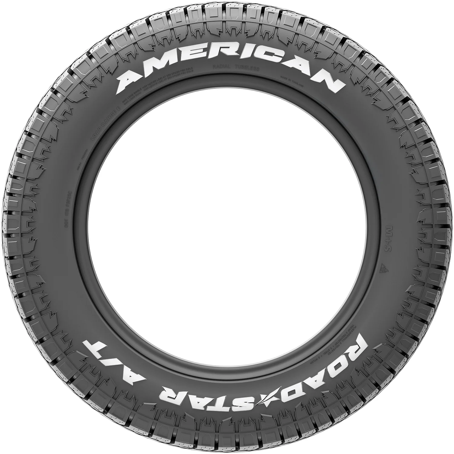 American Roadstar A/T OVERVIEW The American Roadstar A/T is an all terrain, all weather tire manufactured for SUVs and light trucks. American Roadstar offers a 40,000 mile treadwear warranty. Excellent all terrain traction is prompted with this tire. The optimized tread elements generate additional biting edges that enable the model’s consistent forward motion on different terrain surfaces. This allows the tire to conquer soft, loose, and uneven terrains with ease. Additionally, the self-cleaning tread elements eliminate mud, snow, and rocks stuck in the footprint. As a result, stone retention is avoided, while mud and snow cannot block the model’s surface contact. This combination promotes a safe on- and off-road drive. All weather traction is offered with this model. The tread pattern and the durable compound increase the tire’s grip in dry, wet, and winter weather. This allows the model to securely perform throughout the year. The compound maintains rubber flexibility even in hot summer or freezing winter weather conditions. The wide grooves disperse water and slush from below the tire’s footprint and avoid hydroplaning. This ensures great year-round driving safety. The tire improves its load and driving durability. This model can carry and withstand heavy loads without deformation in the process. This tire can perfectly perform by maintaining optimal shape under pressure. It makes this model a great choice for heavy-duty applications. It has a strong structure that can handle big loads and driving pressure. Since the tire has such a tough structure, it offers excellent load handling as well. Great damage resistance is provided with this tire. The reinforced internal structure and the durable rubber compound protect the tire from damage to its casing. This allows the tire to avoid external and off-road damage while the tires are in motion. As a result, the tire promotes a secured performance by avoiding cuts and impact damage from harming the casing. This guarantees a safer off-road performance. The American Roadstar A/T offers great controllability on various surfaces. The aggressive tread pattern maintains constant surface contact during the performance. It increases the tire’s steering responsiveness and driving stability. In other words, the steering response time becomes quicker and more accurate to the driver’s commands, while the structure is secured against driving pressure. Cornering is upgraded as well, thanks to the wide shoulder blocks and their constant surface contact. As a result, the driver has full control over the vehicle, offering a safe drive. All weather tires receive the three mountain peak and snowflake (3PMS) symbol for their exceptional winter weather performance. They are all season tires with extra winter weather grip, in order to guarantee safer year-round durability. This ensures their true and secure driving ability throughout the year. Not all tire sizes are suitable for all vehicle types. Please refer to the item specifications for accurate information about vehicle type fitment for this particular size. Manufacturers recommend changing tires every 10 years. As long as tires are properly stored before they are sold, the year of their manufacture will not shorten their service life.