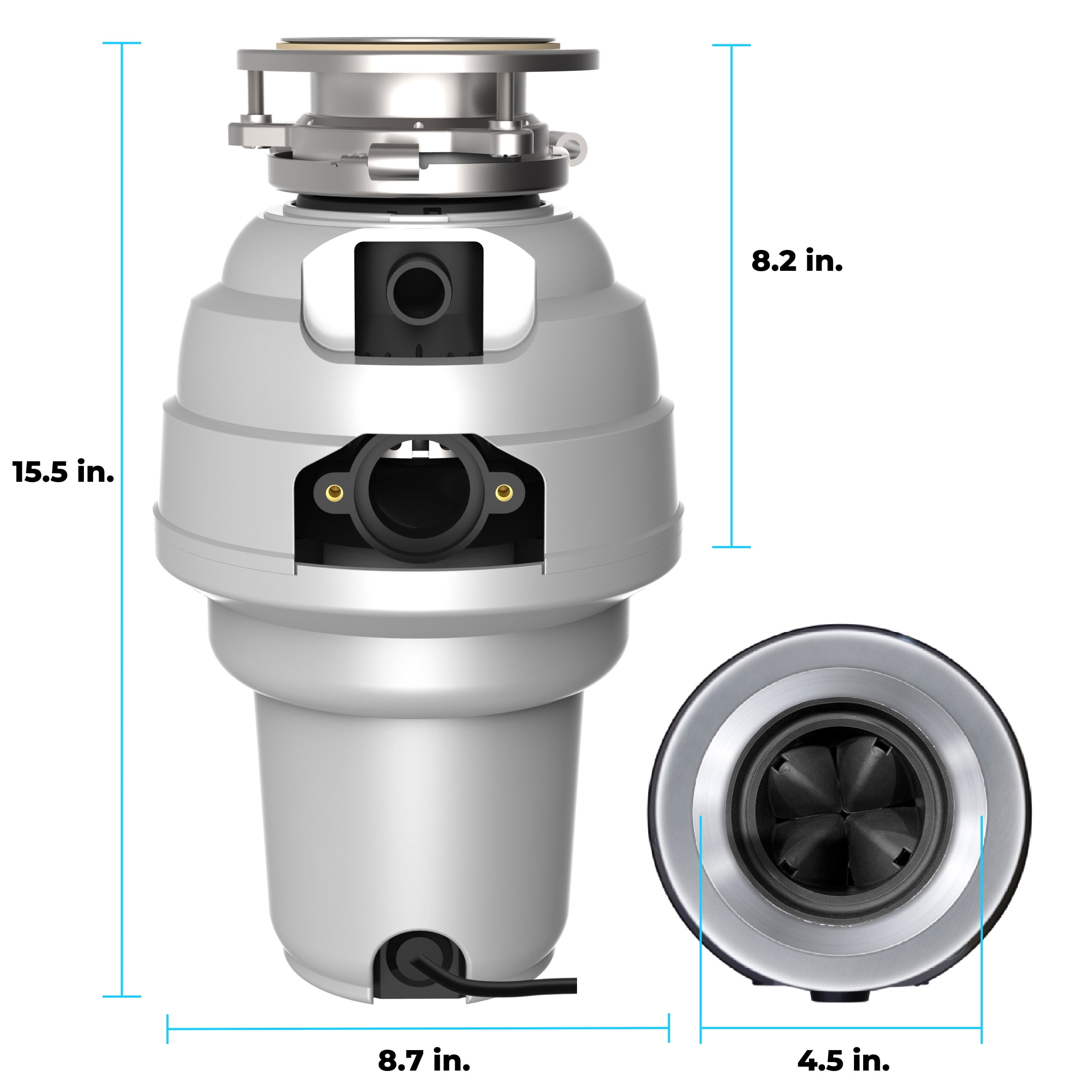 Stainless Steel Sink Flange and Stopper Attached 34 inch Power Cord Noise Dampening Removable Splash Guard Silver Guard Magnetic Metal Catch Ring – Disposer Protection General Specifications 1.25 HP 2800 RPM 110V/120V 36 oz Grind Chamber Continuous Feed 3-Bolt Mount Assembly Additional Features Torque Master Balanced Grinding System – Superior Torque, Anti-Jamming, Minimal Vibration/Rattle Bio-Shield Anti-Microbial Odor Protection Agent Molded into Grind Components Load Smart Grind Motor – Speed and Torque Adjusts to Size of Food Waste Load All Stainless Steel Grinding Components – Corrosion Resistance Full Torque on Startup to Prevent Jams – No Dejamming Wrench Needed Full Sound Shell for Quiet Operation