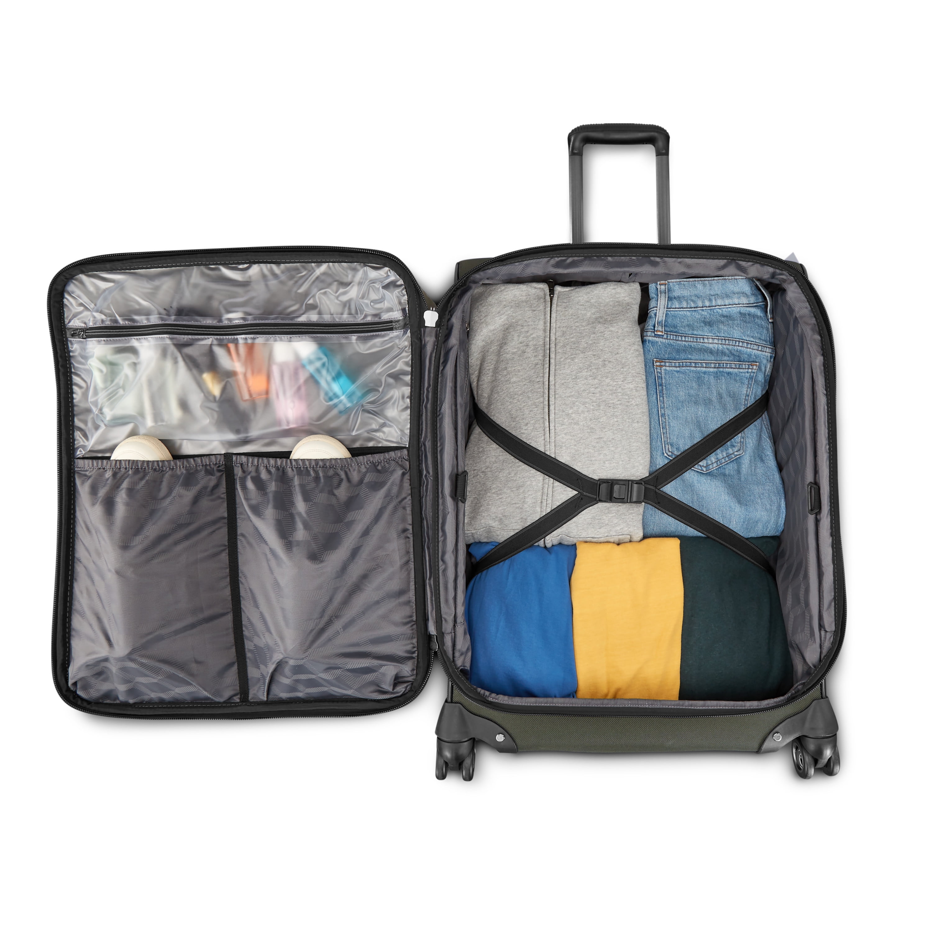 Large sized checked luggage Durable Polyester Softside Right Height™ handle with wipe-clean TPR Membrane Double wheel with fender rubber corner guards and textured kickplates for extra durability 3 cargo style external pockets PLUS internal zippered wet pocket, zippered modesty pocket and shoe pockets Smart Fix™ Organization Buckles
