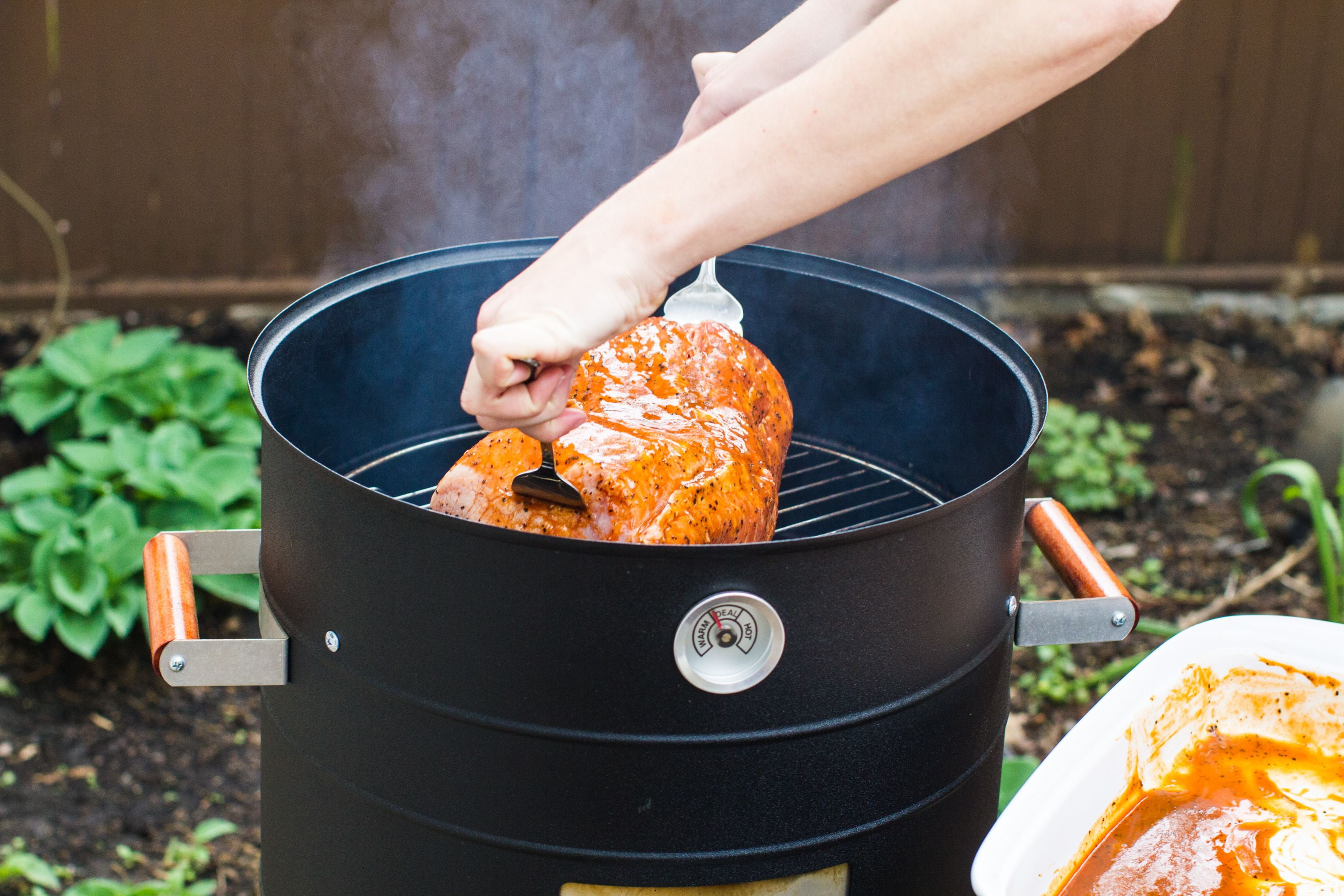 Features 351 square inches of cooking space 2 chrome-plated cooking grids with handle areas Built-in temperature gauge Includes stainless steel 5 1/2 quart water pan Converts into Lock ‘N Go electric portable grill Heat-resistant handles enables safe operation A loose fitting lid with tight fitting doors allows for excellent smoke flow For outdoor use only