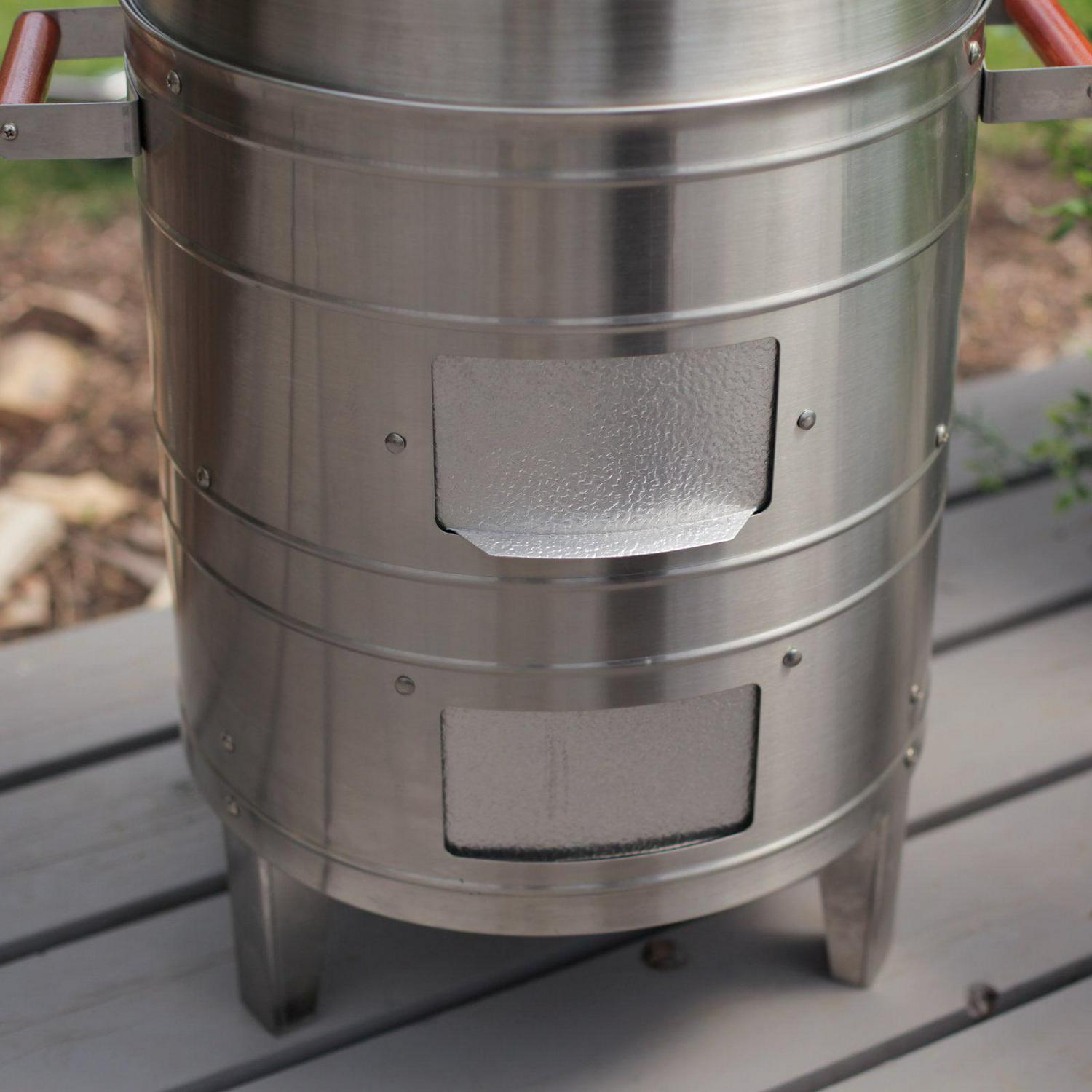 – Sliding doors for inspection and adding to liquid, wood, and charcoal