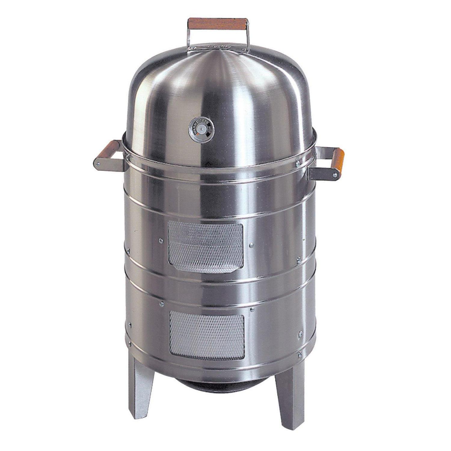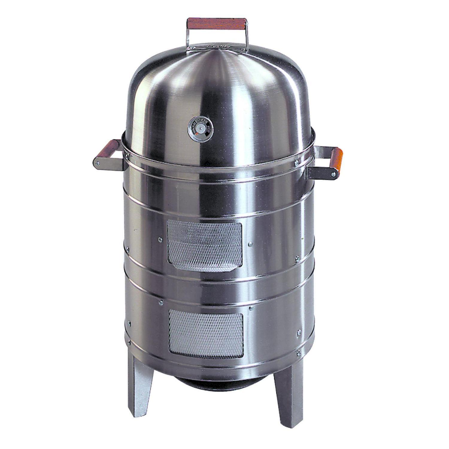 The Americana Stainless Steel Charcoal Water Smoker offers optimal control, longer cook time, and less monitoring than traditional charcoal smokers. Perfect for smoking chicken, fish, and other meats to a savory finish. The combination of the charcoal with the smoldering wood chips produce smoke that, together, more efficiently penetrate and flavor meats while they cook. A stainless pan holds 5-1/2 quarts of water to last up to five hours for extended smoking operations. With 351 square inches of cooking surface, there s room to smoke nearly 50 pounds of meat at once. Sliding access doors make it easy to check water levels and add more if necessary. Meco designed this smoker so that you can add wood and water without even removing the cover, so heat loss is minimal and meats are tender. Heat-resistant wood handles on the sides and hood mean easy transport and monitoring.