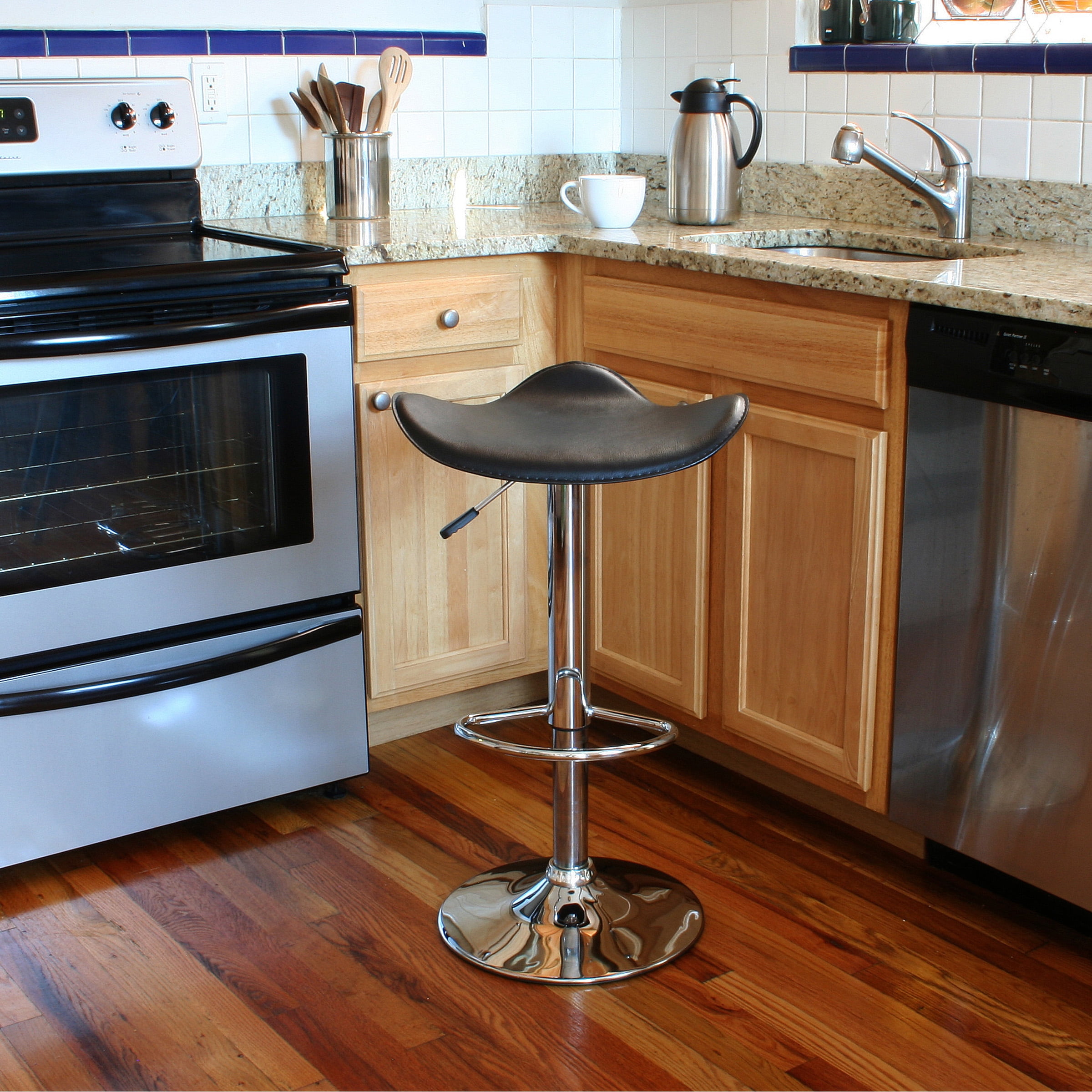 The Single AmeriHome Adjustable Height Backless Bar Stool adds a classic element to the kitchen, bar, game room, basement, or shop. The bar stool has a style reminiscent of the days of diners and drive ins and features a mirrorlike polished chrome base and a black vinyl seat for a hint of classic vintage design. This bar stool is designed with comfort in mind. With a large 18 inch wide, padded vinyl 360-degree swivel seat, a built-in footrest, and an adjustable seat height of 23.25 to 31.5 inches. This stool is comfortable for kids and adults. Adjustable seat height from 23.25 to 31.5 in.18 in., padded vinyl, 360-degree swivel seat.330 lbs. weight capacity. Sold individually. Material: Vinyl, Chrome. Color: Black, Silver. Warranty: 90 Day Limited. Weight: 12 Lbs. Dimension: 18″Lx18″Wx31.5″H