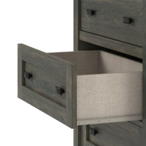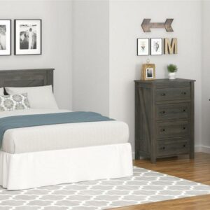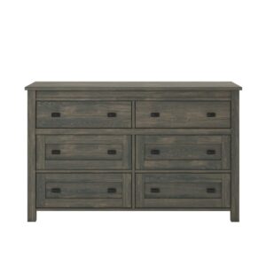 Give your bedroom a beautiful rustic style makeover with the Ameriwood Home Farmington 6 Drawer Dresser. Made from MDF and particleboard, this farmhouse-style design highlights the rustic brown with gray undertones you would see in an old barn or popular reclaimed pieces of furniture. The 6 drawers give you plenty of storage for folded clothing such as t-shirts, pants and sweaters. Each drawer has metal slides and are finished with a linen-look paper to prevent your clothes from snagging on raw material. The beautiful framed drawers and side details bring out the woodgrain look and pair perfectly with the oil rubbed bronze pulls. A wall anchor kit is provided with this item to secure the Dresser to the wall and keep your family safe. The 6 Drawer Dresser ships flat to your door in 2 boxes and requires assembly upon opening. Two adults are recommended for assembly. After assembled, the 6 Drawer Dresser measures to be 33.375″H x 53.625″W x 17″D.