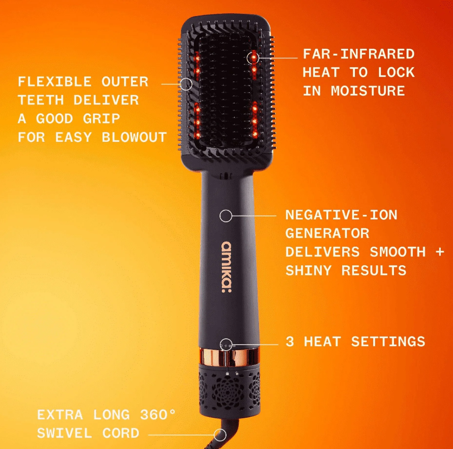 Amika double agent 2-in-1 straightening blow dryer brush Flexible outer, teeth deliver, a good grip, for an easy blowout, extra long 360-degree, swivel cord, Baberebal, Amika: Far-infrared, heat to lock, in moisture, negative-ion, generator, delivers smooth +, shiny results 3 Heat settings Styles hair 3x faster compared to competitor 1000w dryer and thermal brush hair is 2x smoother and 1.7x shinier than air-dried hair clinically shown to reduce frizz by 30%