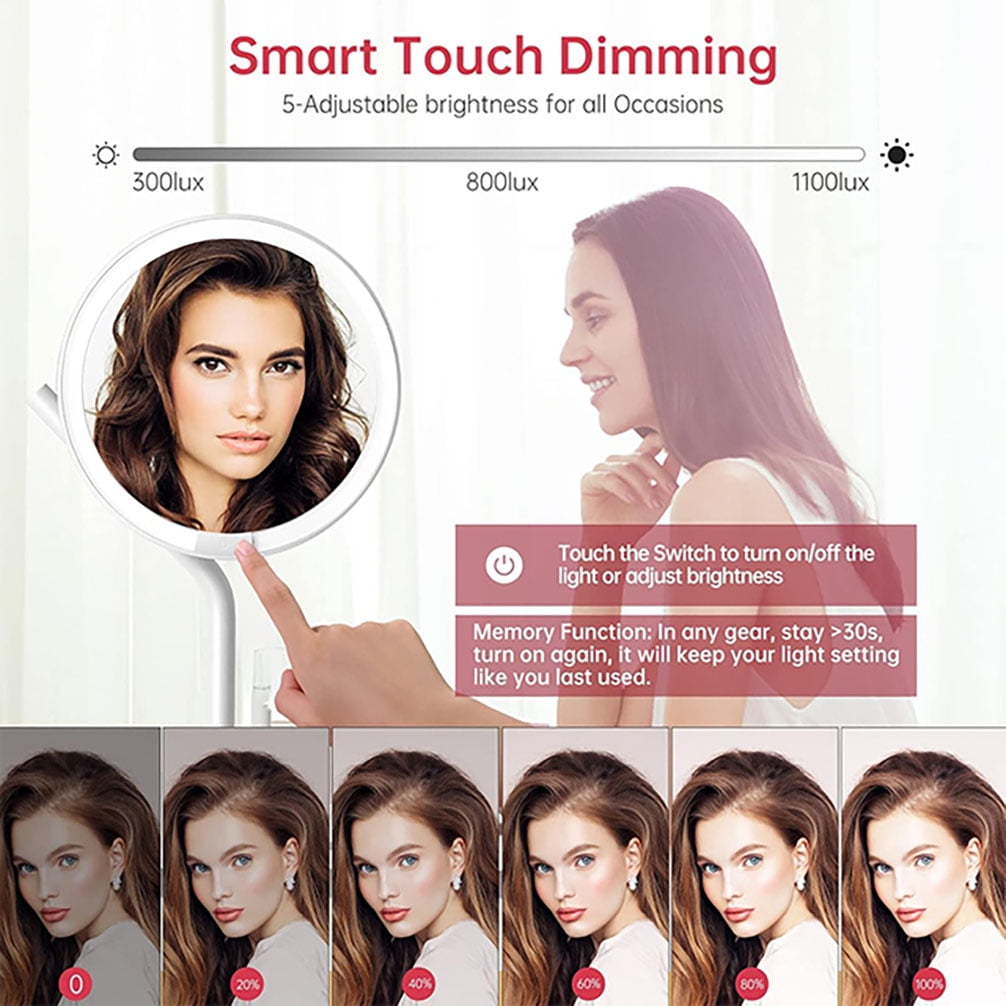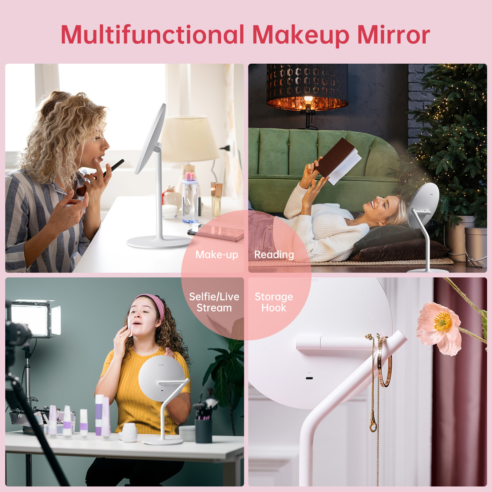 【5X magnification & High Definition]】1X/5X magnification. The 5X magnifying makeup mirror allows you to see your entire face and provide details of your face, making it ideal for fine makeup, wearing contact lenses, eyebrow grooming, facial care, etc. Reminder: When using the 5X magnifying mirror, please attach it to the makeup mirror with magnetic connection. 【3 Color Lights & Stepless Brightness】This LED makeup mirror has a brightness of up to 1100lux and a super high CRI of 97. It features a custom LED light source based on skin tone rendering design, which simulates natural sunlight (up to 95% similarity). The light is soft and can cover all corners of your face. Short press the sensor switch to change the light color, press the”+/-” to adjust the light brightness, to meet all your needs in different environments. The vanity mirror also has a memory function, which remembers the last brightness you need. 【180° rotatable & built-in 2000mAh battery】The 180° rotation design allows you to easily find the desired angle, switch between 1x and 5x lenses, and give you perfect reflection. With a built-in 2000mAh battery, you can use the wireless function for up to 4 hours after fully charging, and can also be charged for extended use. 【Storage Hook & Detachable】The design inspiration comes from the sunflower that is born in the sun. The vanity mirror has added storage hooks, which can store small accessories such as bracelets, and the dressing table is no longer messy. Detachable to carry, travel without burden. 【Detail Design and Widely Use】This lighted makeup mirror is a large 8-inch size, providing a large and high-definition wide-angle field of view. The compact design takes up very little space, and the non-slip padding at the bottom enables the mirror to stand stably on the countertop. It is not only a professional vanity mirror that can be used in home, bathroom, hotel, spa, beauty salon, etc., but also a desk lamp, night light, atmosphere light, etc. It is the perfect gift.