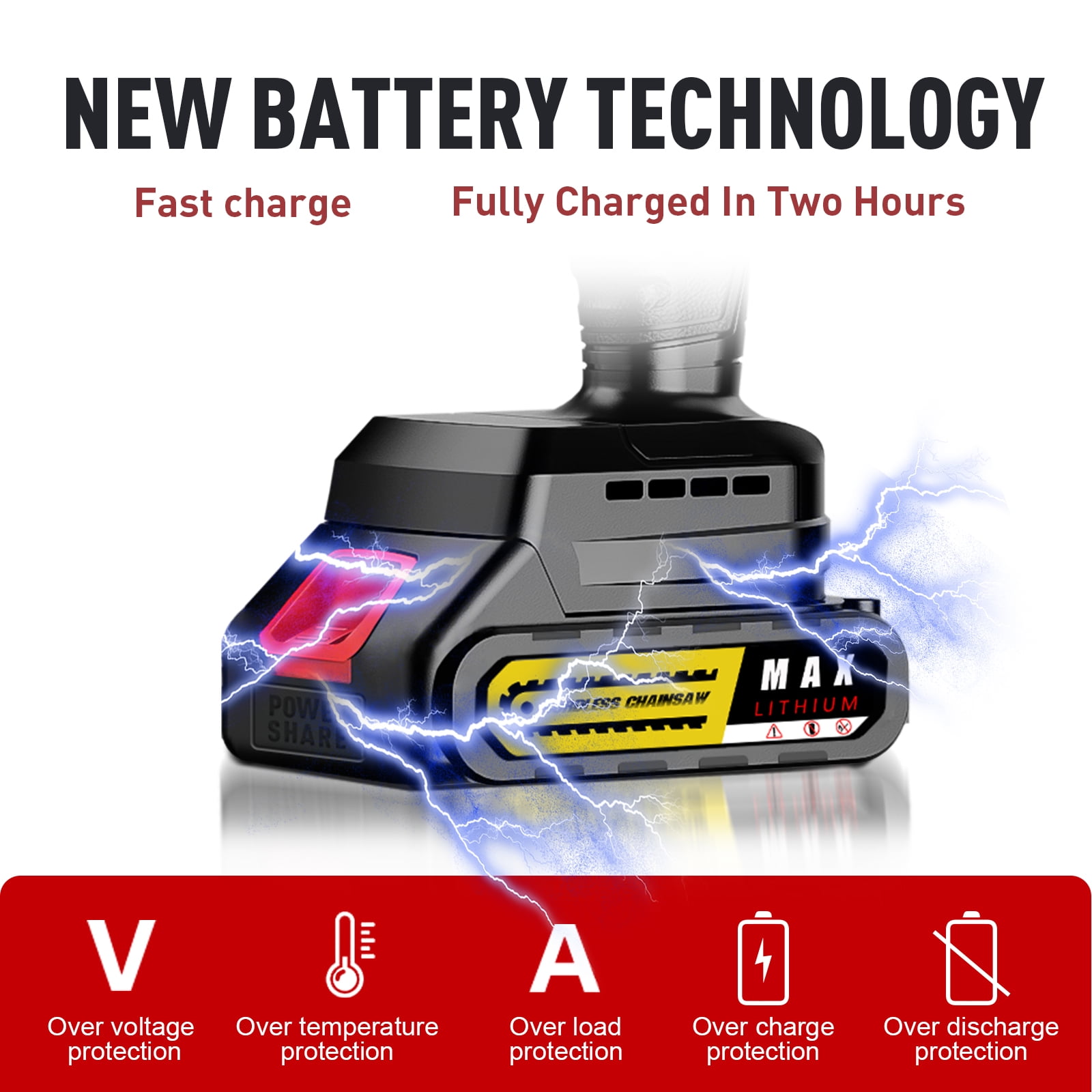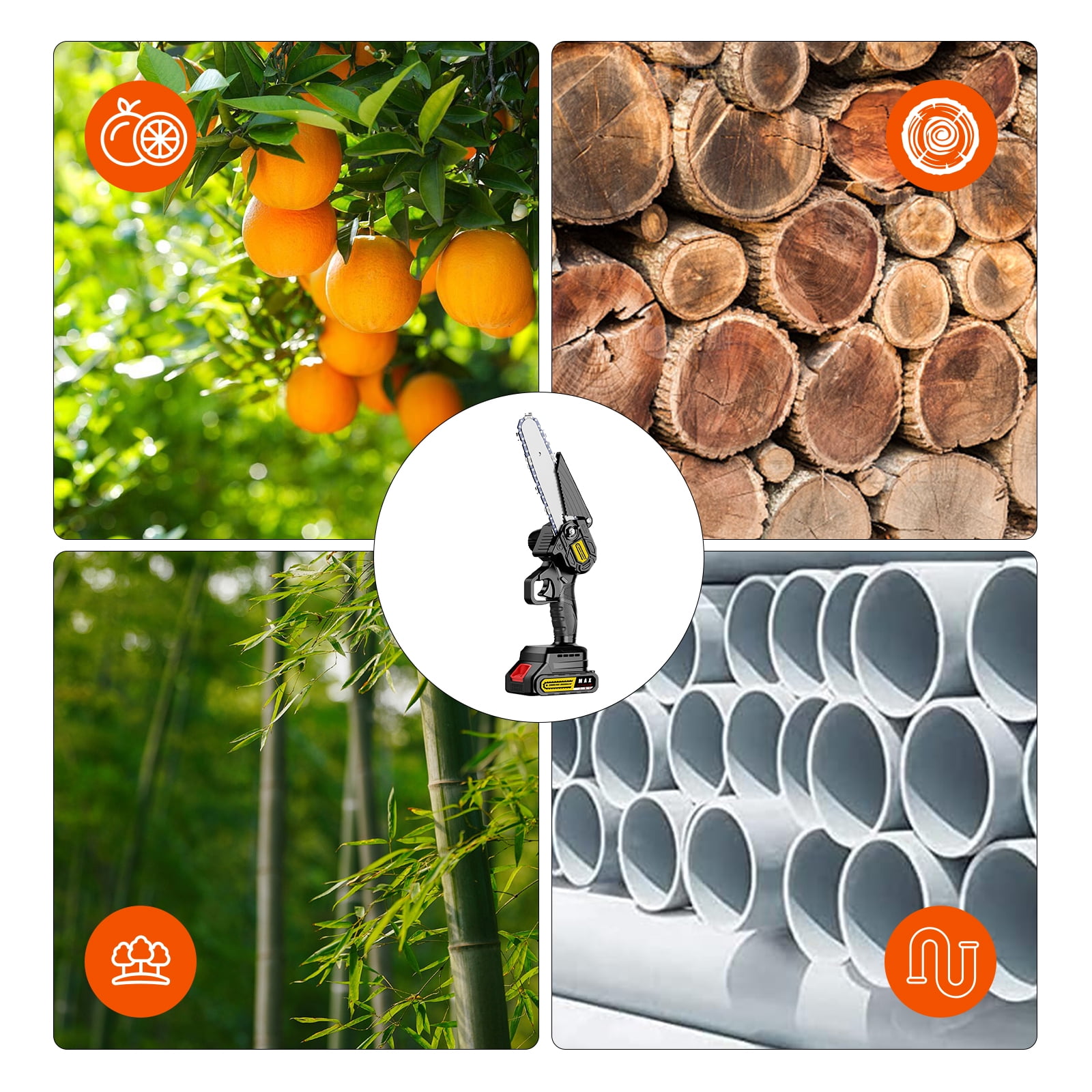 Mini Chainsaw Cordless Perfect Gift for Dad, Mom, Friends, Husband, DIYer GARDENING WORK EASIER Gardening Work Easier 24V 2000mAh large capacity batteries. Easy to Operat,Compact, handheld, comfortable to hold, and can be used for a long time without tiring your hands. Multiple Security Protection ①Switch lock ②Baffles prevent debris splash③Comes with goggles④Pairs of gloves⑤Built-in control circuit board⑥Overload protection⑦Overheats auto stop working. Security Lock prevent accidental activation You need to press the safety button and switch at the same time to start. The carrying case is perfect for storing all your accessories and is ideal for taking on the go. Wide Application: Mini chainsaw can be used for Forest cutting, cutting wood, pruning branches, gardening and so on. 6000rpm per minute that makes sure you can cut off the wood with 4in diameter easily. (the specific value varies with the actual size and hardness of the wood). widely used in gardens, farms, parks, forests, pastures, orchards, indoors, for all cutting needs.