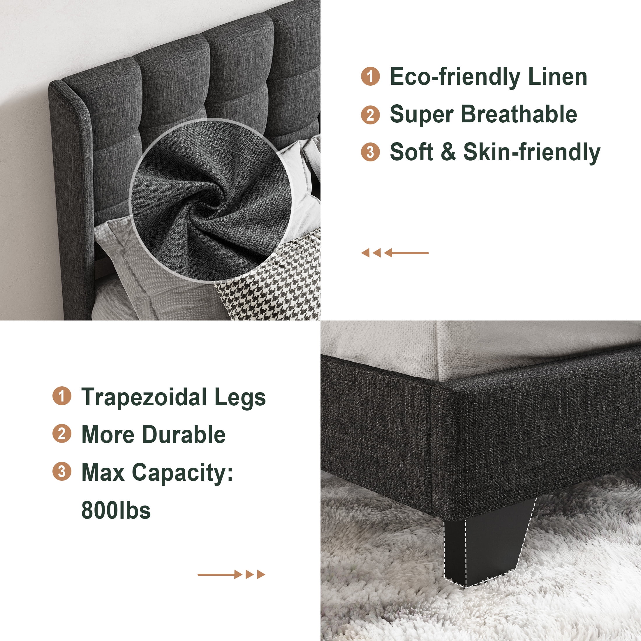 Features Wingback Headboard: This platform bed frame with headboard has a linen-inspired fabric finish with buttonless square tufting for a classy look. No Box Spring Needed: This platform bed includes a series of sturdy, evenly spaced slats that can support your existing mattress; no box springs are required. Easy Assembly: Smartly packaged in one carton for moving around easily. Only take 30 minutes to assemble even for a rookie. For All Kind of Mattress: spring, memory foam, latex, or hybrid mattress. The bed frame can support up to 800 lbs. Responsive Customer Service: Devoted to providing the best products and services for customers. Any concerns just contact us and we’ll respond ASAP. Specifications Available Size: Full / Queen / King Available Color: Dark Gray / Blue Full-Size Dimensions: 56.6″ × 77.5″ × 43.7″ Queen-Size Dimensions: 62.5″× 83.0″ × 43.7″ King-Size Dimensions: 77.9″ × 83.0″× 43.7″ Package Weight: 61.7 lbs / 70.5 lbs / 77.8 lbs Weight Capacity: 800 lbs Bed Material: Metal+Wood, 100% Polyester, Assemble Required Package Includes: Bed Frame, Wood Slats, Headboard Assembly Required: Yes Explore More for Amolife products
