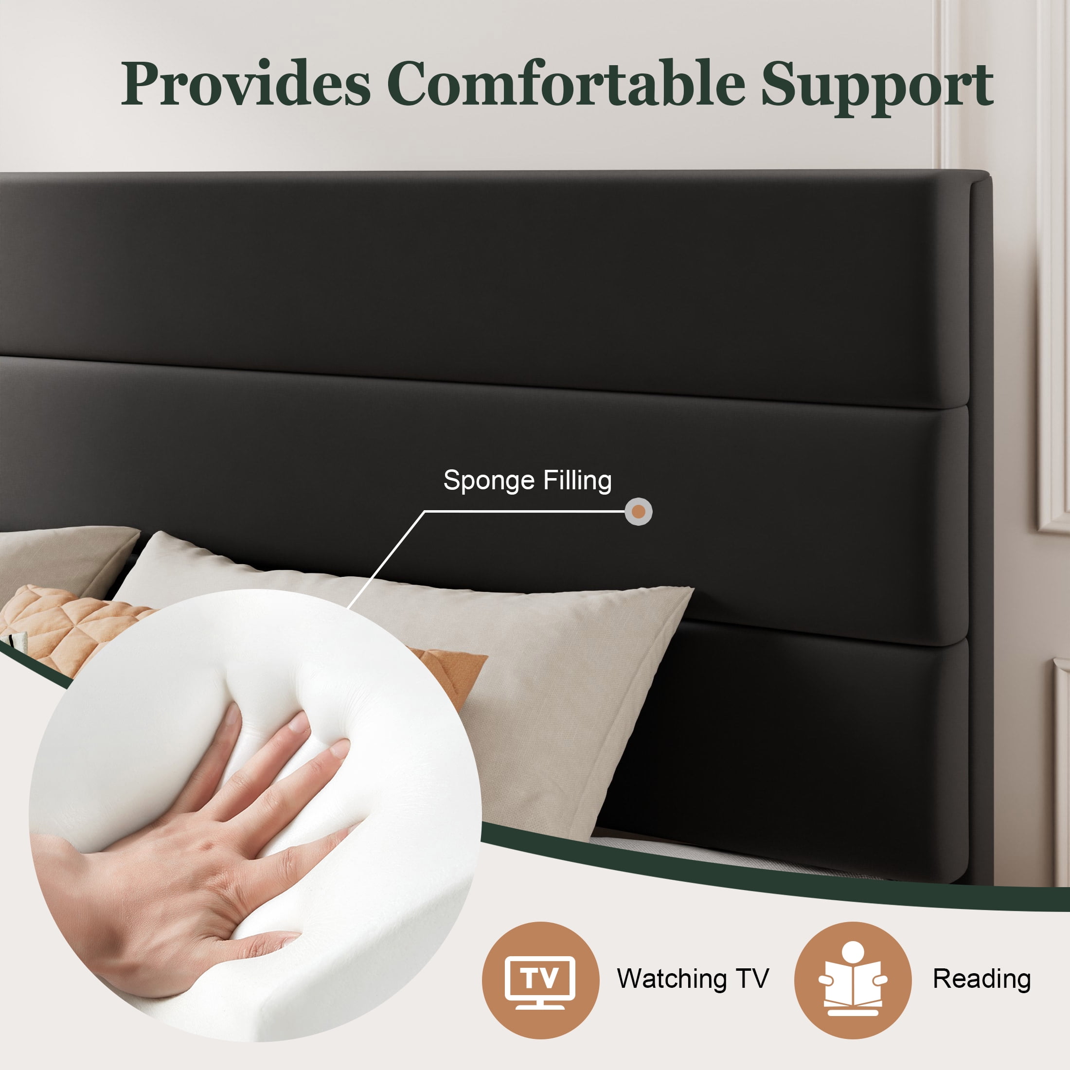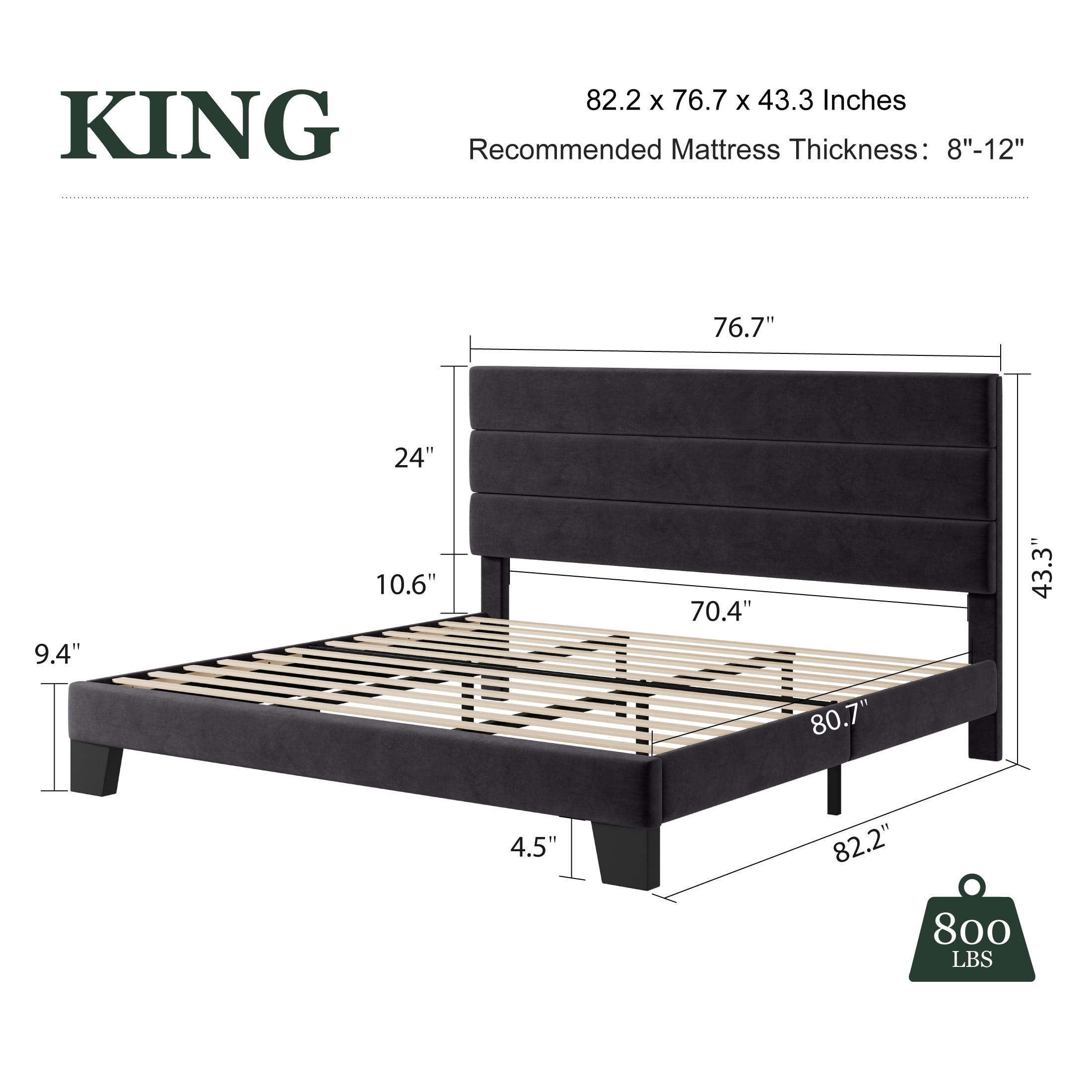 Features: Available in two materials: classic fabric and luxury velvet 4.5″ space under the bed for easy cleaning Upholstered is made of environmentally friendly sponge EVA sponge ensures no noise when turning over Widened and thickened bed legs make it more stable Maximum weight capacity up to 800 lbs Contains instructions and all necessary tools All parts are packed in individual bags for protection High-density and high-quality slats are more sturdy Upgraded metal frame for greater durability Whether to use a box spring is up to you Velcro design on slats for easy assembly Anti-insect and odor-free Unlock More for Amolife products Specification: Color Available: Navy Blue / Dark Grey / Black / Beige Material: Linen Fabric & Metal &Wood Size Available: Full / Queen / King Weight Capacity: 800 lbs Package Weight: 63.1 / 67.5 / 80.9 lbs Assembly Required: Yes Package Included: Bed frame (with Accessories) &Headboard & User Manual Dimensions: Full Size: 76.7 x 54.7 x 43.3in Queen Size: 82.2 x 60.6 x 43.3in King Size: 82.2 x 76.7 x 43.3in