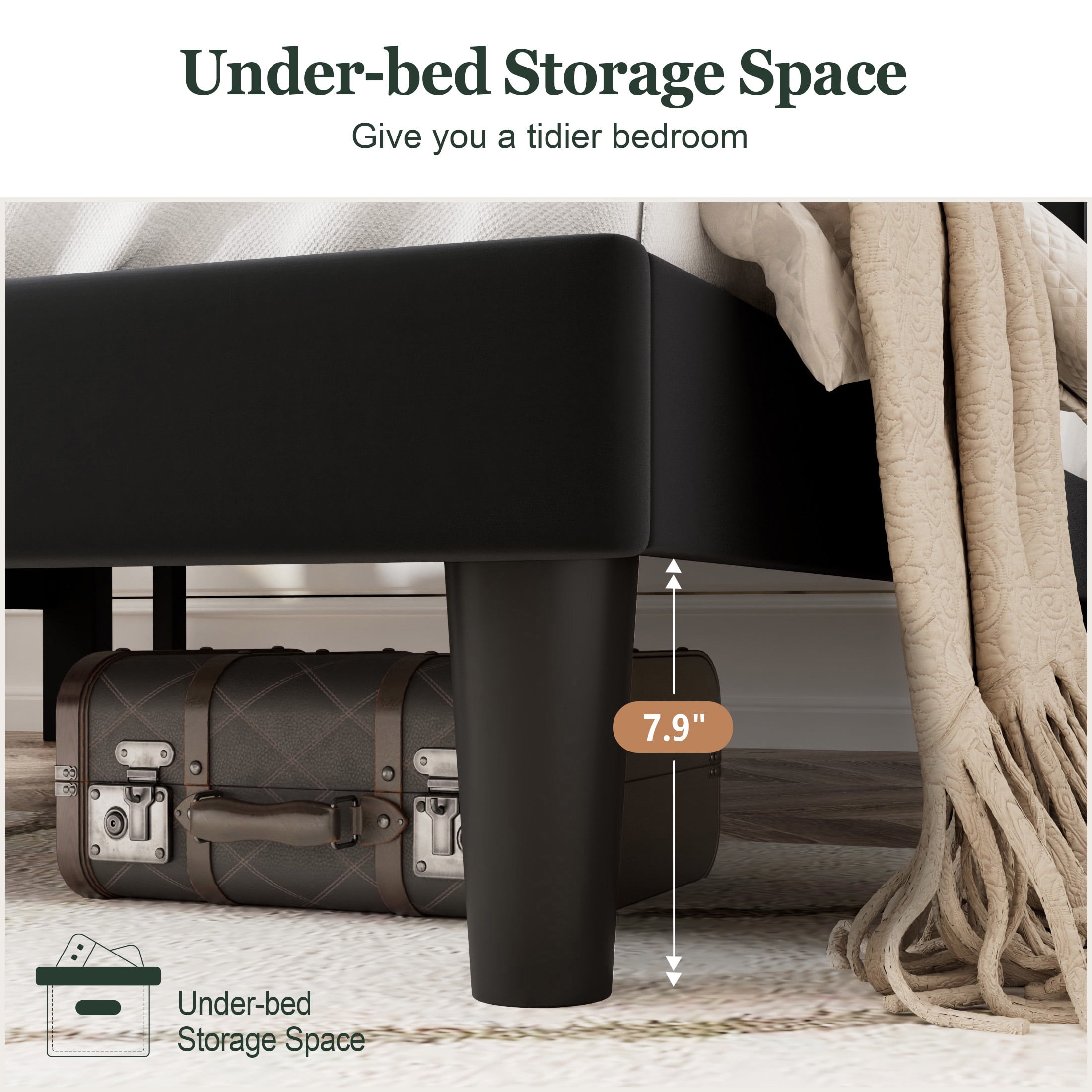 Features: Sophisticated Design: Upholstered platform bed frame with vertical channel tufted velvet headboard. The tufting creates a visually appealing texture and adds a touch of elegance to the overall design. Adjustable Headboard: You can customize the height of the headboard to your liking, which is especially useful if you have a specific preference or want to accommodate different mattress thicknesses. Adequate Storage Space: The 7.9” ample storage space can accommodate multiple storage boxes, giving you a clean and tidy bedroom in minutes. No Box Springs Needed: The bed frame is a platform bed frame that provides a strong and stable foundation for your mattress. It eliminates the need for box springs, making it a sleek and modern choice for your bedroom. Easy to Assemble: Instructions and assembly tools are included in the box. Generally, it takes an hour to an hour and a half to complete the assembly. Specifications: Size Available: Full / Queen / King Color Available: Black / Dark Blue / Off-White / Pink / Green / Lake Blue Material: Velvet & Metal & Wood Max Weight Capacity: 800 lbs Product Weight: 58.86 / 65.48 / 75.18 lbs Package Weight: 65.92 / 72.75 / 84.88 lbs Recommended Mattress Height: 8-14” Box Spring Required: No Assembly Required: Yes Package Content: Bed frame, Headboard, Slats, Assembly tools, Instruction (Mattress not included) Dimensions: Full Size: 78.5 x 56.1 x 47/51 in Queen Size: 83.3 x 62.4 x 47/51 in King Size: 83.3 x 78.1 x 47/51 in Explore More for Amolife products