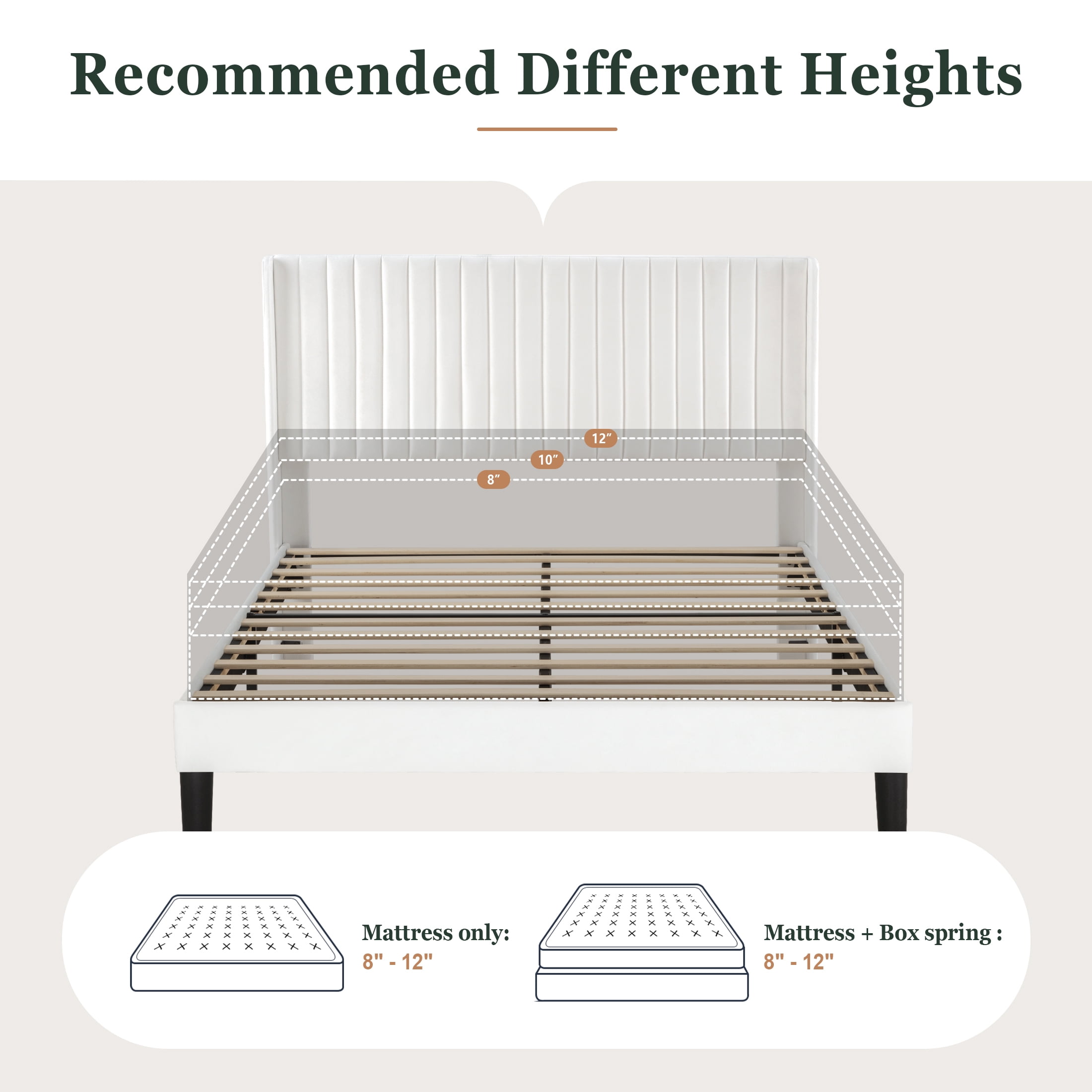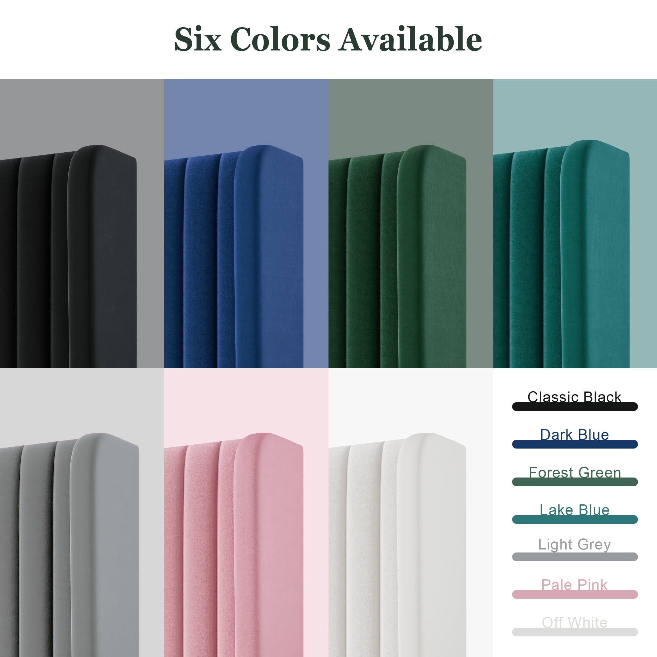 Features Elegant Design: The Velvet Vertical Stripe Upholstered Bed Frame exudes sophistication with its timeless vertical stripe pattern. The luxurious velvet material not only adds a touch of opulence but also offers a comfortable and plush feel, ensuring a restful night’s sleep. Wingback Headboard: The bed frame boasts a distinctive wingback headboard design, providing both style and functionality. This unique feature offers additional support for leaning back while reading or relaxing in bed, enhancing overall comfort and aesthetic appeal. Sturdy Contruction: Supported by strong closely spaced wood slats, The post-style legs provide stability and structure, making you sleep well. No Box Spring Required: This platform-style bed includes a series of durable, evenly-spaced slats designed to support your existing mattress directly; no box spring is required. Easy Assembly: All parts for making the bed are located in one box, Assembles easily in 30 minutes. Specification Color Available: Black / Dark Blue / Off-White / Pink / Green / Lake Blue Size Available: Full / Queen / King Material: Velvet & Metal & Wood Max Capacity: 800lbs Full Size: 78.4 x 56.1 x 47 in Queen Size: 83.3 x 62.4 x 47 in King Size: 83.3 × 78.1 × 47 in Product Weight: 30.60 / 49.16 / 52.69 lbs Package Weight: 70.55 / 72.97 / 88.18 lbs Recommend Height of Mattress: 8~12 in Box Spring Required: No Assembly Required: Yes Package Content: Bed frame, Metal, Slats (Mattress not included) Explore More for Amolife products
