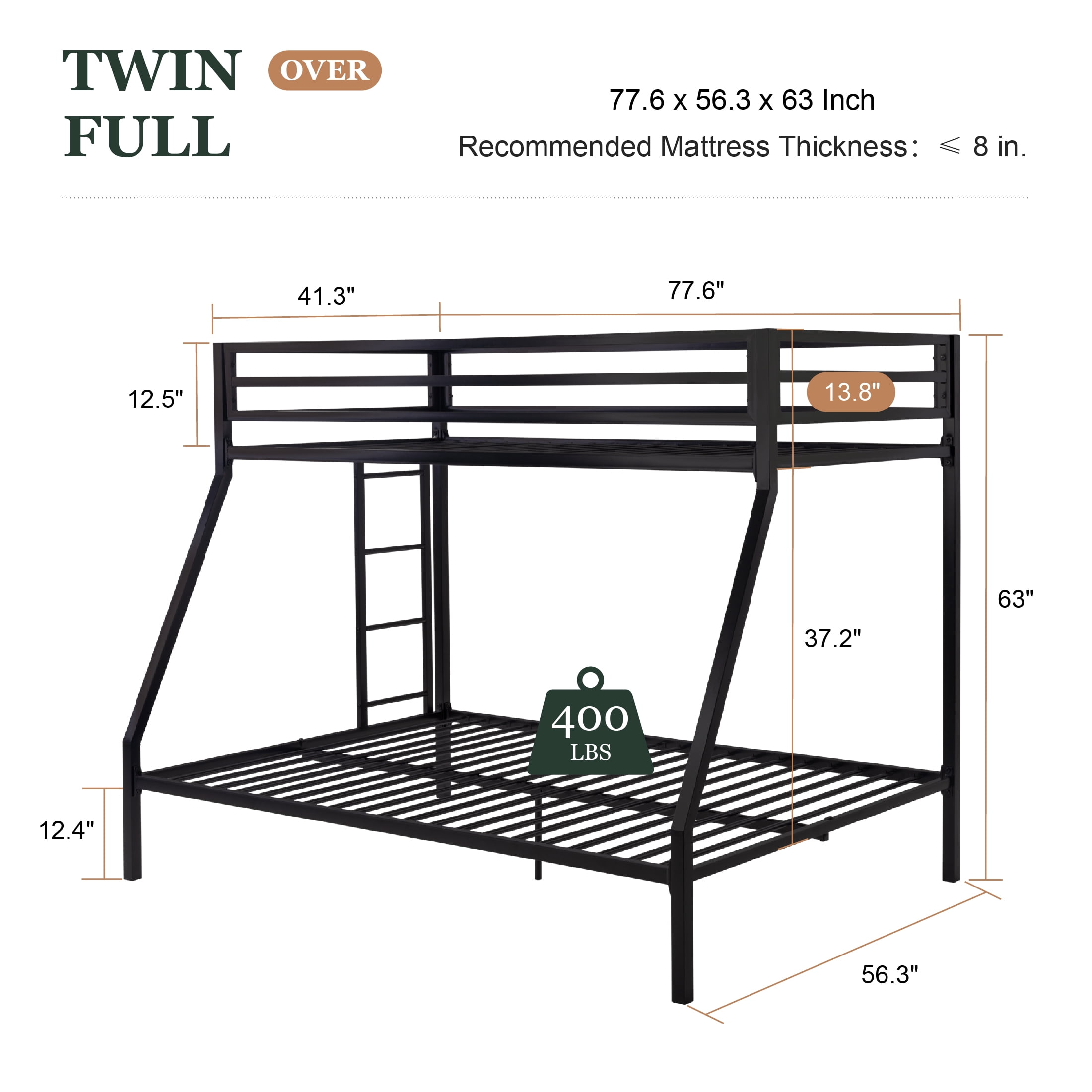 Features: BEST DESIGN&STURDY FRAME: Our bed frame with square design. The high-quality metal bed frame could afford total 800 lbs and no sagging or shaking, could serve your family for years. REMOVABLE LADDER: The ladder is flexible to assemble, you can set up it on either side. NOISE FREE: We provide the plastic buckle design install the slats to prevent noise. Foot plugs added to the bottom of the bed feet will never scratch your beloved floor. ENOUGH STORAGE SPACE: The bed frame stands 11 inch off the floor for easy storage. You could put some storage boxes under the bed to tidy your clothes, toys or quilts. BEST SERVICE: If there is any problem, please contact us and we will provide the support within 24 hours. Specification: Available Color: Black | White Size: Twin-over-Full Brand: Amolife Material: Metal Dimensions: 77.60 x 56.30 x 63.00 Inches The weight capacity: 800 lbs ( Twin: 400 lbs, Full: 400 lbs) Assembled Product Weight: 100.3 lb Package Content: Bed frame, Slats, Hardware, Clear Instruction (Mattress not included) Additional Feature: Easy assembly, Easy to clean