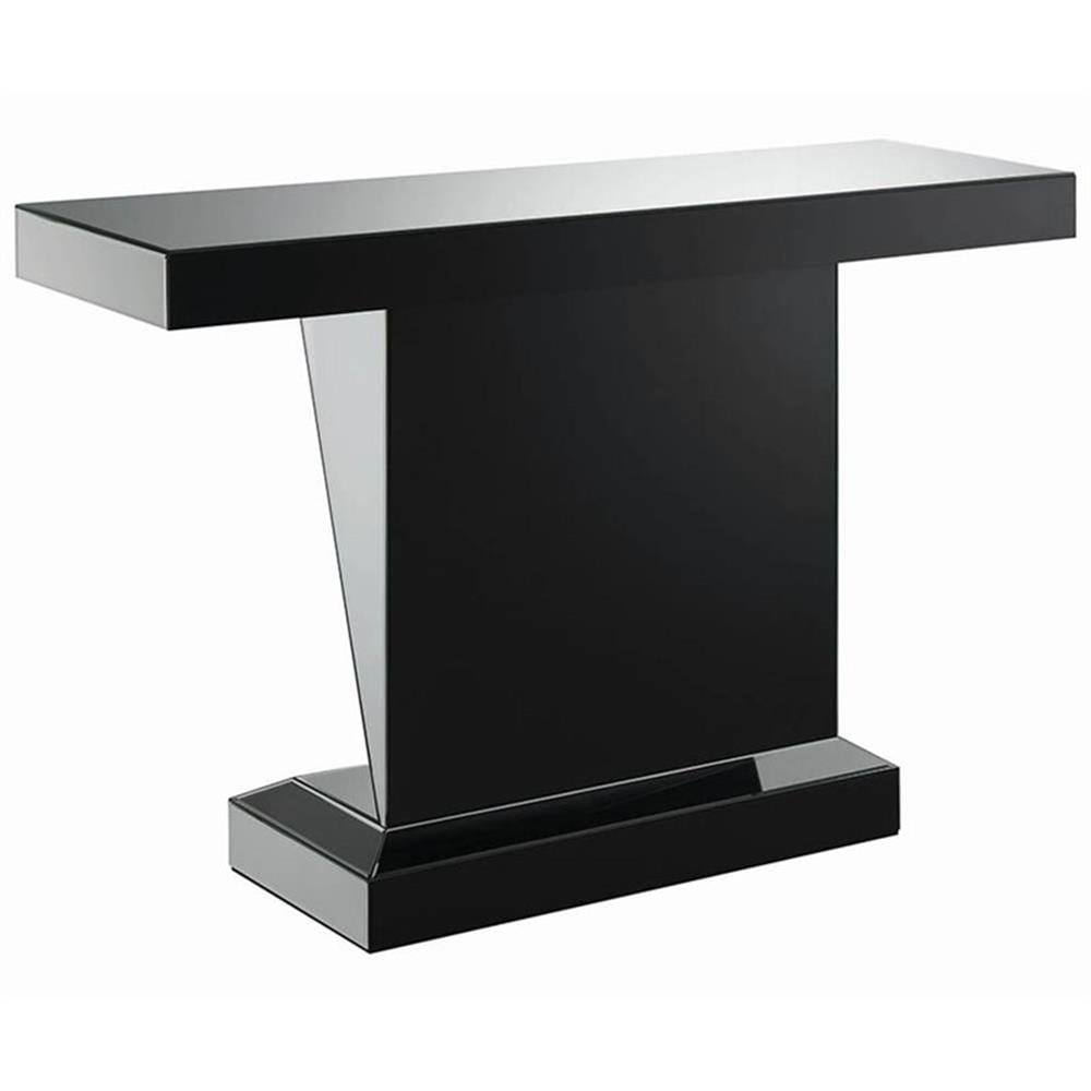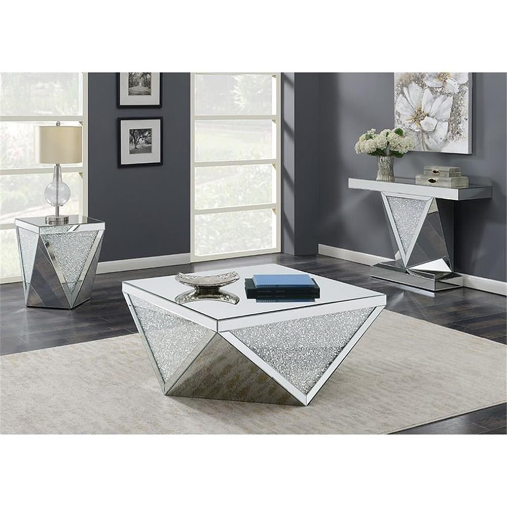 Includes: One (1) sofa table Glitter-infused, contemporary style occasional table set Bold, modern triangle design Sparkling encrusted crystals Unique triangle detailing with encrusted crystals Overall Sofa Table:31.5″ H x 47.25″ W x 13.75″ D Overall Sofa Table Weight:66 lb. Furniture Finish:Other Color Pattern:Solid Style Name:Contemporary