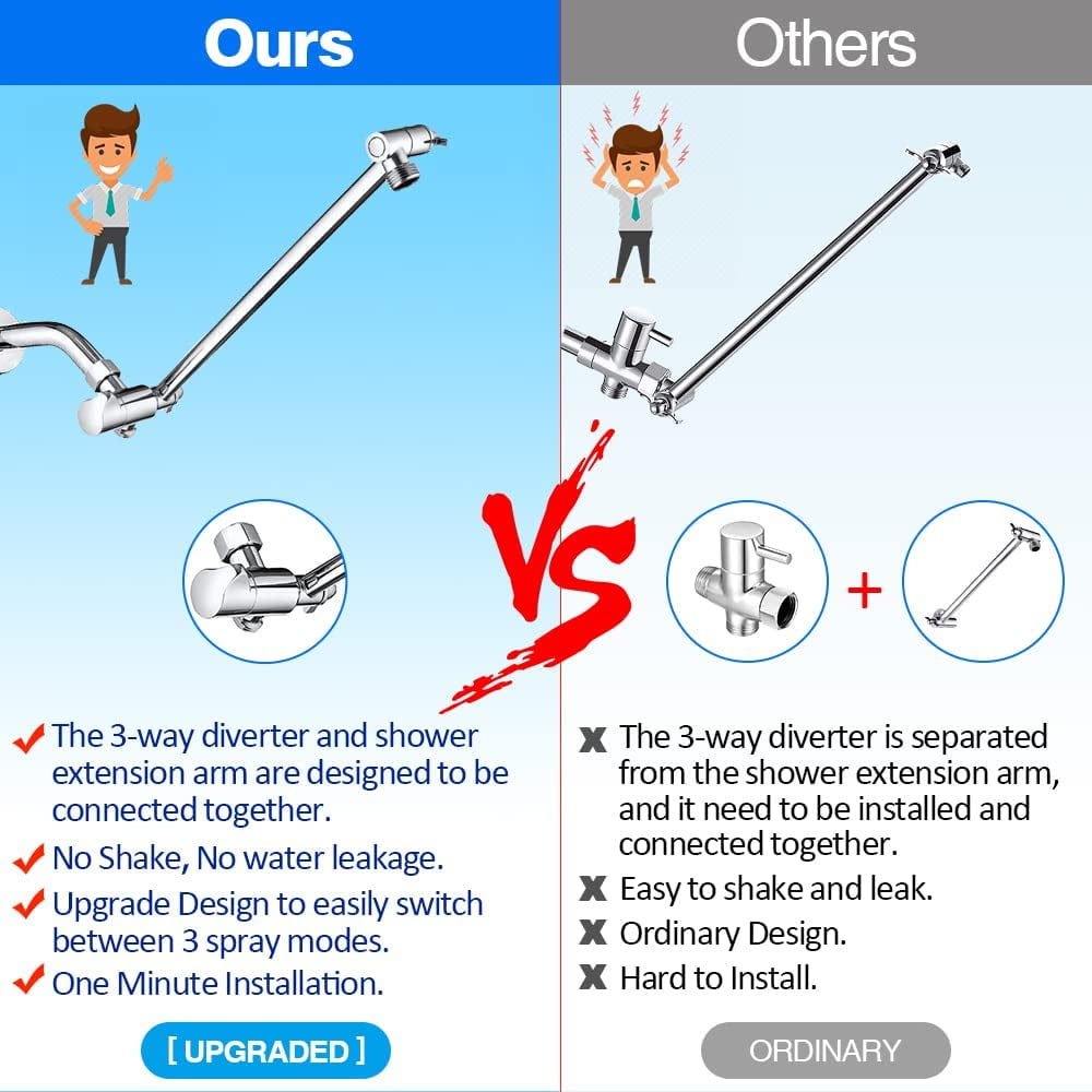 High Pressure 5-Setting 3-Way showerheads & handheld showers combo with 12” shower head extension arm, and 12 inch large square rain shower head, waterfall full body coverage, which offers you the Ultimate Shower Experience! This shower head combo is very easy to install, no need to call a plumber.