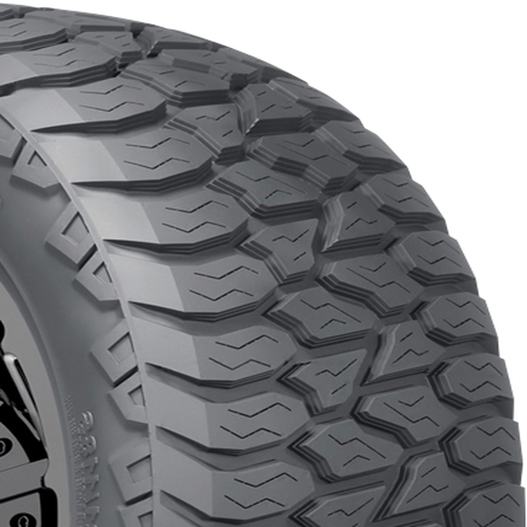 The AMP Terrain Attack A/T tire is an aggressive all terrain tire that provides good on road driving manners, allowing you to get the traction you need for all the terrains you travel on, without sacrificing your daily on road driving comfort. The unique multi block tread pattern delivers smooth on road driving and the stepped side design on the tread blocks enhances off road traction. The outer edge, curved tread design is specifically for added traction in loose terrains, gravel and sand. The zig-zag siping on all tread block give you grip in all road conditions including wet and snow covered roads. Deep tread and wide channels allow water, mud, slush and slurry to quickly evacuate from the tire keeping consistent contact with the road surface. The varying pattern dual sidewall lugs offer improved traction in any road or weather condition, and strength and stability to the tire. The advanced tread compounds prevent chips and cuts, prolonging the life of the tire.