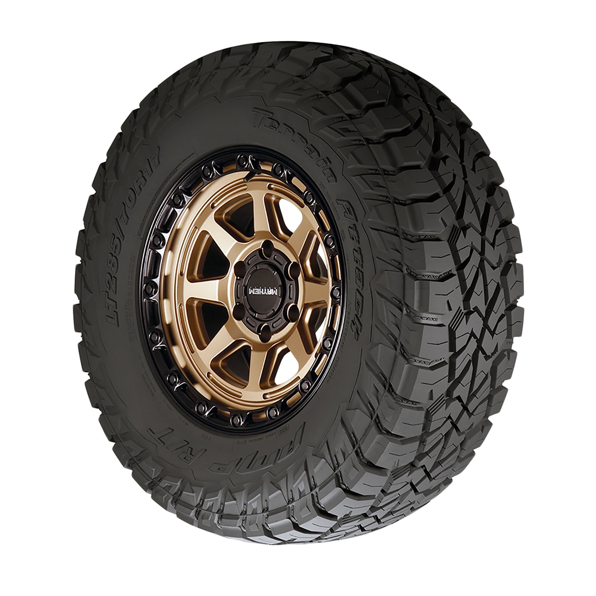 Amp Terrain Attack R/T LT285/70R17 116/113Q C OVERVIEW Designed for a great balance of off-road performance and smooth highway characteristics, the Terrain Attack R/T from AMP features a rugged terrain pattern with an innovative multi-block design for stable control and traction on a variety of terrains. Staggered tread blocks enhance traction in mud, loose dirt, and sand, and an alternating pattern of lugs that extend from shoulder down onto the sidewall boost lateral traction for clawing out of ruts. Additionally, the Terrain Attack R/T is covered by a 40,000 mile limited manufacturer tread life warranty.