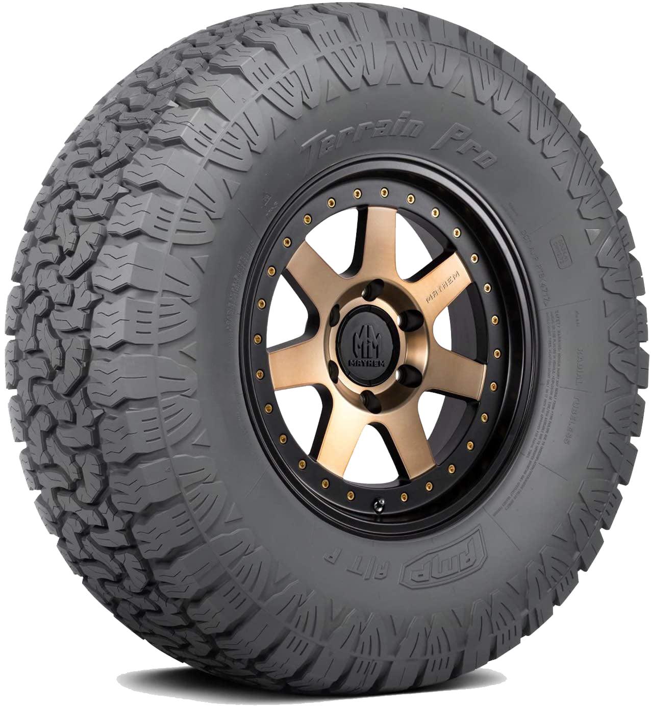 The AMP Terrain Pro A/T P is an all terrain, all season tire manufactured for light trucks. AMP offers a 60,000 mile treadwear warranty with this model.