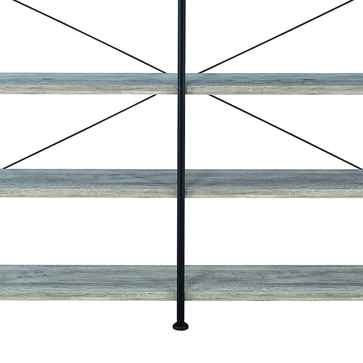 63 Inch Industrial 4 Tier Bookshelf, Particleboard, Metal Frame, Gray, Black- Saltoro Sherpi A unique blend of style and sophistication, this handcrafted bookshelf makes a perfect fit for your living room, foyer, office, or study space. With its four-tier shelving space to keep your books organized, it also offers plenty of space to showcase your hand-curated decorations, vases, showpieces, and more. Crafted from premium quality particleboard and a lightweight yet sturdy iron frame, the gray shelves complement the black powder-coated frame. With an X-shaped bar accents on the back, it is equipped with floor protectors to prevent abrasions and scratches.