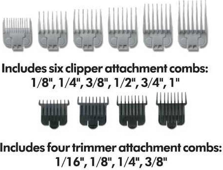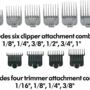 – 6-clipper attachment combs: 1/8″, 1/4″, 3/8″, 1/2″, 3/4″, and 1″