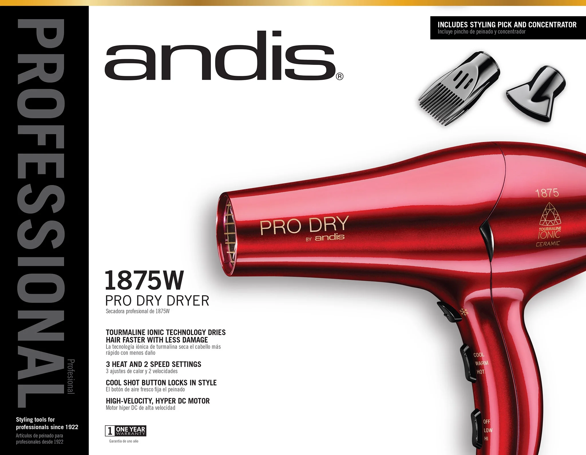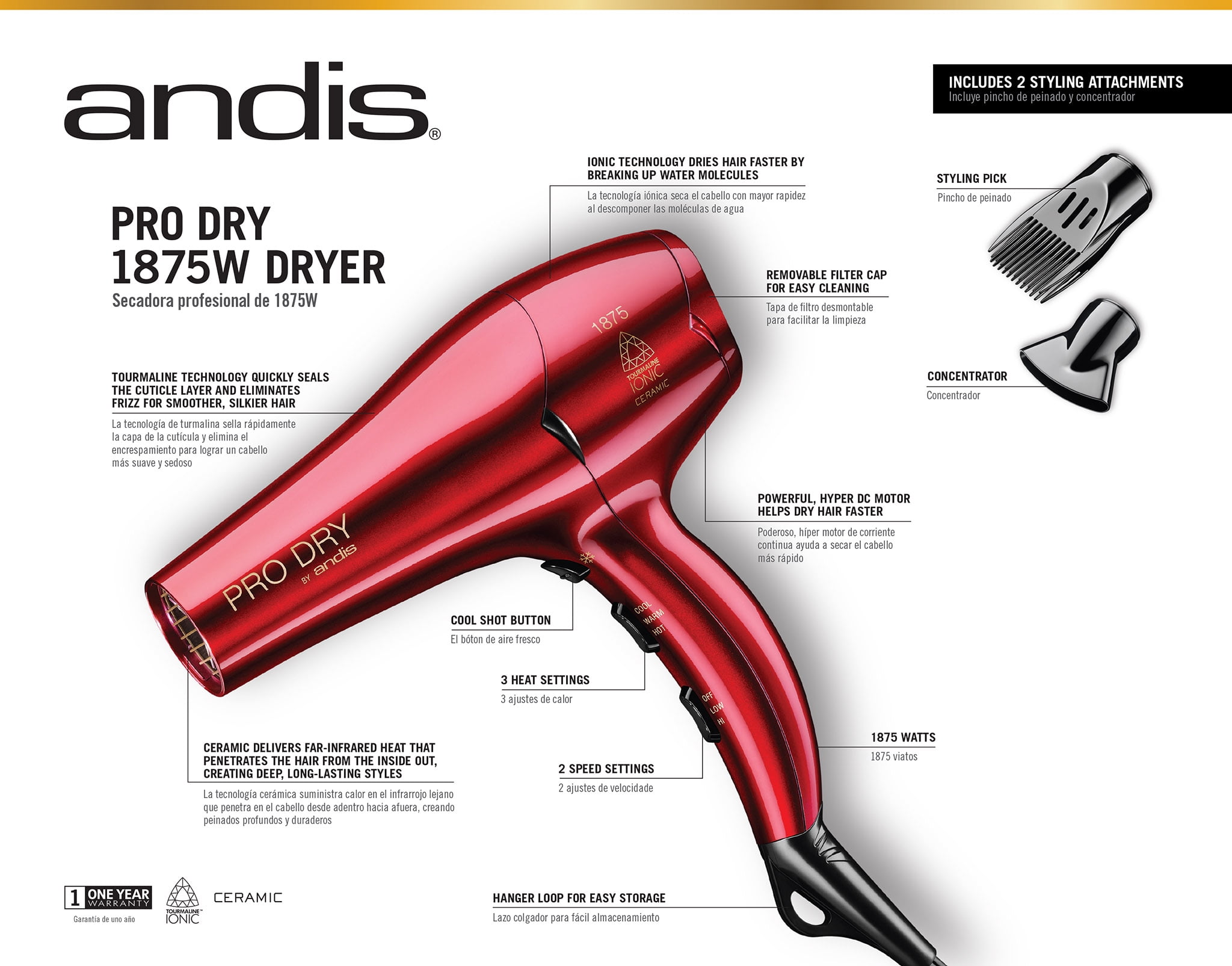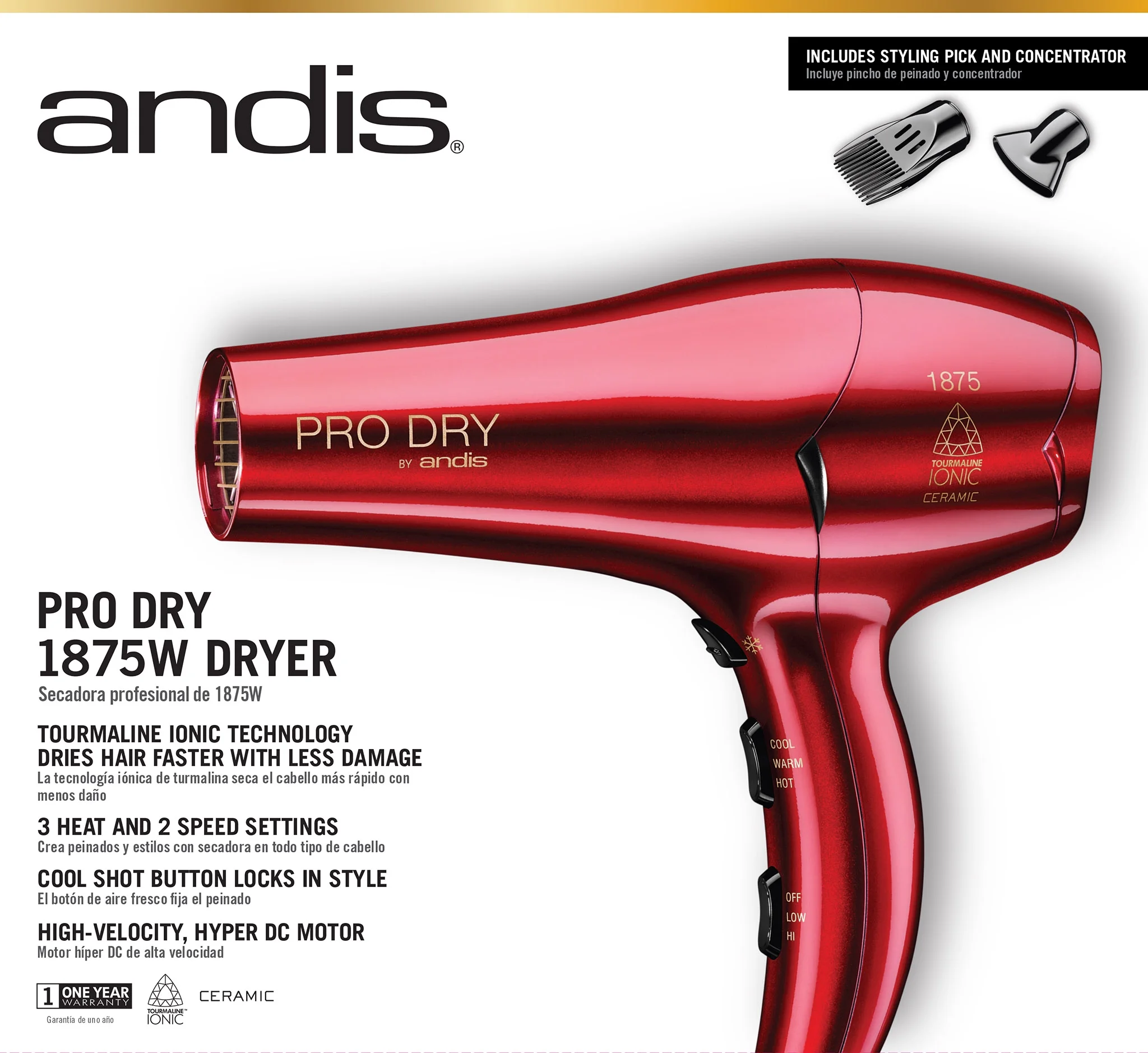 Andis Pro Dry Tourmaline Ceramic Hair Dryer with Pick and Concentrator, Ionic, 1875 Watts, Red Tourmaline ionic technology dries hair faster with less damage 3 Heat/2 speed settings with cool-shot button Lightweight, high-velocity hyper DC motor dries hair fast Includes snap-on concentrator and styling pick – won’t fall off Removable filter cap for easy cleaning