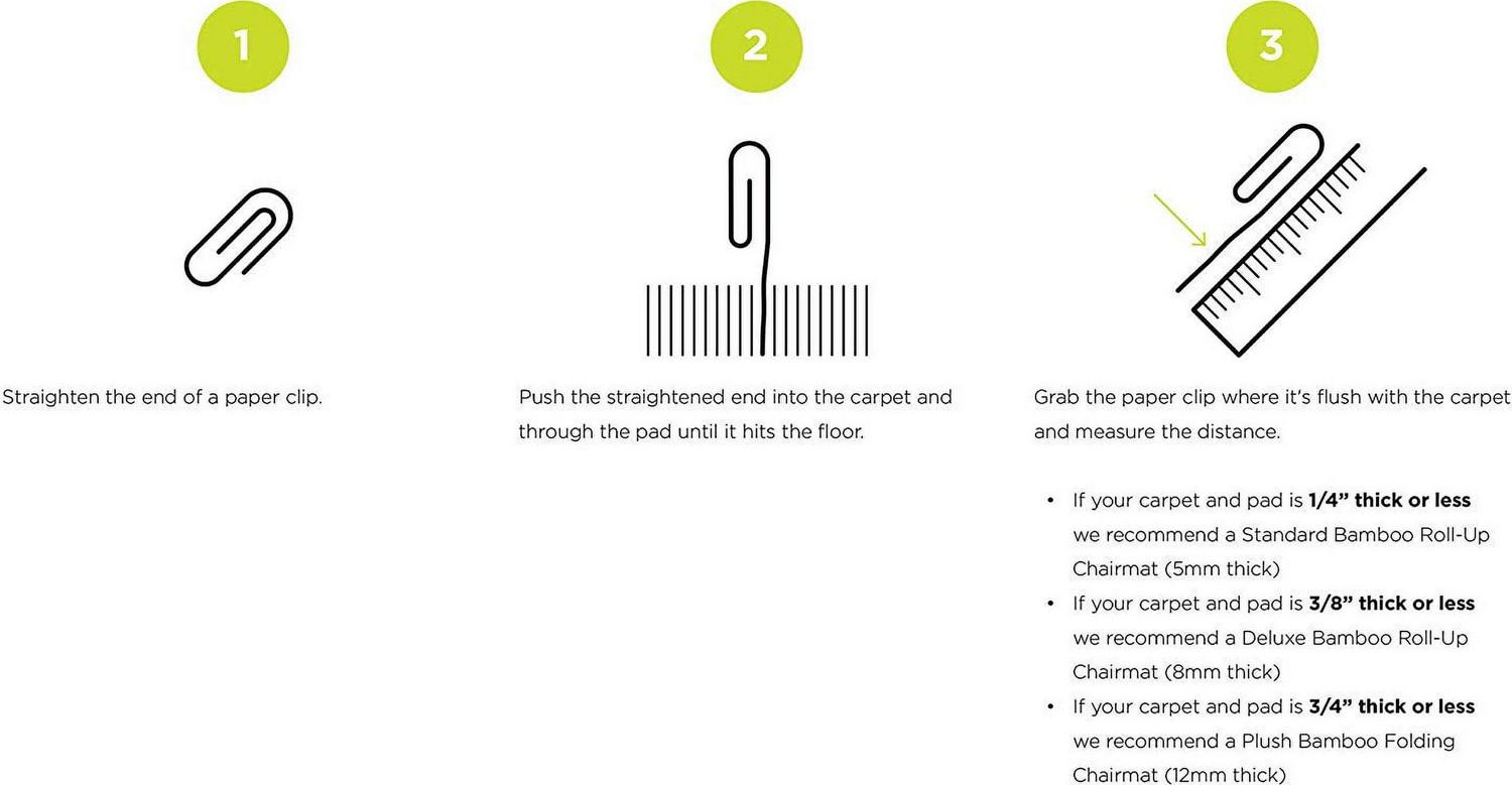 Made from 100% Moso bamboo; Handmade; Felt backing with non-slip gripper dots keeps mat in place; 5mm thick; Designed for Commercial carpet (up to 1/4″ thick, no carpet pad) and hard floors; 2″ wide slats Rounded edges for easy access on and off the mat; Rolls up for easy shipping and portability; Finished with premium, eco-friendly, UV-cured coating for ultimate protection; Hard floor casters are recommended for optimum performance; Kiln-dried to the optimum moisture content to minimize cracking and warping