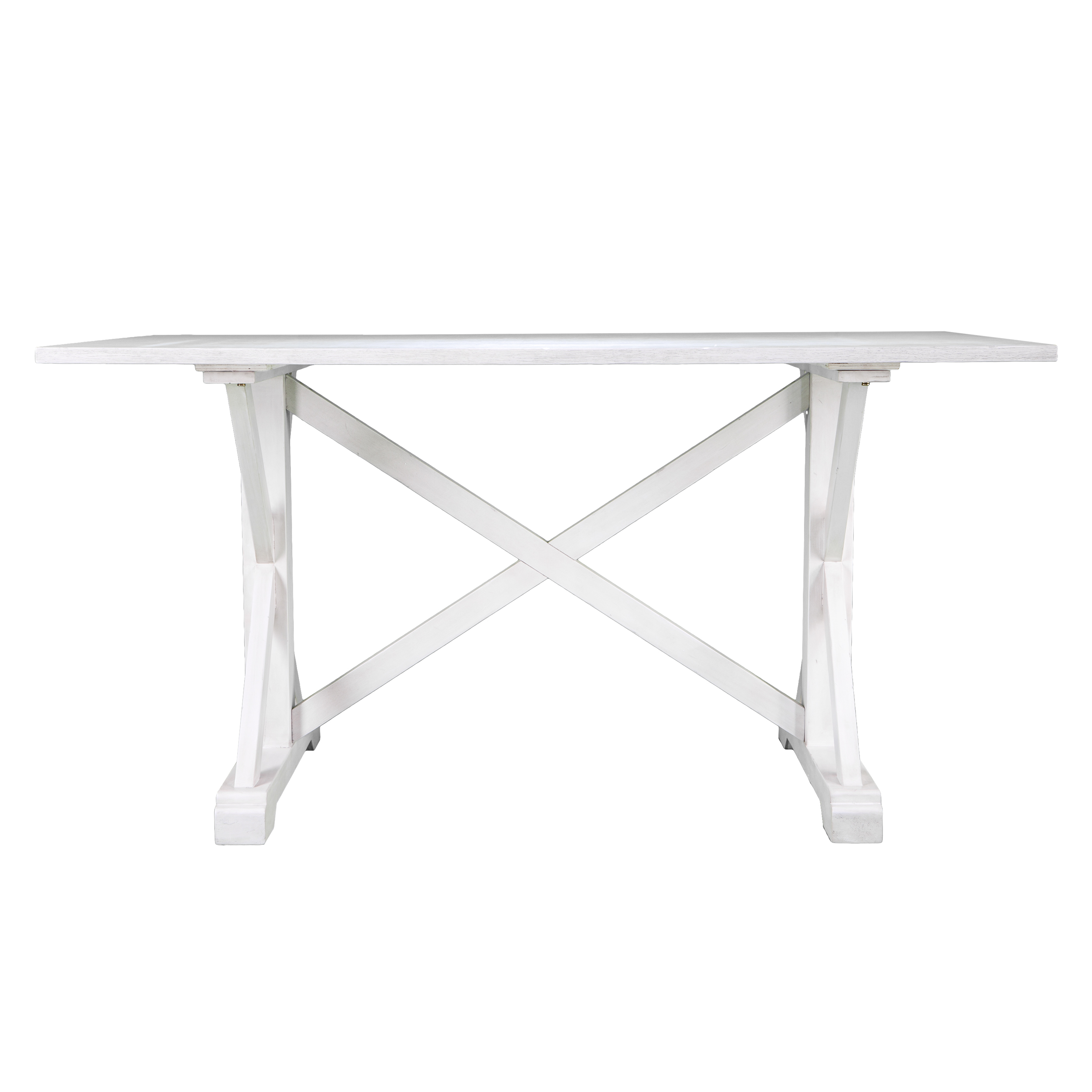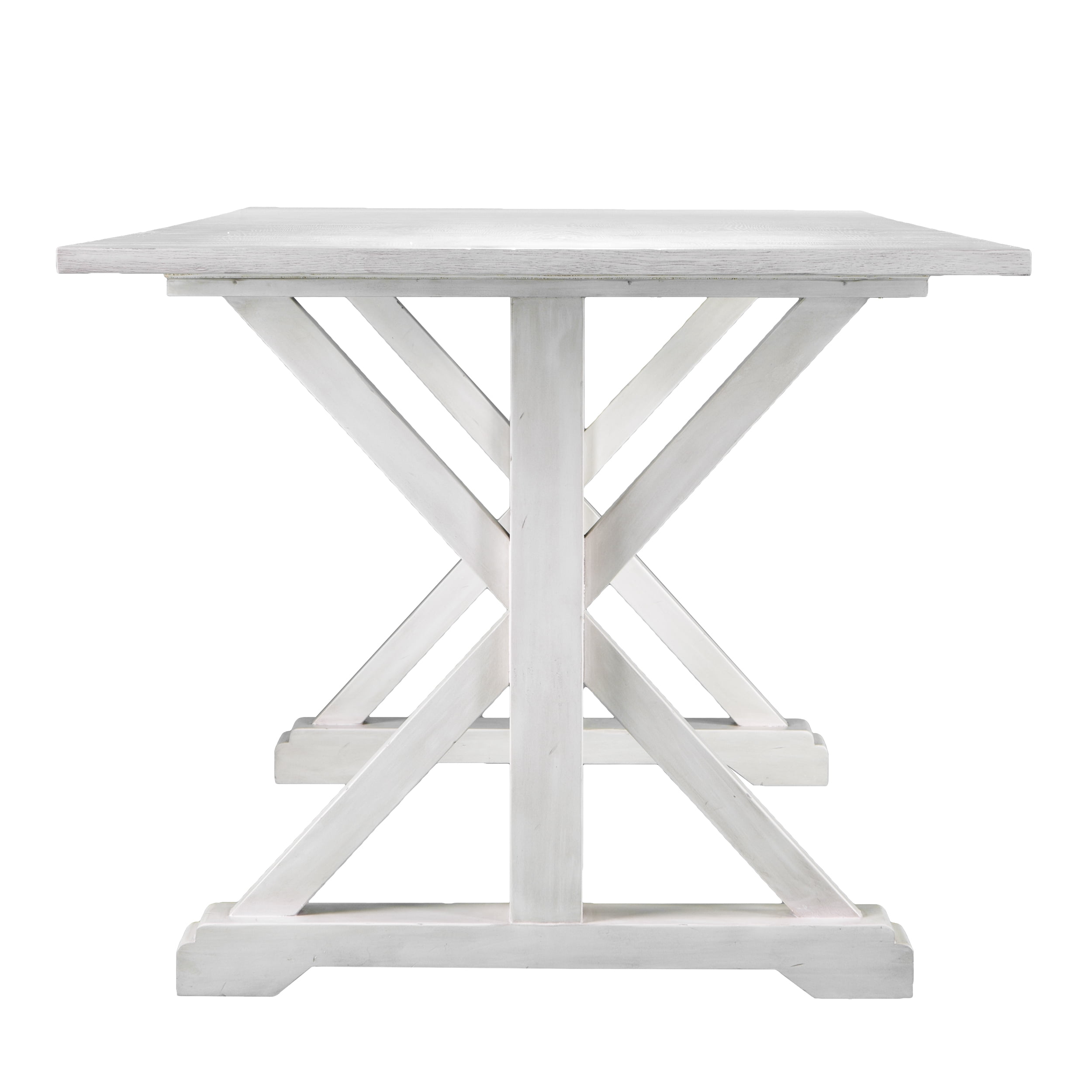 Farm to table takes on a whole new meaning with this soft country dining table. Elegant, wood-grained tabletop rests upon X-frame legs and crisscross trestle. Distressed white finish highlights shabby chic influence. Nab the rustic look when you pair this farmhouse dining table with your favorite chairs or built-in seating in your eat-in kitchen, game room, or dining space. Distressing and wood grain will vary.
