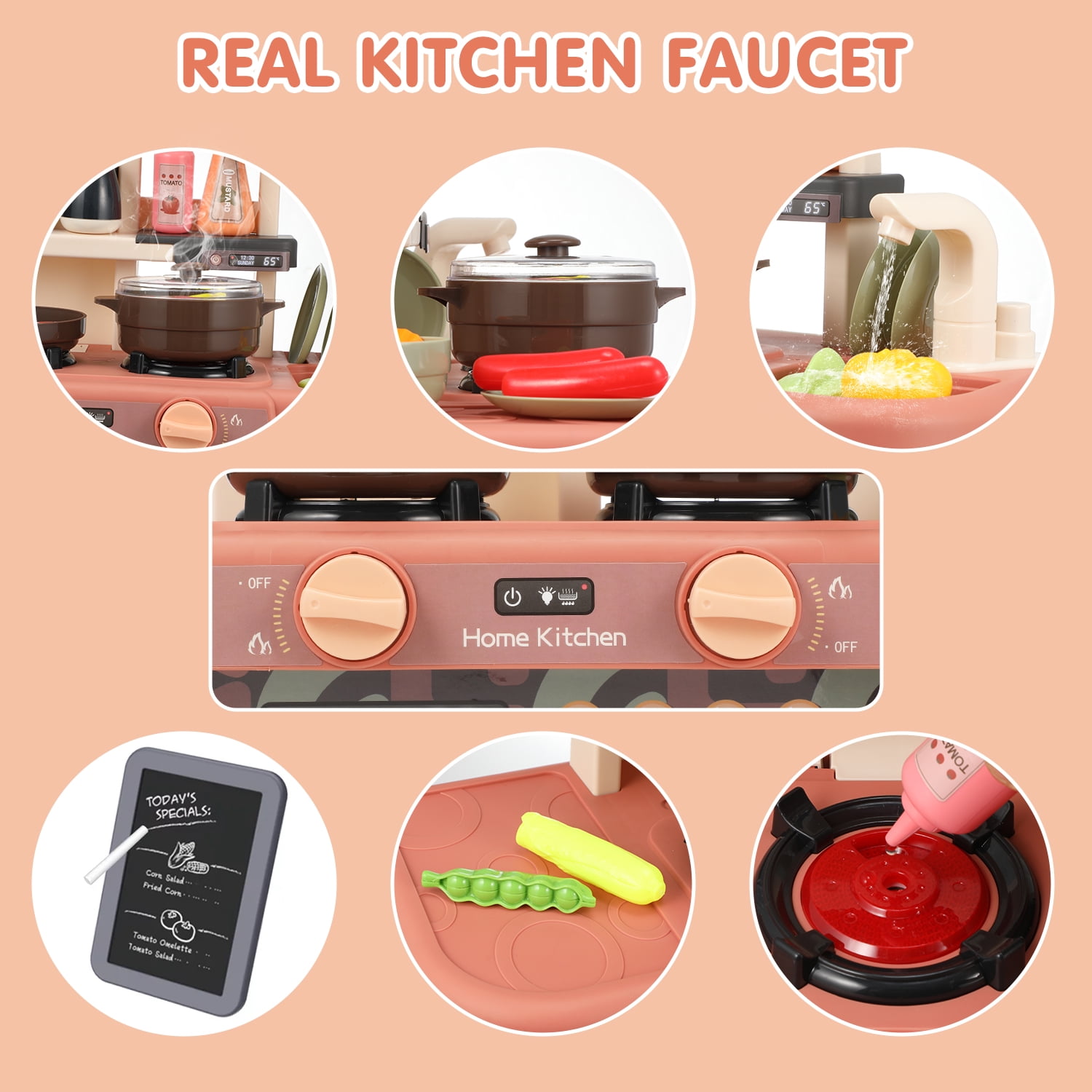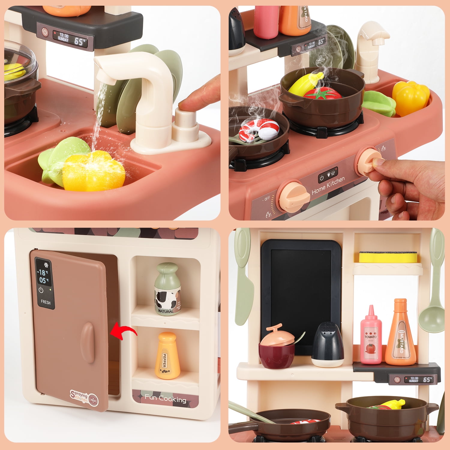 Anpro 25Inch Play Kitchen Set for Kids, 43PCS Pretend Kitchen Toy with Spray and Sink, Kitchen Cooking Set Toy for Boys and Girls, Brown