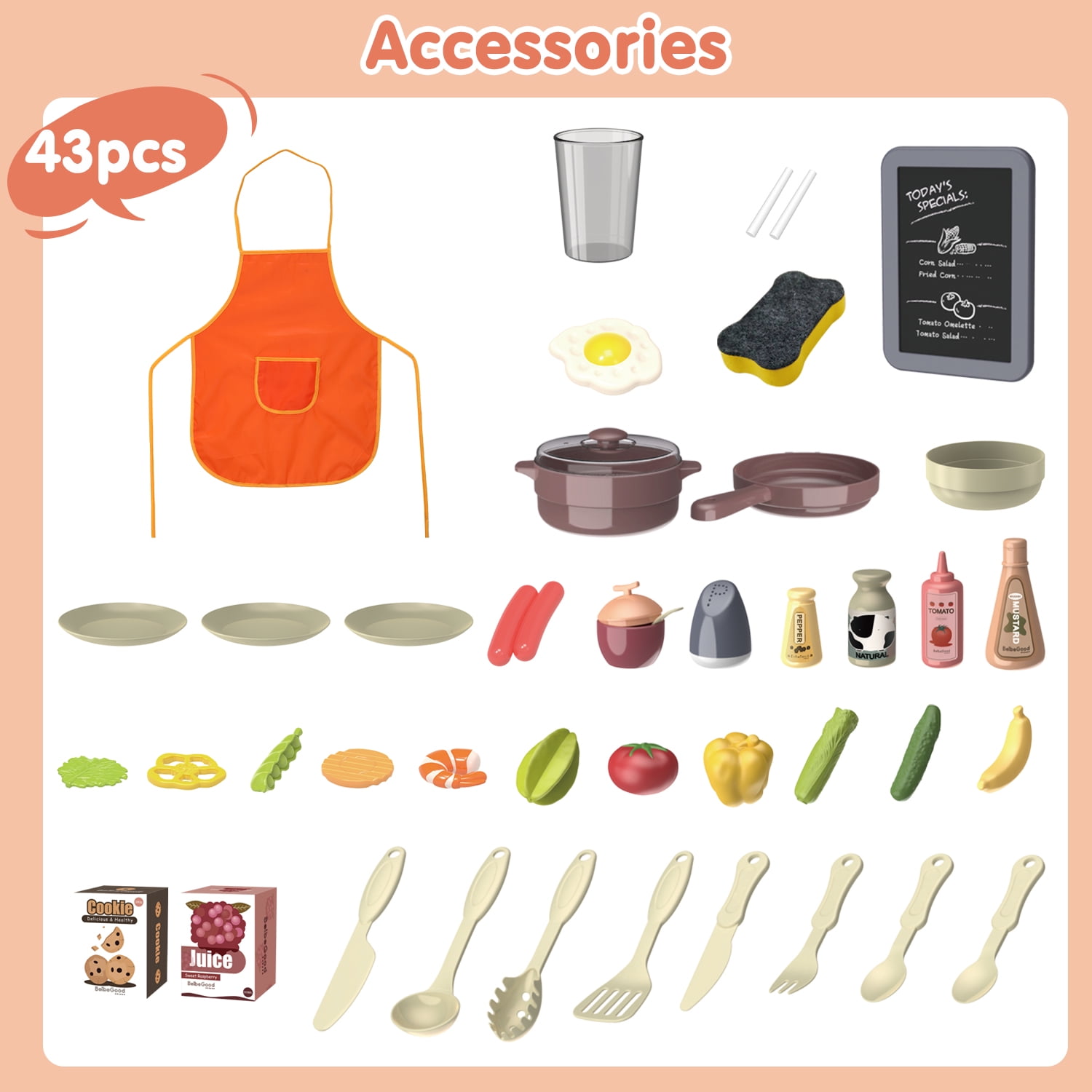 Anpro 43pcs Kitchen Toy Set is a multifunctional play kitchen that includes a toy sink, cooking playset with mini pot and pan, realistic lights and sounds, simulation spray, microwave oven, and other accessories, providing a complete and fun kitchen experience for children. Featuring a water circulation system, it allows kids to wash vegetables, fruits, and tableware, promoting cleanliness and organization skills. The set’s realistic sounds, lights, and steam effects enhance the play experience, helping children learn about food colors and names. Made of durable, non-toxic plastic, it includes a mini blackboard for added educational value. This playset is an ideal gift for Christmas, birthdays, and other occasions, fostering imaginative play and early learning in kids aged 3 and up!