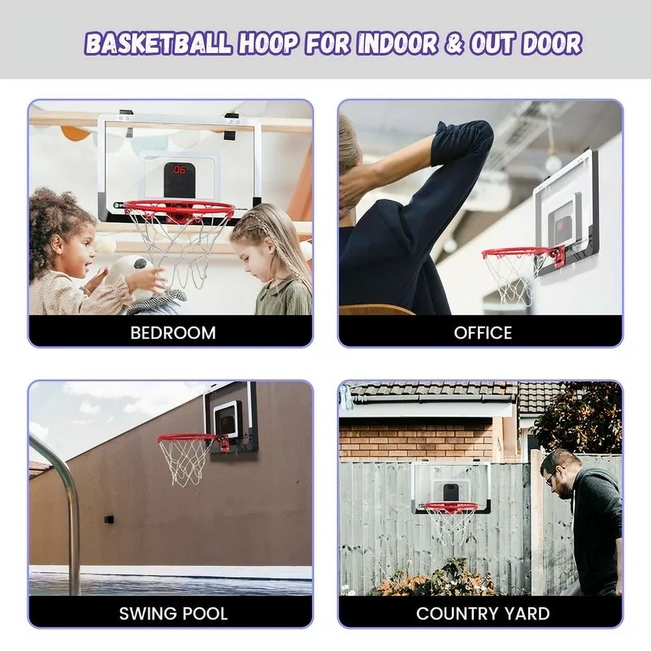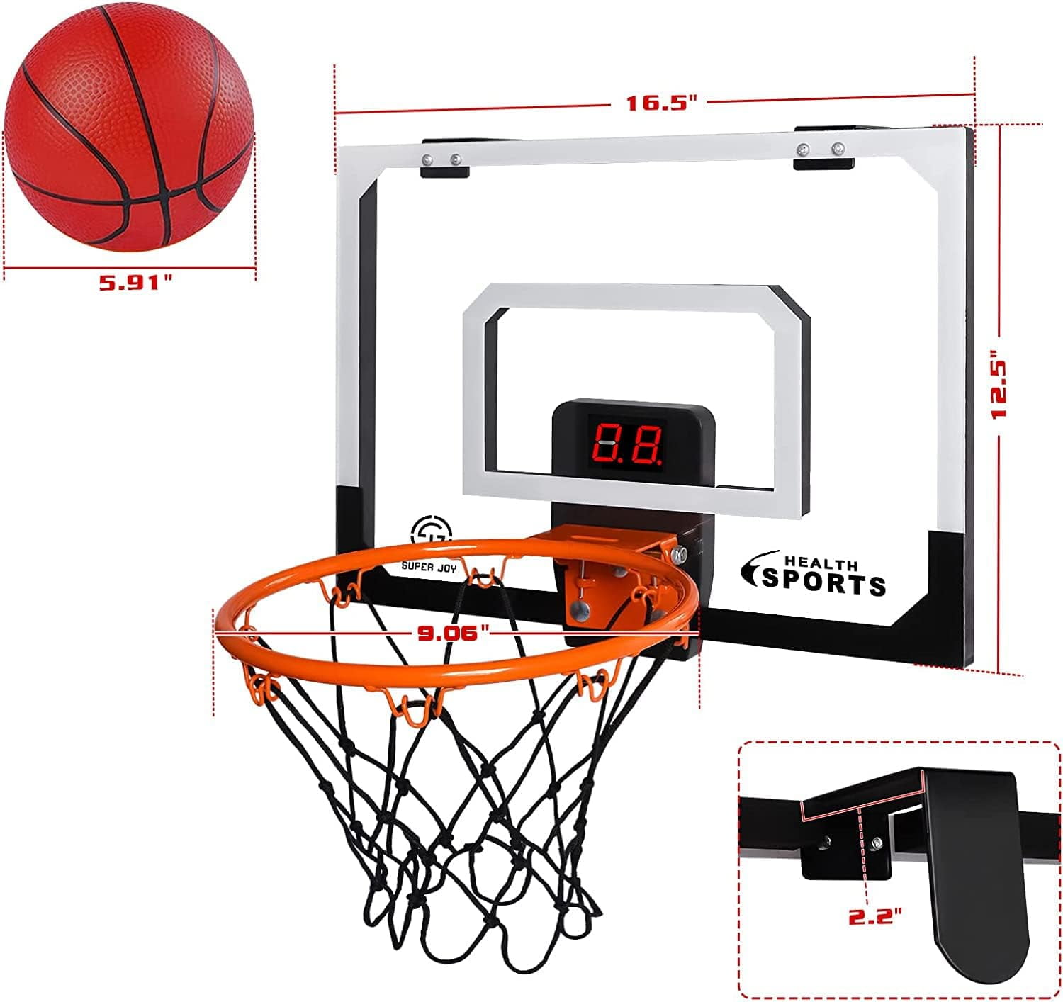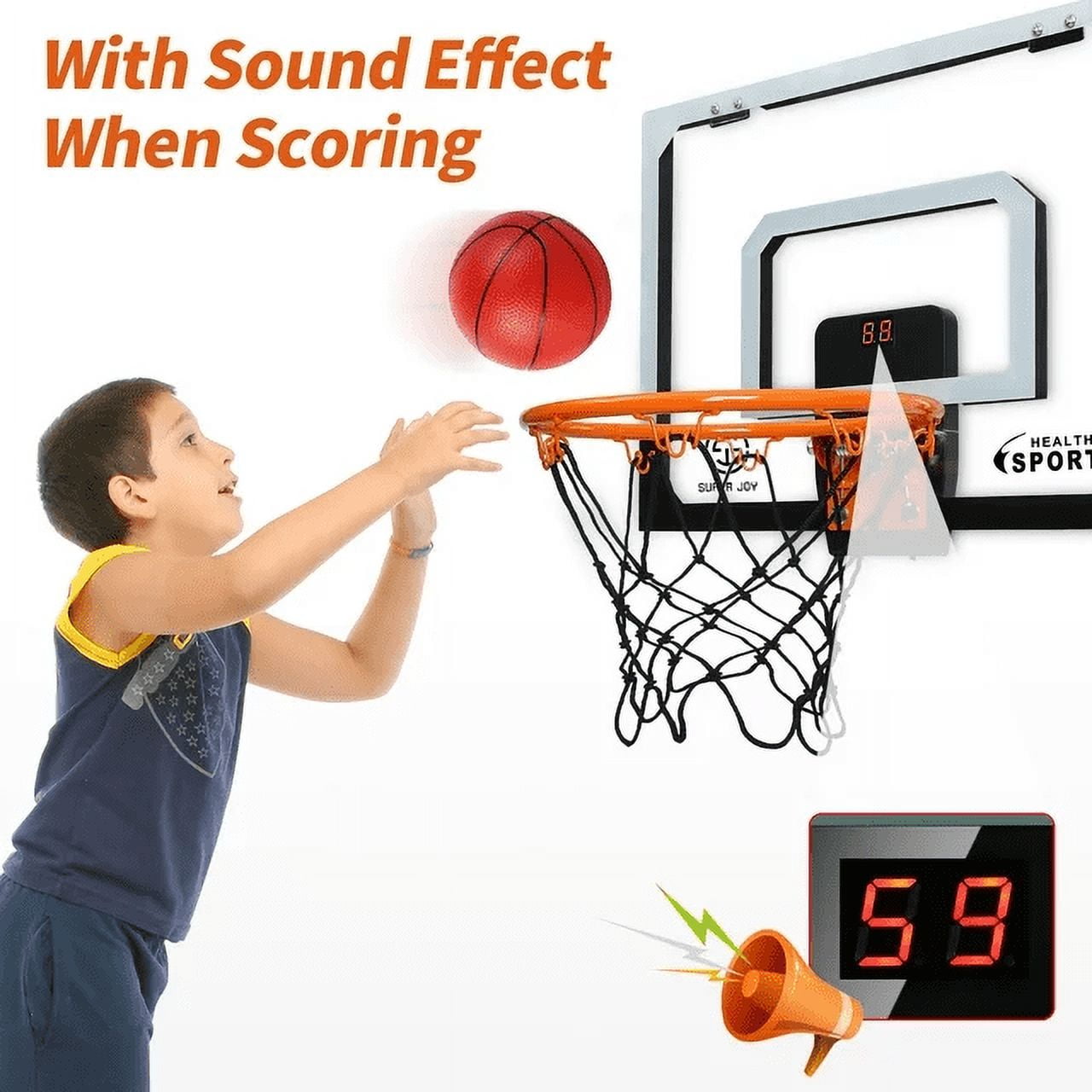 Ant Class indoor basketball hoop with electronic scoreboard & 3 balls Our basketball hoops are made of high-quality polymeric materials and metal for a stylish look and durability. Equipped with an electronic infrared sensor scorer that will accurately record every goal you score and cheer it on, is an exclusive gift for every basketball fan! The indoor basketball hoop set comes with 3 basketballs which allows children to try more friendly competitions. The high quality rubber basketballs will not leak air and are very durable. Get kids and their friends away from video games and TV, get exercise and build friendships while playing basketball.Best gift for your kids. Fun and safe, your child will love it! You can also play it in office. Basketball Backboard Size: 16.5 X 12.5 inch