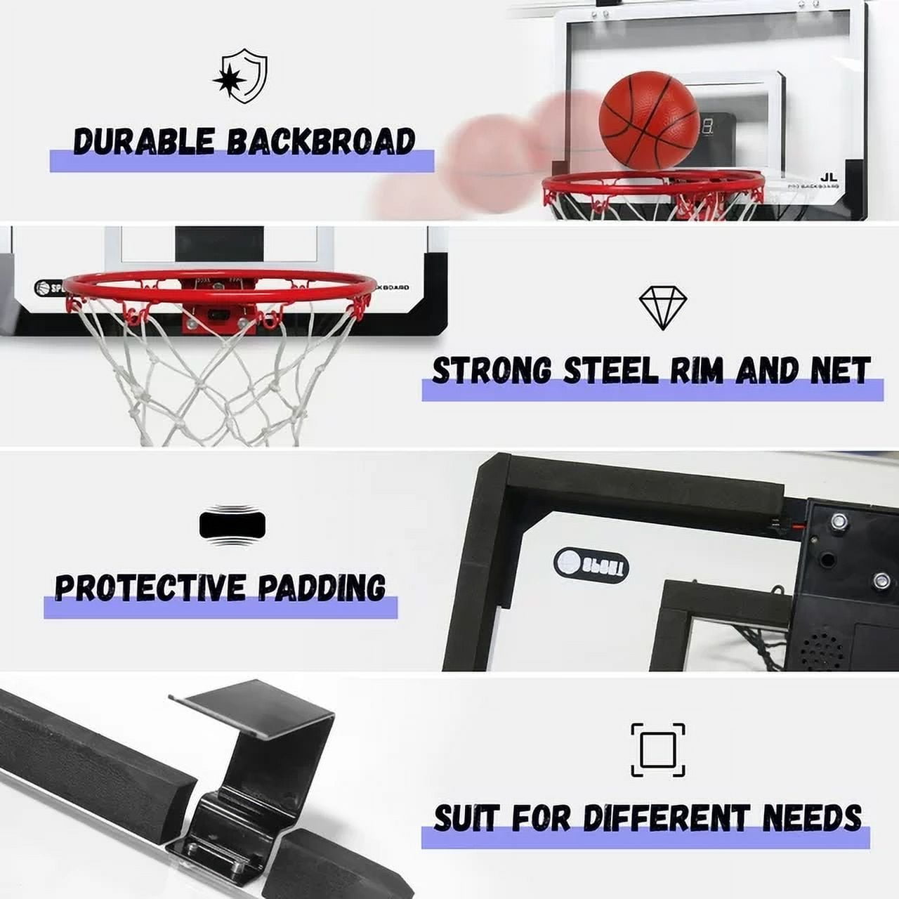Indoor Basketball Hoop with Audio Electronic Scoring Board – Scores will be digitally calculated and automatically displayed, accurately recording each goal scored. There are 2 scoring modes to choose from and the voice system will encourage or cheer the player during the shot. Let your children have fun with basketball! Right now! High Quality Door Mounted Mini Basketball Hoop Set – The clear 16.5″x12.5″ backboard is made of a high quality polycarbonate, shatter resistant and robust, has excellent toughness and durability. The backboard is fitted with thick foam padding to reduce noise and protect the door from scratches. Hooks too. Easy to Install on The Door – This door basketball stand comes with clear instructions and all the necessary tools to easily assemble in 10 minutes, then hang on the door to play – it fits all common size doors in the bedroom, classroom, dorm or office, and is easy for mobile use. If you have any questions during installation, please feel free to contact us. Slam Dunk Like a Basketball Pro – The solid steel “break-away” rim with spring action, the maximum angle is up to 45 degrees, allows you to slam dunk and shoot with ease anytime and anywhere. The spring will instantly bounce the rim back into place once you make the shot, giving every player an authentic basketball experience. Flexible Basketball Games for Kids & Adults – The professional-grade basketball hoop and 3 mini rubber balls will give you the game-like action that you need. It can not only bring fun to children, but also allow adults to enjoy relaxing moments in work. Whether bedroom basketball or office basketball, our mini indoor basketball set is your best choice.