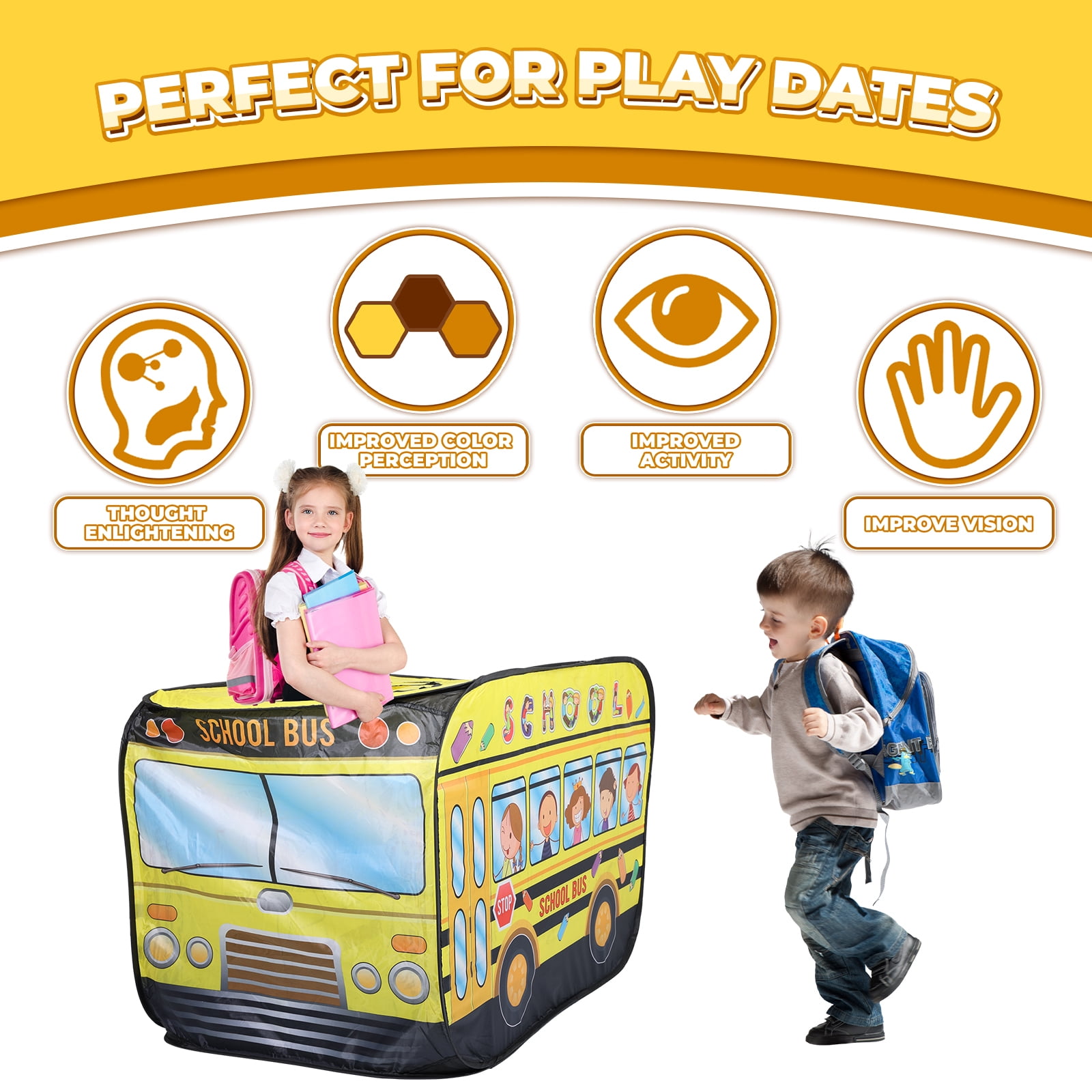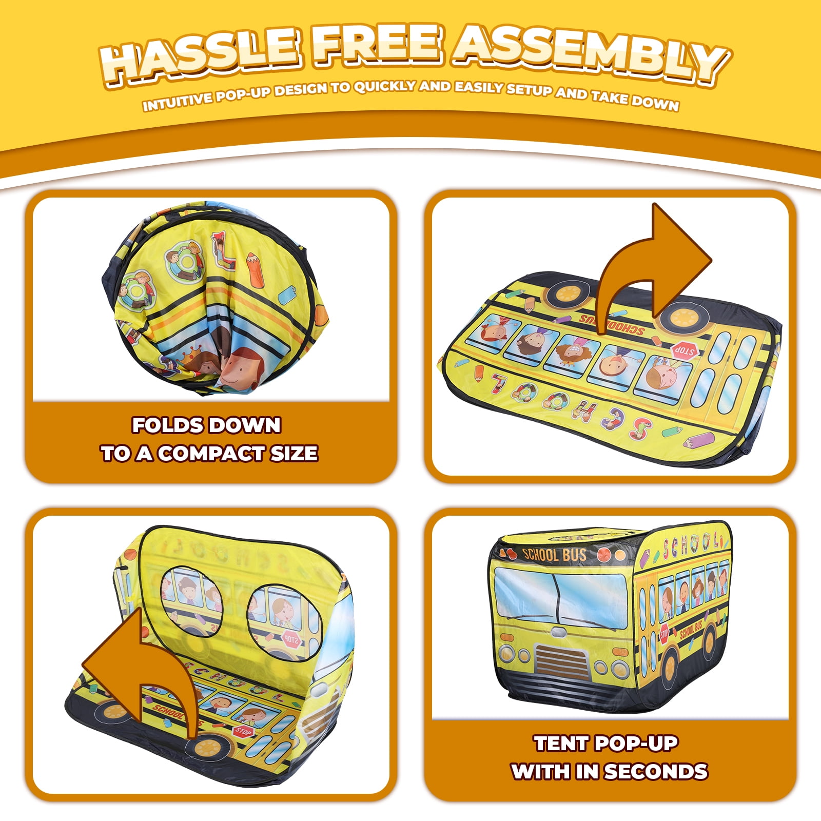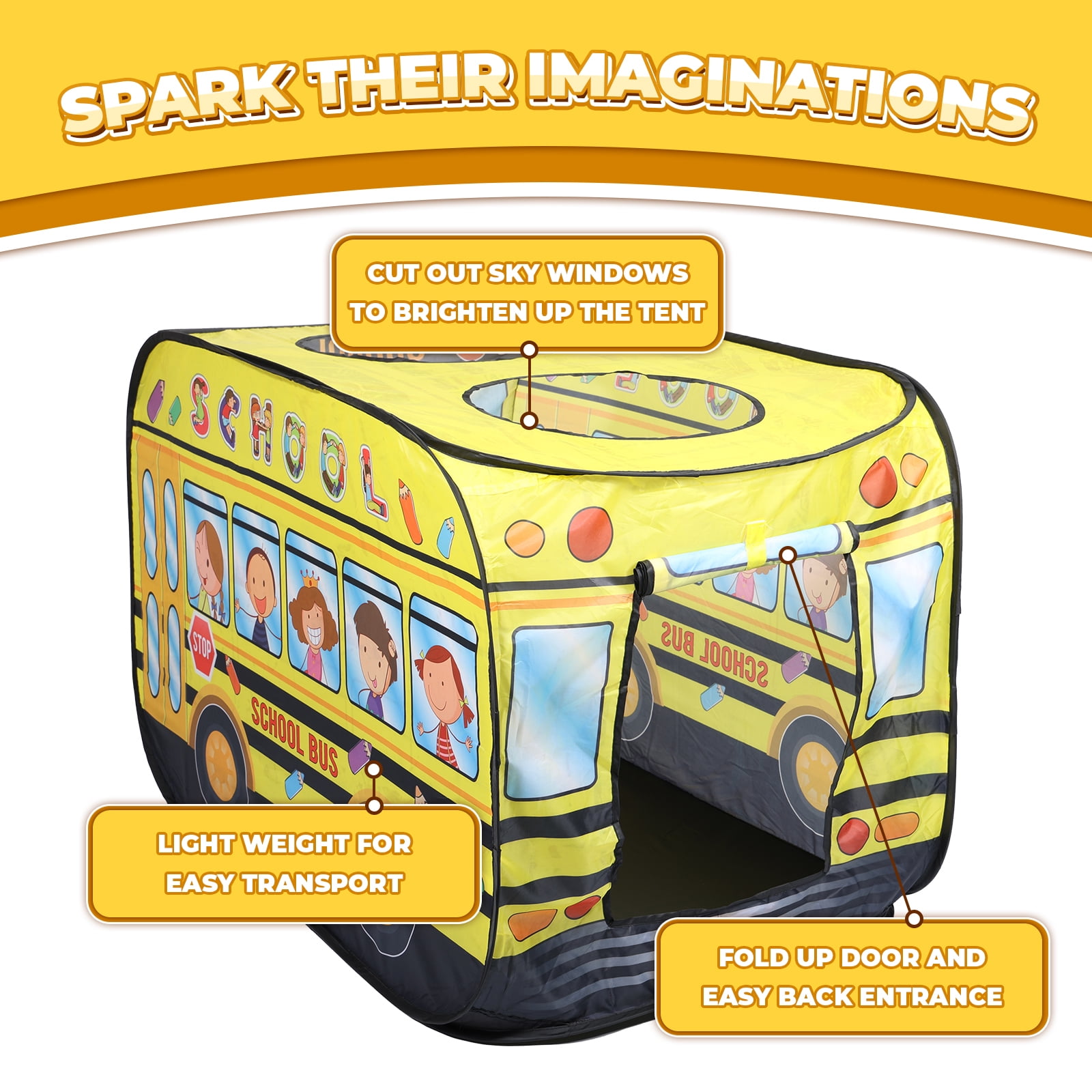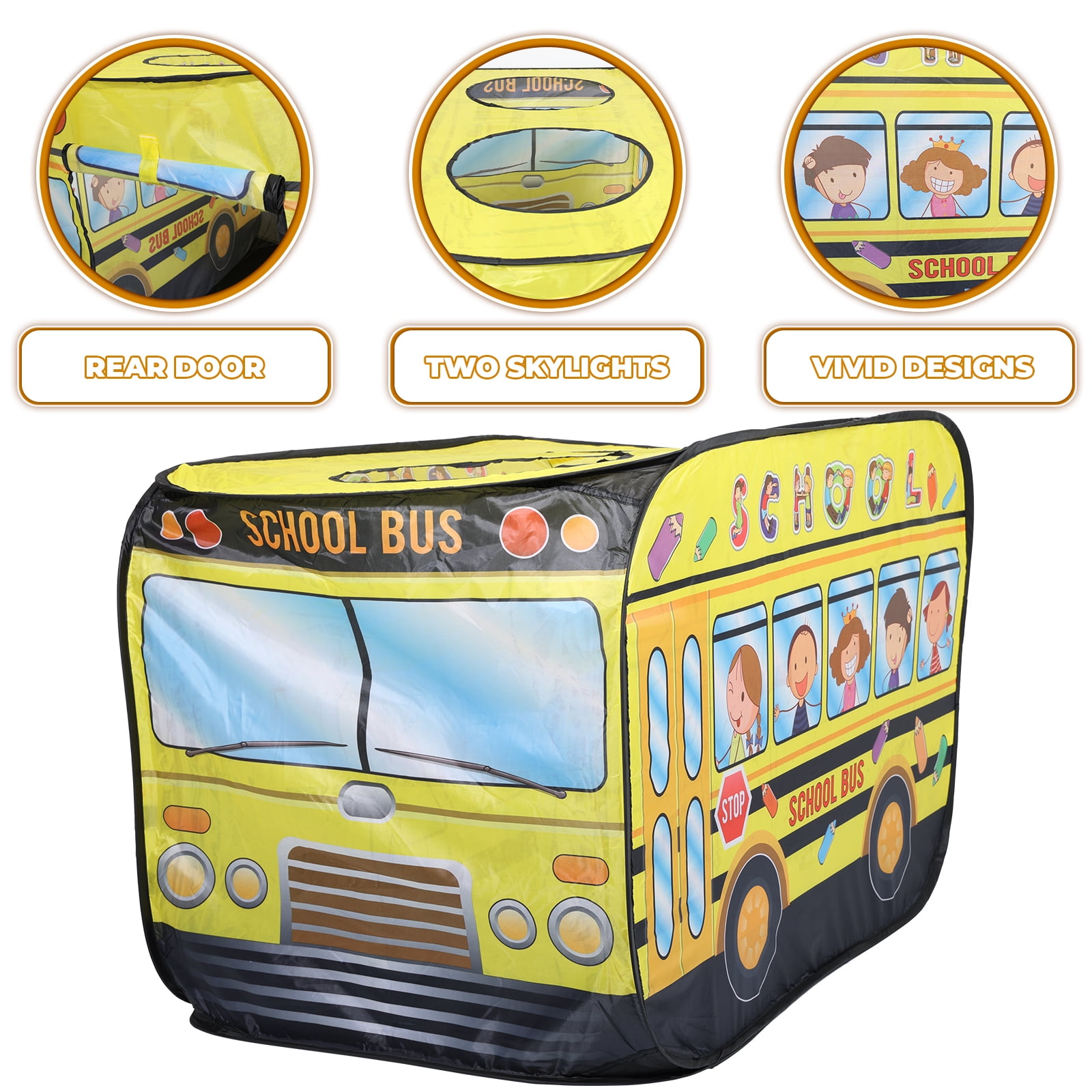 Drive Imagination: Specifically designed to fuel creativity, the tent offers a genuine school bus experience, encouraging imaginative play. Versatile Entrances: Features 2 top openings and a rear entrance for diverse play options and easy supervision by adults. Attention to Detail: The iconic yellow hue paired with detailed graphics makes this tent the centerpiece of playtime, keeping kids engaged for hours. Quick and Easy Setup: Thanks to its intuitive design, the tent springs to life in moments, without the need for any tools. Packing it away is just as simple, ensuring minimal fuss. Durable and Sturdy: Crafted using top-grade materials, this tent is built to last, enduring countless play sessions. A fabulous gift for various occasions, and an exciting addition to parties and games.