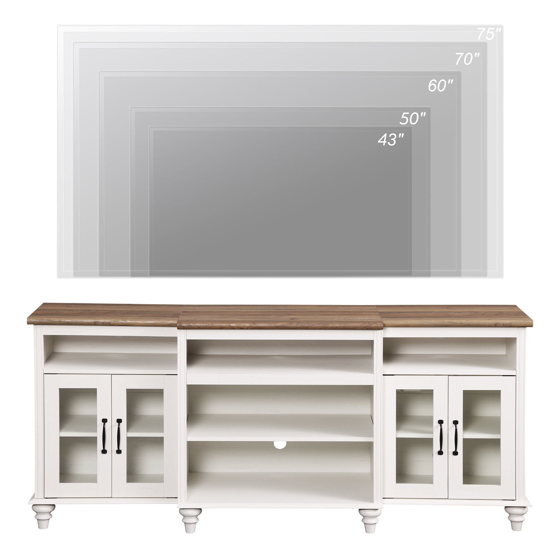 【Elegant Farmhouse-Inspired】This TV stand features a unique elevated design with a distressed off-white wood surface that exudes modern elegance. It perfectly complements farmhouse-style home decor, adding a fashionable and cozy touch to your bedroom or living room. 【Generous Storage with 9 Compartments 】Equipped with three semi-open cubbies, this TV stand is ideal for showcasing media equipment and decorative items. It includes three adjustable shelves to accommodate items of various sizes and shapes, and four glass doors that protect against dust while allowing for easy viewing. Organize cables neatly with three management holes at the back. 【Durable Construction and Premium Materials 】Crafted from high-quality MDF, the WAMPAT entertainment center is designed for durability and long-term use. The solid wood gourd legs enhance stability and support, while the reinforced tabletop can hold up to 150 lbs. The smooth, waterproof surface is easy to clean, ensuring maintenance is hassle-free. 【Safety Features for Peace of Mind 】This media console includes an anti-tip kit to prevent tipping, ensuring it remains stable and secure. Curved edges help prevent accidental injuries, making it safe for homes with children or pets. Additionally, four anti-slip foot pads prevent instability on uneven surfaces and protect your floors from scratches. The burr-free flat surface further enhances safety during use. 【Effortless Assembly and Reliable Support】 Each component of the TV stand is numbered for straightforward assembly. The package comes securely wrapped in shock-absorbent foam with enhanced corner protection for safe delivery. WAMPAT is committed to quality and offers a 2-year support guarantee, standing by to provide satisfying service and address any quality issues.