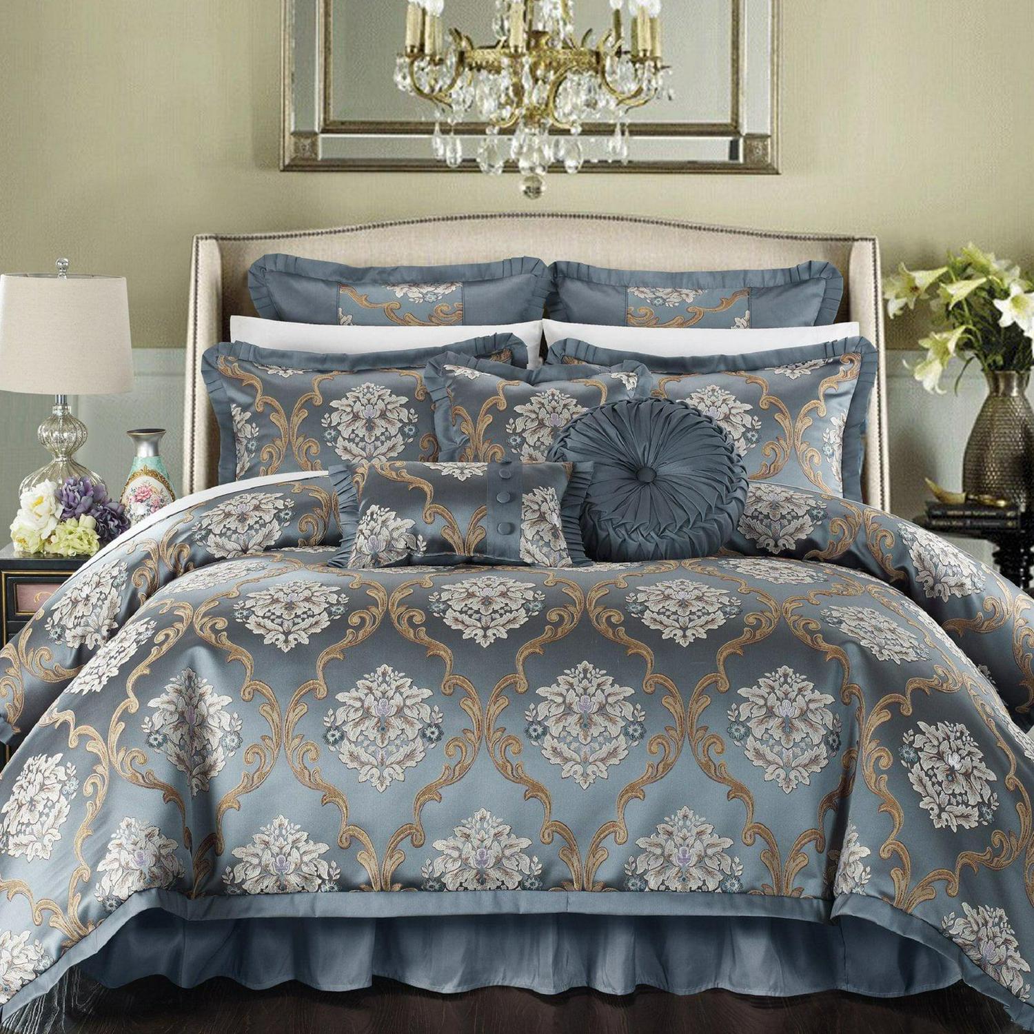 Yes!!! It’s all included! Imagine a symphony of luxury textures and style. This luxurious bedding set combines warm color and exquisite pattern to create this Jacquard traditional Antonio Comforter Set in blue color tones. Embellished with decorator details like pleated flanges and engineered pillow shams. Engineered from the highest quality of fabrics and craftsmanship that is unparalleled such as amazing details featured on the decorative pillows and shams. Includes decorator quality tufted round throw pillow, boudoir throw pillow and 20-inch ruffled square throw pillow.