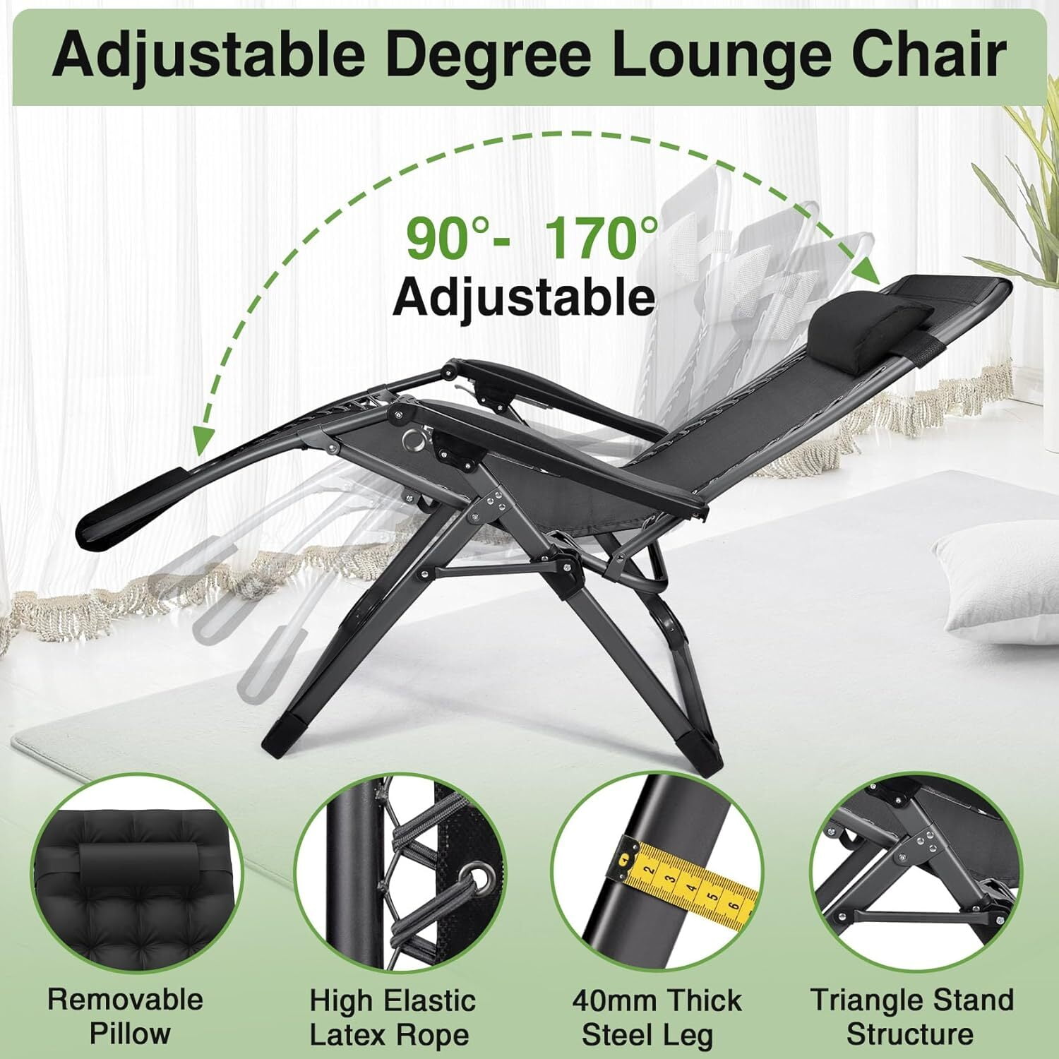 Adjustable and Zero-Gravity: Our zero-gravity lounge chair adjusts from 90 to 170 degrees for maximum comfort. Push the clip to unlock, set your angle, then pull it back to secure. Easy to Use: This folding chair sets up and packs away in seconds. Easy to transport by car, it’s ideal for terraces, lawns, gardens, yards, balconies, poolsides, and beaches. Removable Soft Cushion: The soft cushion enhances comfort and is removable for better breathability in summer. The lounge chair is also easy to install, fold, and store for convenient handling. Multipurpose Use: Perfect for reading, relaxing, or quick breaks, this comfortable folding lounge chair suits any setting. Ideal for indoor use, outdoor activities, family gatherings, BBQs, beach days, or the office.