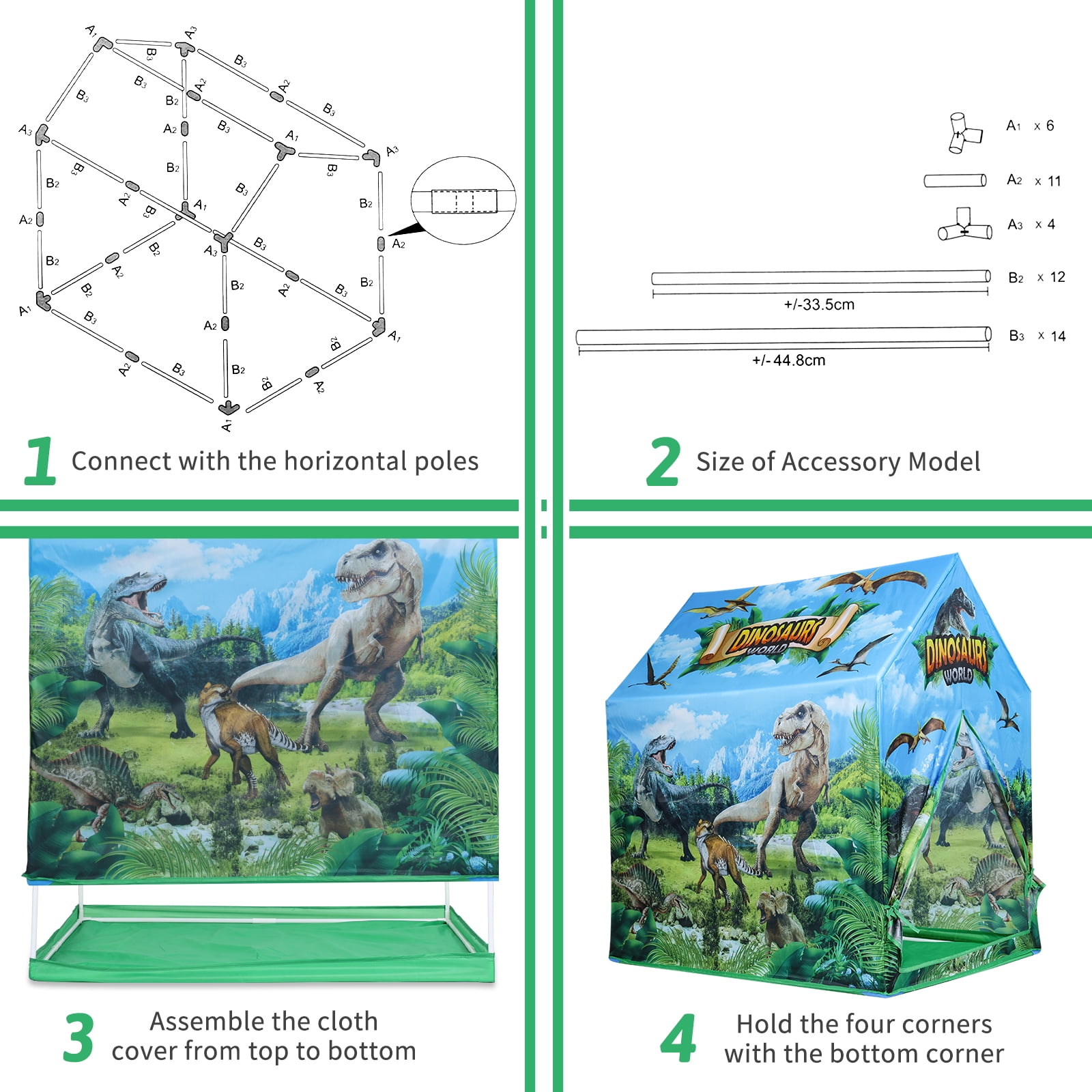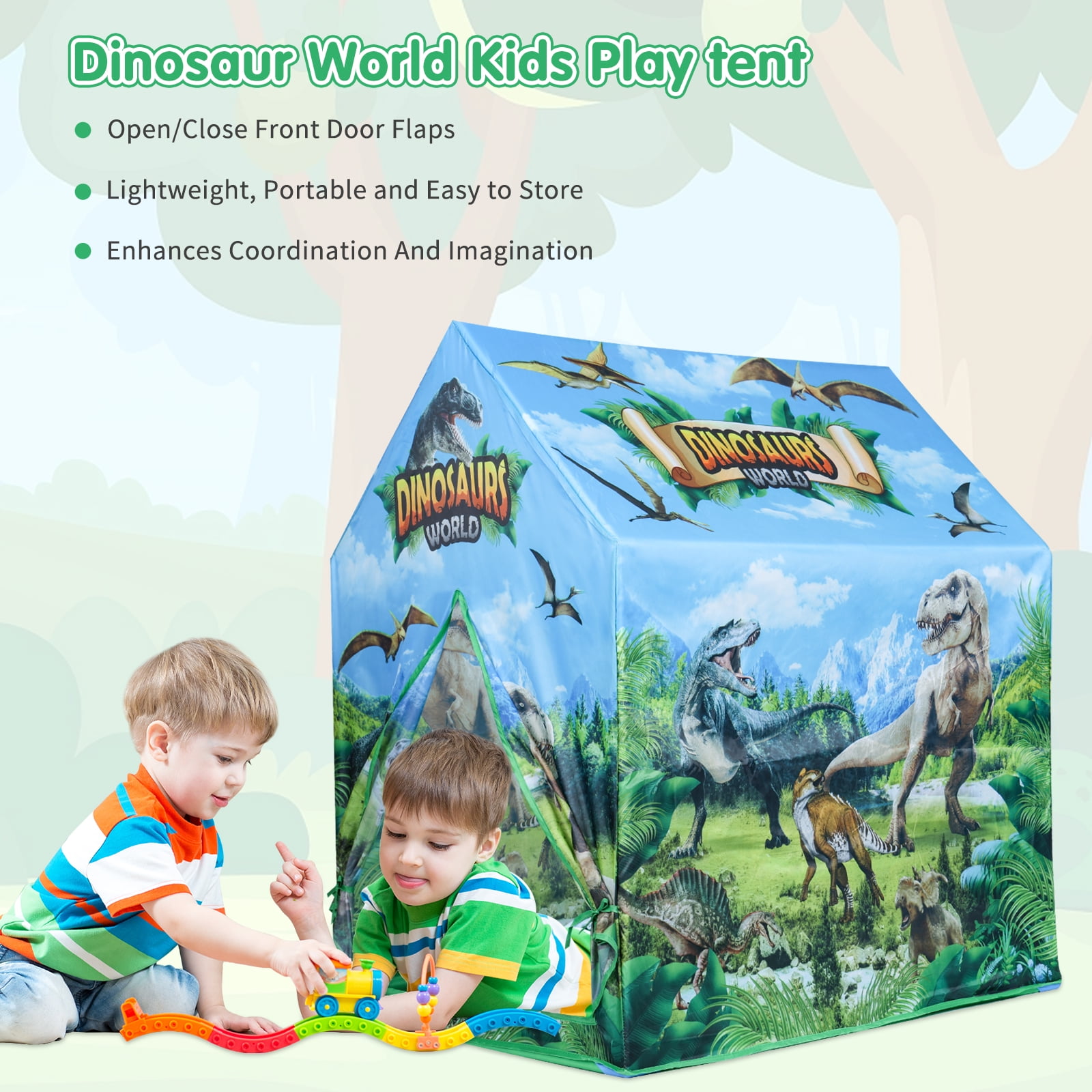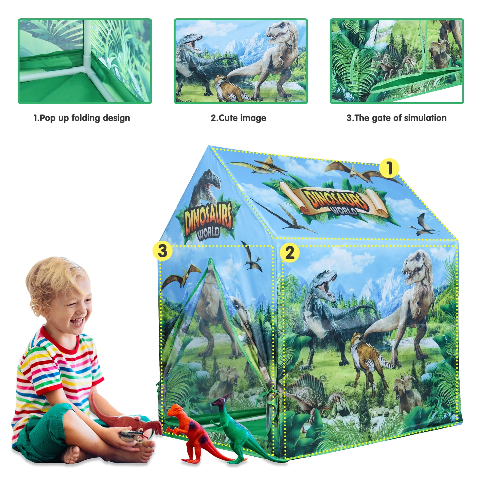 Dinosaur Play House, Kids Outdoor Park Camping Toy Tent, Toddler Indoor Bedroom Big Space Tents, Kids Pretend Jurassic Museum Playhouse This AOKESI Dinosaur Play House is an adorable gift for all kids. Fast and easy set up/breakdown with no tools required. The lightweight popup tent for kids indoor/outdoor is great for indoor or outdoor use. Its small size is easy to fit in compact home or kids room. The dinosaur play tent can be folded flat for convenient storage when it is not in use. Unique dinosaur pattern helps to stimulate your kids’ creativity and imagination, helping build critical thinking skill. They will even be delighted sharing the dinosaur tents with siblings and friends while taking on roles such as astronauts, captains, space explores, aliens, and so much more. Perfect for ages 2 and up, our dinosaur pretend playhouse is fun for families with young boys and girls, preschool and elementary school teachers, and early educators who want to help kids grow, learn and have a great time. Features: – Foster imaginative and creative play – Small size is easy to fit in compact home or kids room – Ideal for home, backyard, parks, parties, day care and more – Comes complete with sturdy poles for quick and easy assembly – Fast and easy set up/breakdown with no tools required – Tent folds flat for convenient storage when not in use – Cleans up easily with a sponge and mild liquid soap – Material: 100% Polyester fabric & Plastic pole Specifications: Material: Polyester Style: Sturdy Item Dimensions: (LxWxH) 21.46×3.15 x5.91 inches Theme: pretend play, outdoor play, sports, party, Kindergarten, space, gifts Frame Material: Plastic Age Range (Description):Kid Assembly Required: Yes