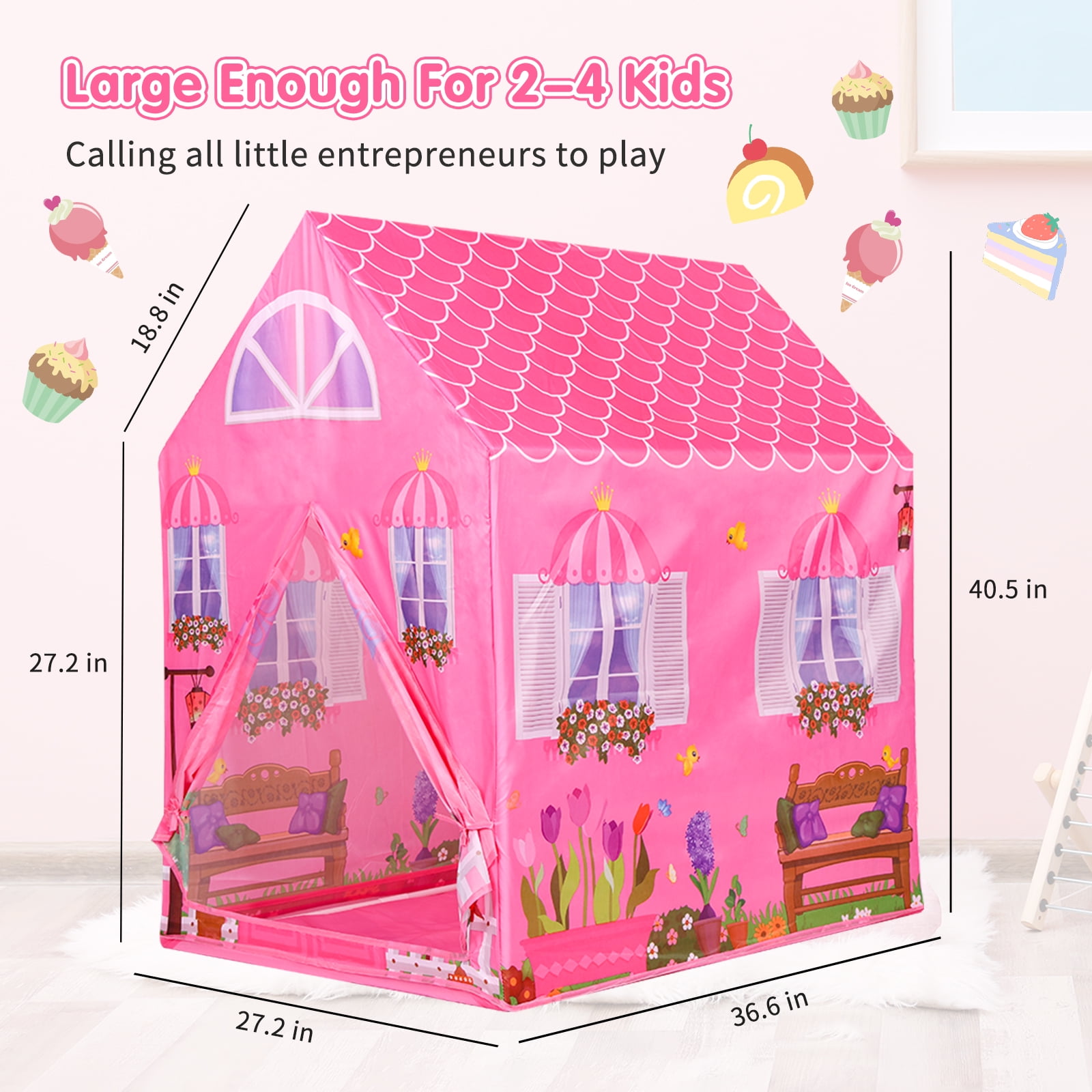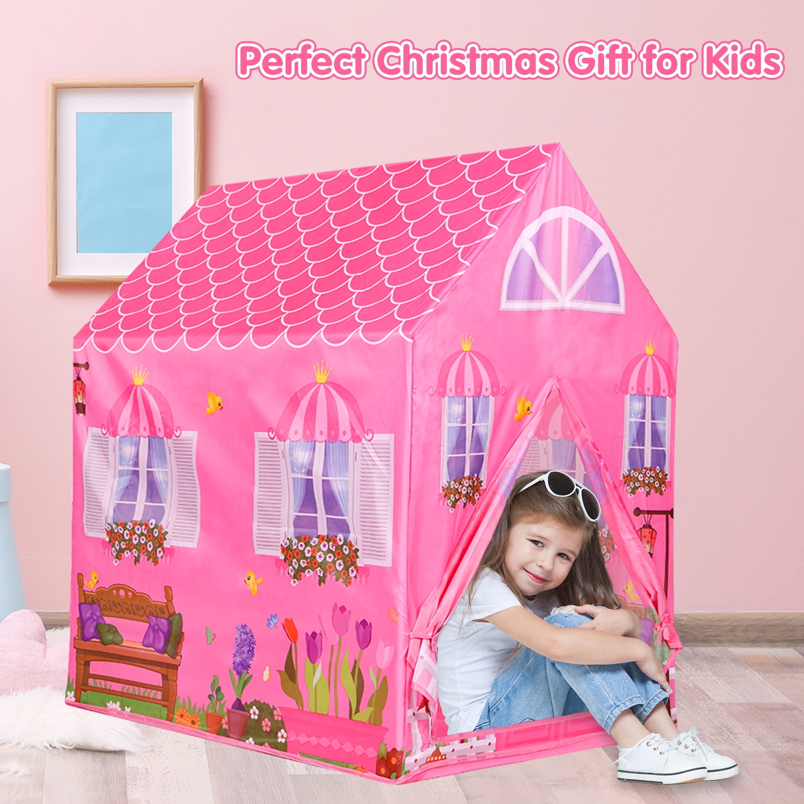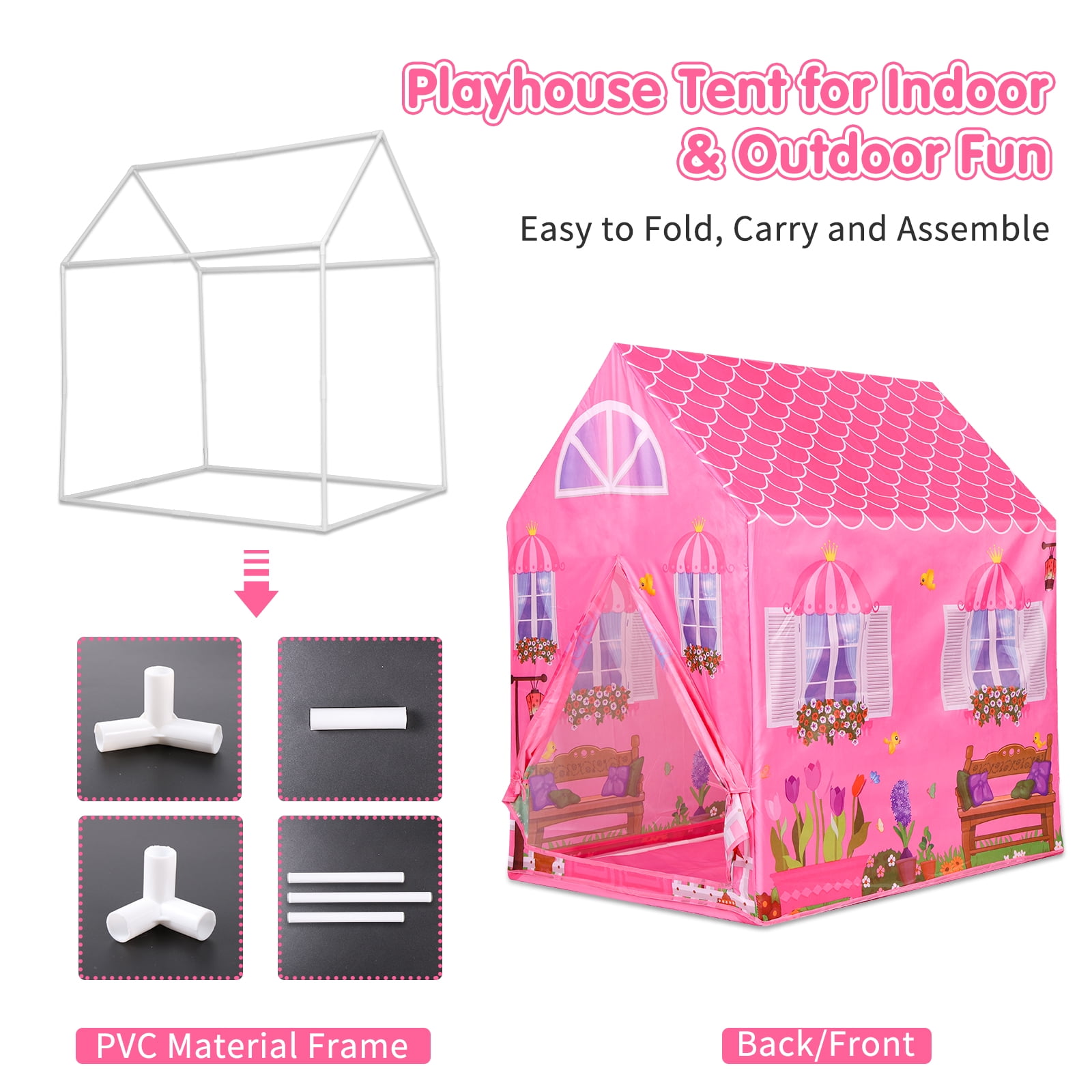 Perfet Gift to Encourage Creativity & Imagination If you are looking for a perfect indoor/outdoor space to explore your children’s imagination and encourage creative entertainment. This vibrant, easy to set up tent is just right your choice. This kids play tent intends to create the most comfortable and magical space for your children to explore. Every girl has a dream of being a princess ,the pink adorable play tent can not only catch your kids’ eyes,but also provide their own private place for entertaining, reading, playing games and enjoying themselves, which can enrich children’s imagination and enhance their creativity. And the lovely playhouse tent is made from toxic-free material and premium fabric. The princess castle tent provides a large space for kids to play,read or sleep and can accommodate two or three children at the same time,even adults can enter the kids playhouse easily. , encouraging your children to dive into their imagination, creating a magical space for them to escape to. It makes the perfect gift for kids ages 3+. Features: Foster imaginative and creative play Perfect size to fit in a kids room, and big enough for young ladies social Ideal for home, backyard, parks, parties, day care and more Comes complete with sturdy poles for quick and easy assembly Fast and easy set up/breakdown with no tools required Tent folds flat for convenient storage when not in use Cleans up easily with a sponge and mild liquid soap Brilliant choice for girls and boys birthday gift or holiday present Specificatios: Material: Polyester Style: Compact Theme: Pretend play, outdoor play, sports, party, Kindergarten Frame Material: Plastic Age Range (Description): Kid Assembly Required: Yes