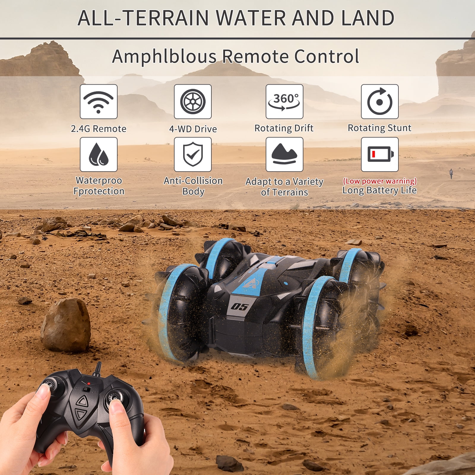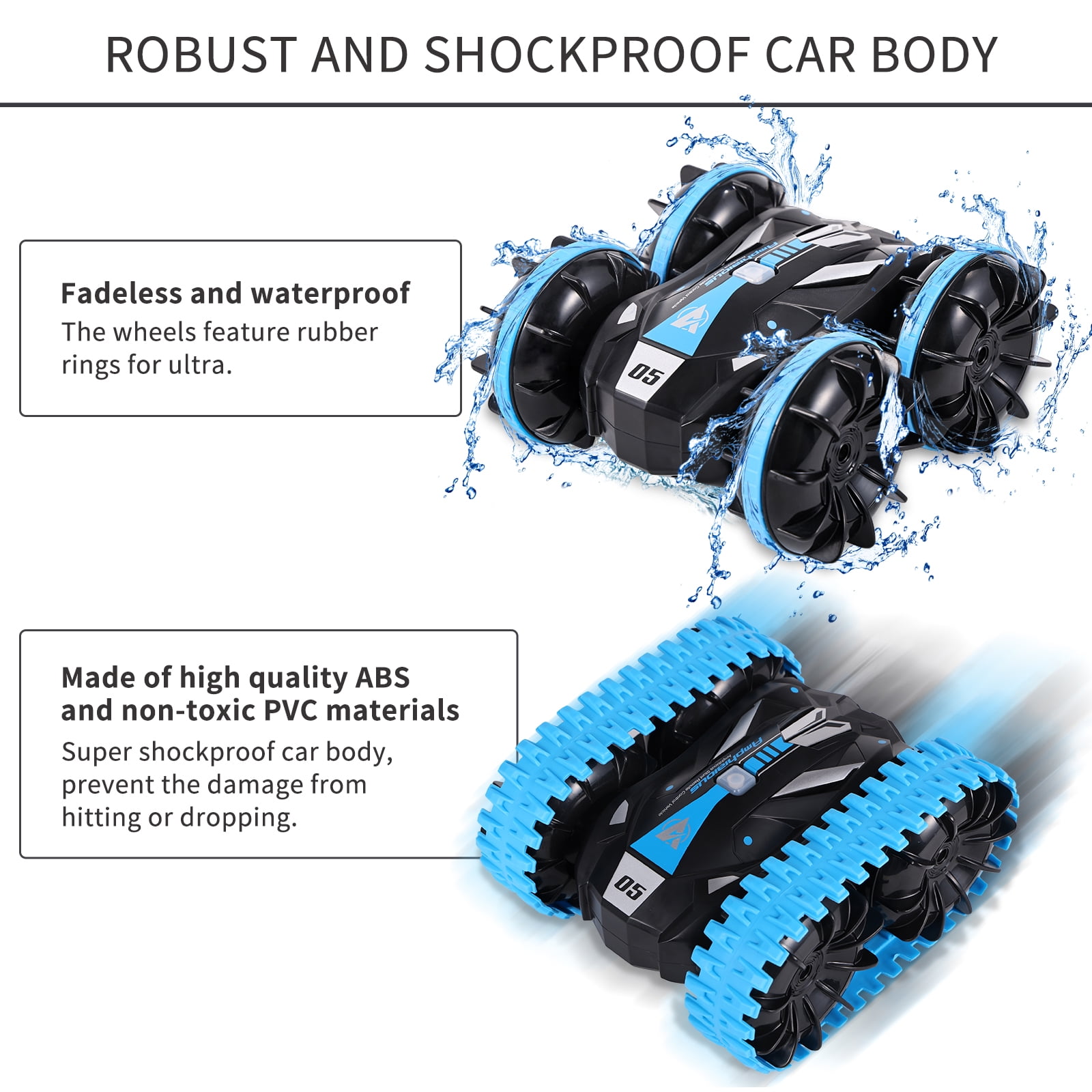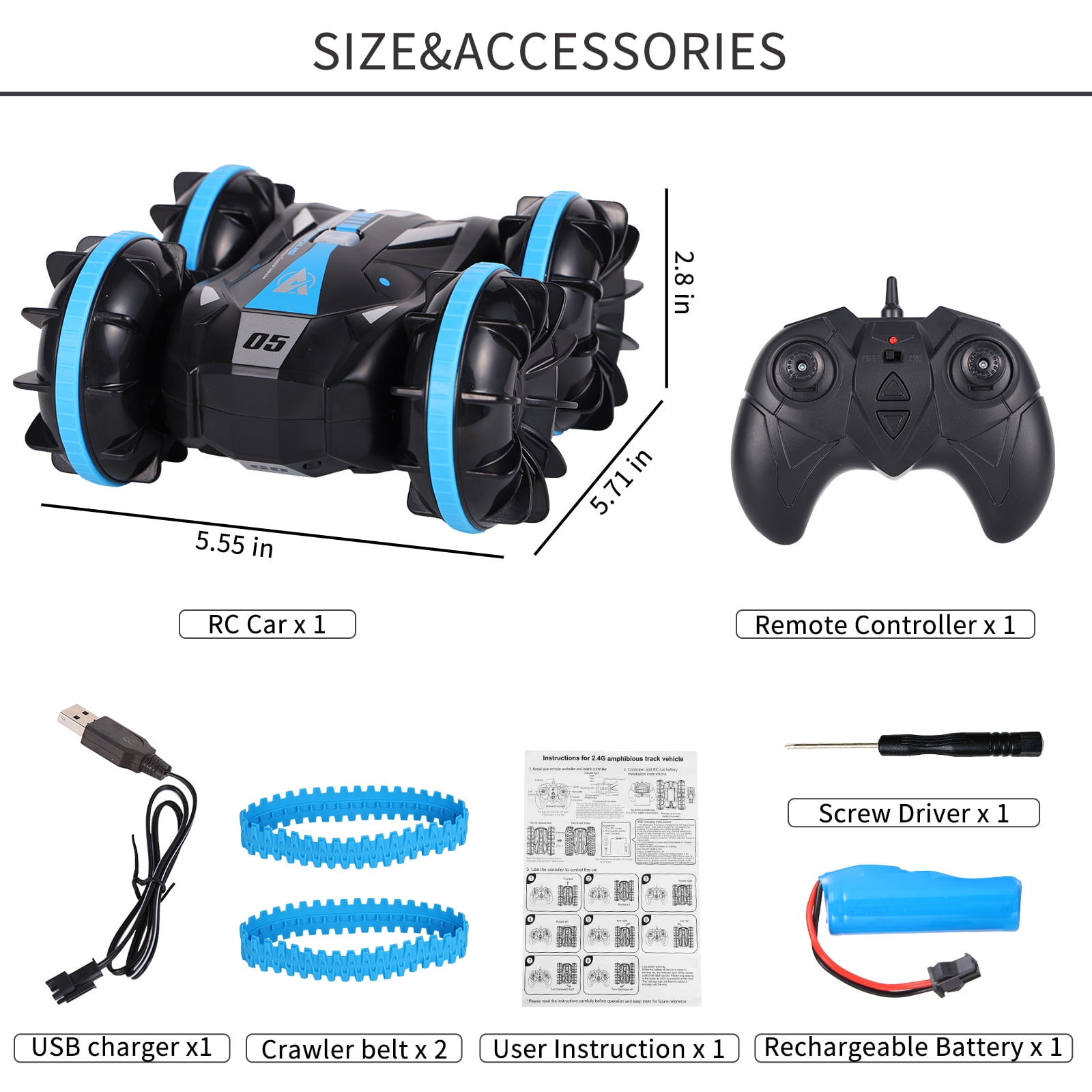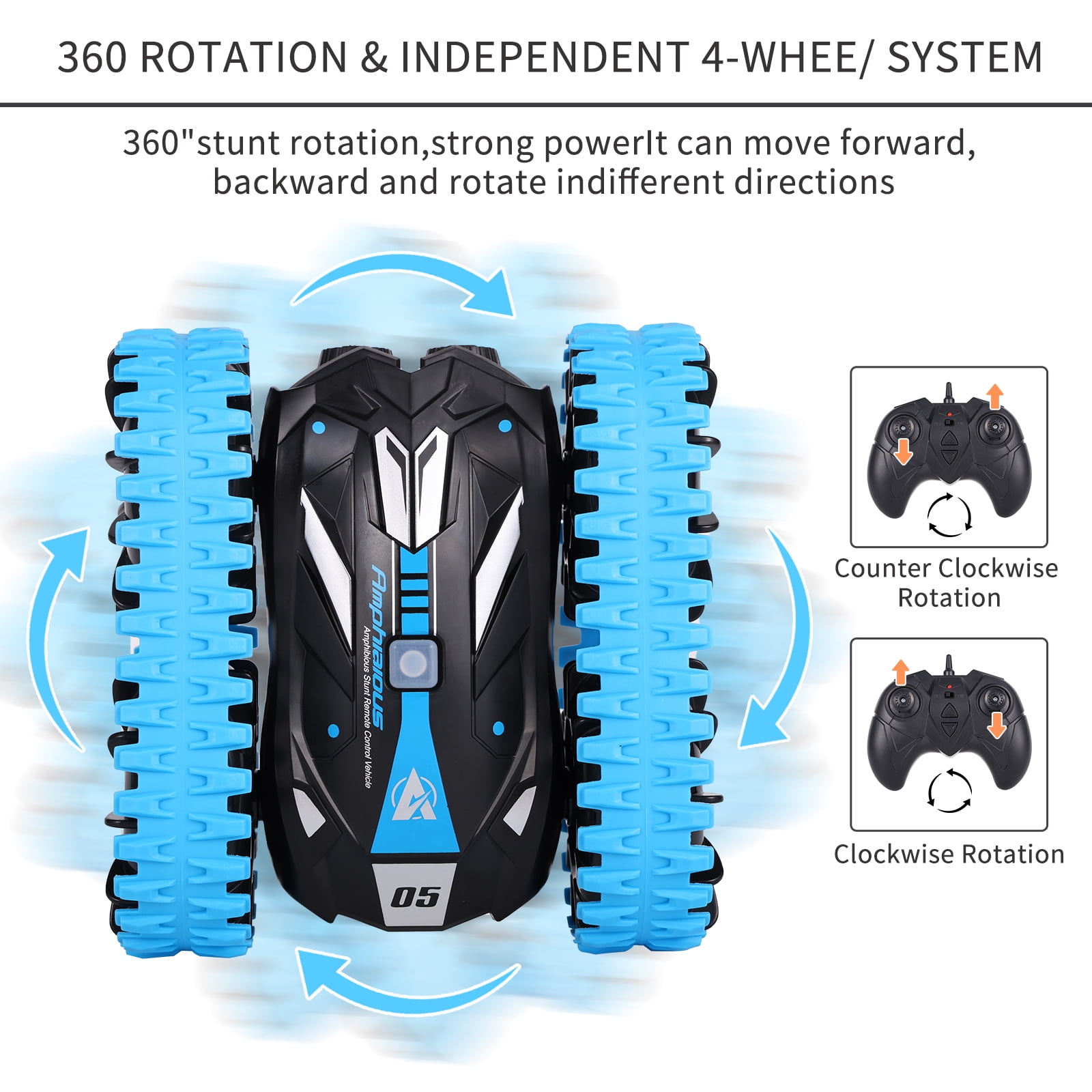 AOKESI RC Car for Kids, Amphibious Remote Control Car 2.4GHz Water and Land RC Stunt Car Christmas Birthday Gifts This AOKESI water and land stunt car is suitable for indoor, outdoor, sunny and rainy days. Any occasion, the field freely travel. This is a racing toy for family and friends to play together – enjoy the excitement of racing time. This is a full-featured RC stunt car that can be used in water and on land, and is a fully waterproof design. It can be driven in pool, mud, beach, lake and snow. The new remote control design can do things that other ordinary racing cars can’t do. 360° rotate design provides you with an amazing visual experience.The off-road design allows it to easily break through and conquer any extreme situation. So it’s also the perfect gift. Perfect for boys, girls, adults, racing enthusiasts aged 6-12 and up. Features of Amphibious RC Car: Recommended age: 6-10 years Material: ABS Functions: 360° Rotation; Waterproof; Chargeable; All Terrain Charging time: about 2-3 hours Playing time: about 20 minutes Color: Blue Warm Tips Before Play: 1. Please read instruction manual carefully before play the car. 2.The batteries must be fully charged for four hours for the first use. 3. Active the car first, then the remote control, so that they will in the same frequency. Otherwise, you may find the car is not working. 4. Remote is not waterproof, please avoid touch water. 5. Controller Battery: 3 x 1.5V AA Batteries(not included) Notice: 1. The actual color may vary slightly from the online image due to monitor color settings. 2. Please allow slight measurement deviation for the data.
