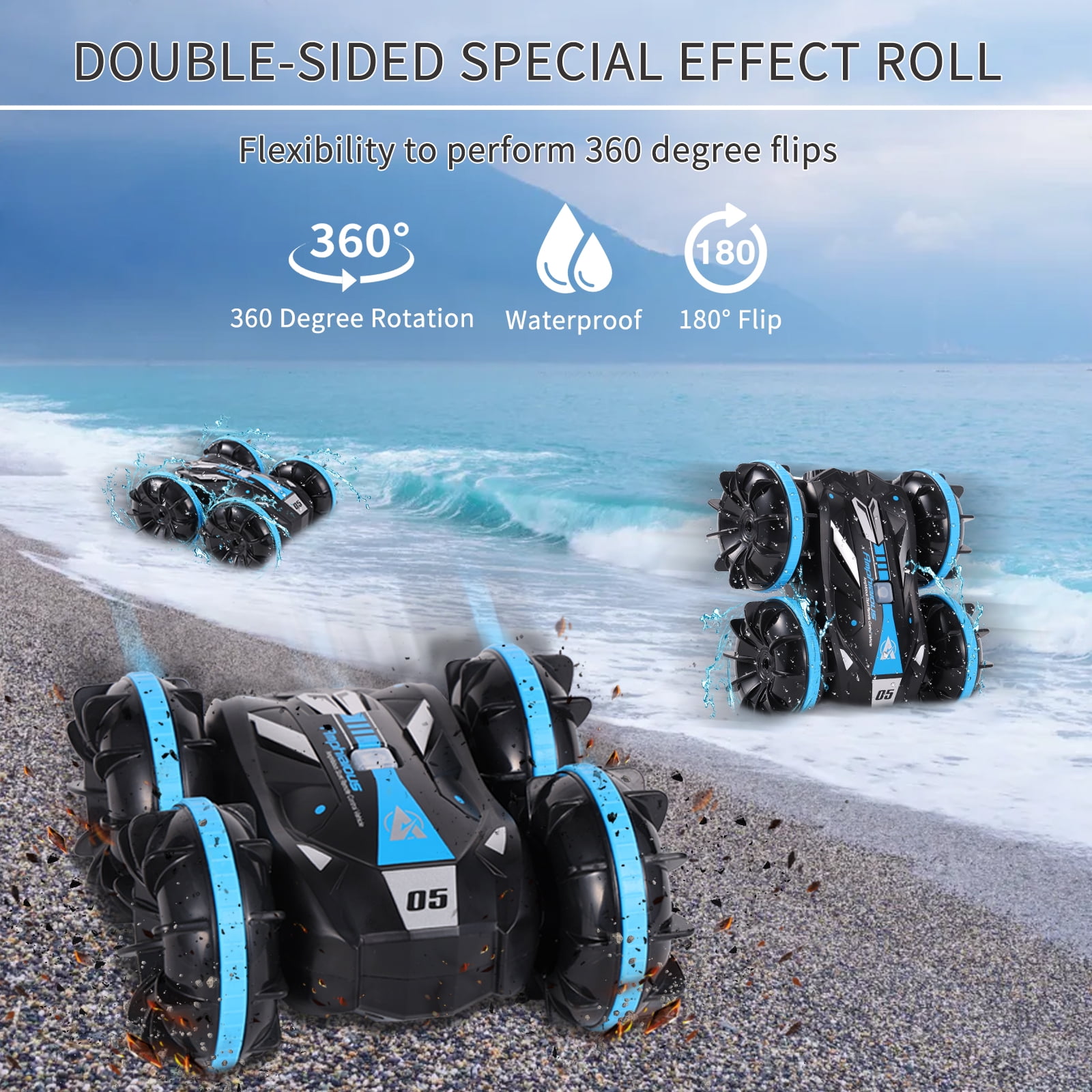 Amphibious & Complicated Stunt Action for 2 in 1 Land Water RC Cars- front & back flips, 360 degree spins on the water and ground. Smooth driving on both land & water. RC Car with Durable Materials & Rechargeable Battery – Make of non-toxic ABS Plastic and high-quality metal materials. The remote control car is very safe for children. 2.4GHz remote control with sensitive control. Amazing Built-in Motor for Amphibious Remote Control Car – The powerful motor enables to speed up to 12KM/H(7.5MPH). The rc car toy can (low speed in the water) Long-distance control and multi-people use, providing you with a feeling of excitement Package Contents – Electric Amphibious Stunt Car x 1, Remote Controller x 1, Rechargeable Battery x 1, Charging Cable x 1, Screw Driver x 1, Waterproof Bag x 2。 RC Car Toys Gift for Kids – Shuttle freely in all terrains like lake, beach and grassland. A great gift for kids when birthday, festival, holiday, perfect for boys, girls, adults, racing beginners at 3-12 and up.