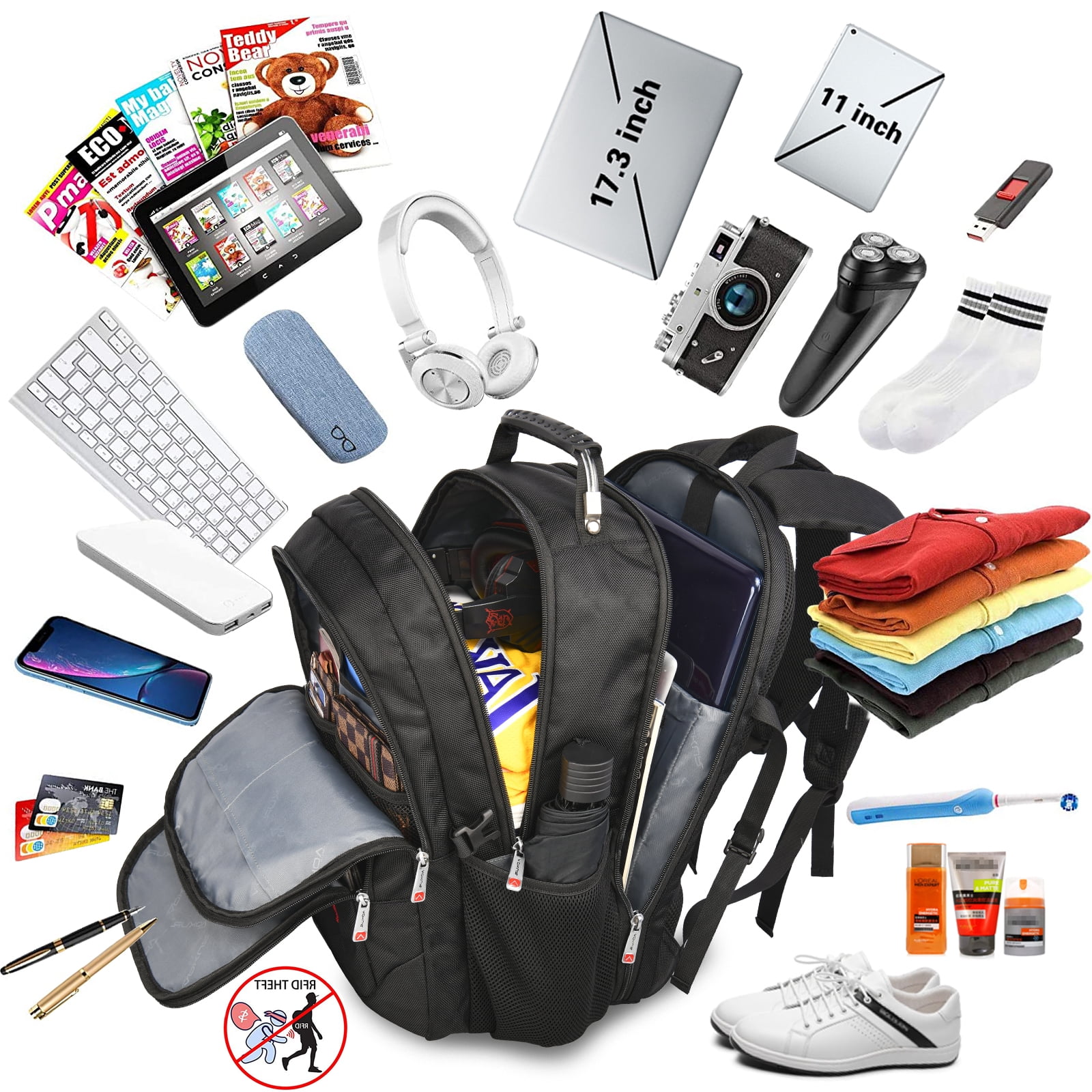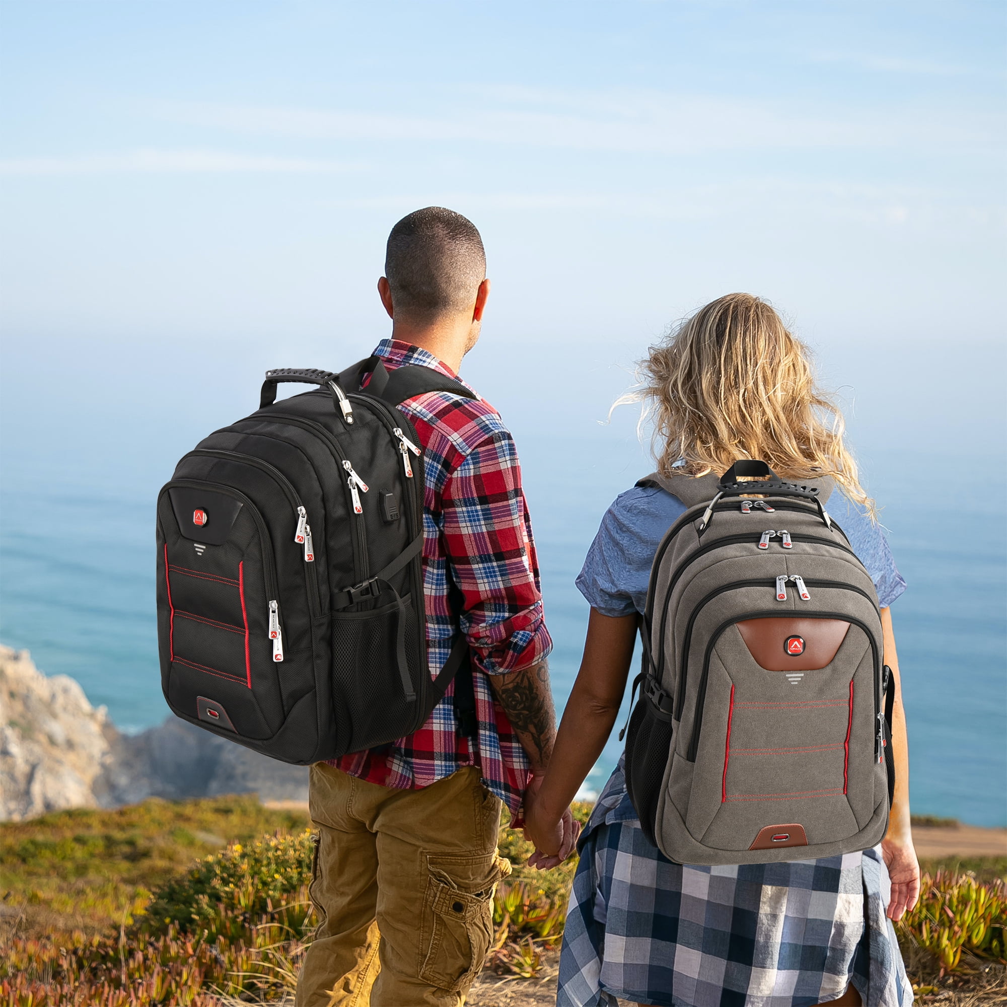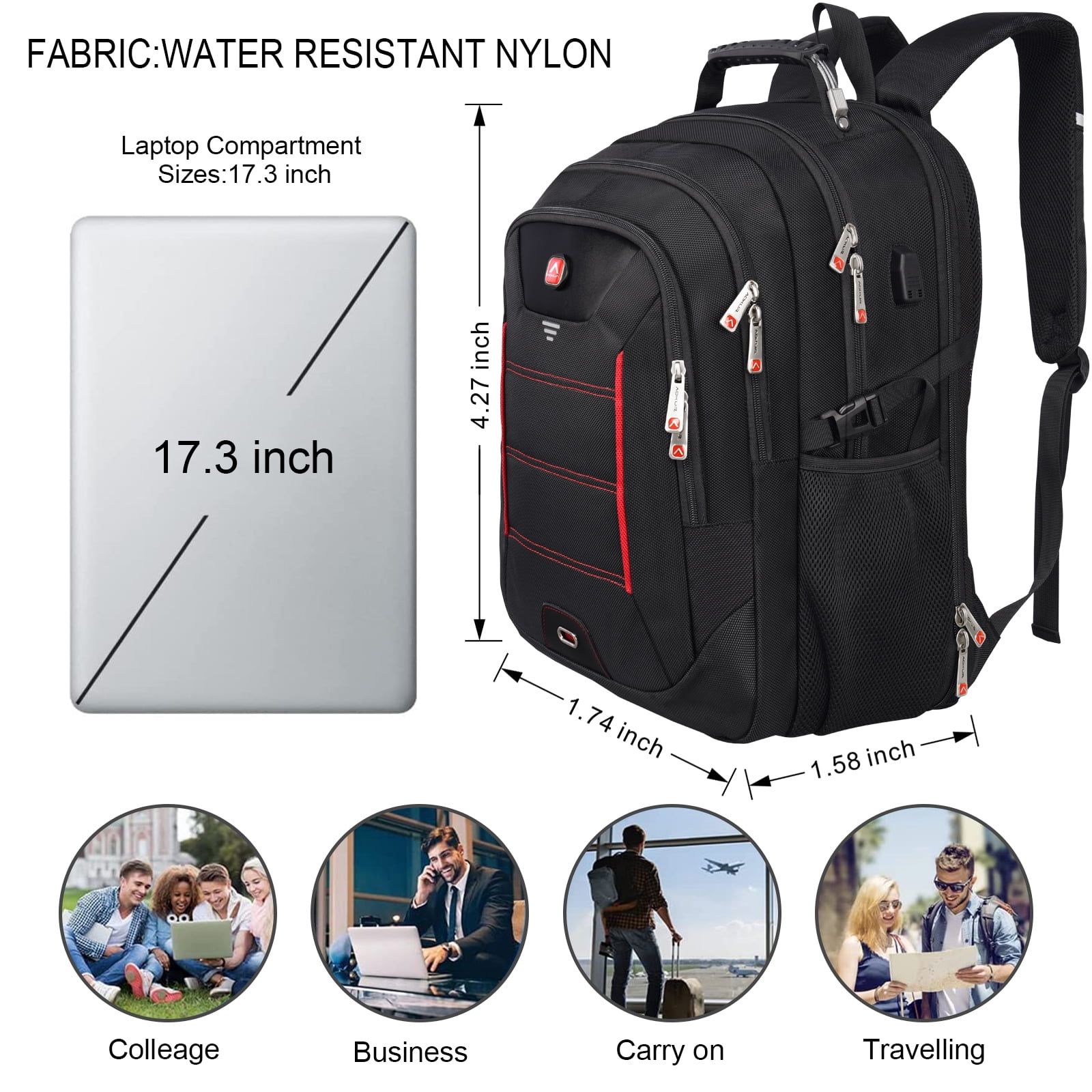 ✈Extra Large Capacity and Multi-Pockt– Extra Larger 55L black backpack with Multi Compartment, Included owns 15+ independent pockets for large storage and organization for small items,4 main compartment,1 separate padded laptop compartment pocket,1 front zipped pocket.Both two side mesh pockets outside for oversize water bottle and compact umbrella,three net compartment fit your laptop accessories,school supplies. ✈USB Charging Port + Back Anti Thief Pocket+U Shaped Back Design–Aokur Brand backpack with built in USB charger outside and built in charging cable inside,provides you convenient charging of your electronic device anywhere.And also have a hidden anti theft pocket on the back protect your valuable items from thieves.Special U shaped design on the back,elastic foam back panel and extra-thick mesh back pad Provide horizontal cushioning to the back. ✈DURABLE & COMFORTABLE & Luggage Strap– The backpack is made of high density,light and durable,smell-less,water resistant polyester material with waterproof metal zippers. Soft mesh webbing hand-held design to protect your hands under a long time carry on. A durable luggage sleeve frees your hands when traveling. ✈EXTRA LARGE & 5 layers of fabric Design– 3 spacious main multi compartments fit for Fits most 17.3,17,15.6,15 inch laptops.Exterior size of the extra large travel backpack:21.3*16.1*10.6(inches).Capacity:55L,large capacity backpack for women men,high school student backpack for boys girls.
