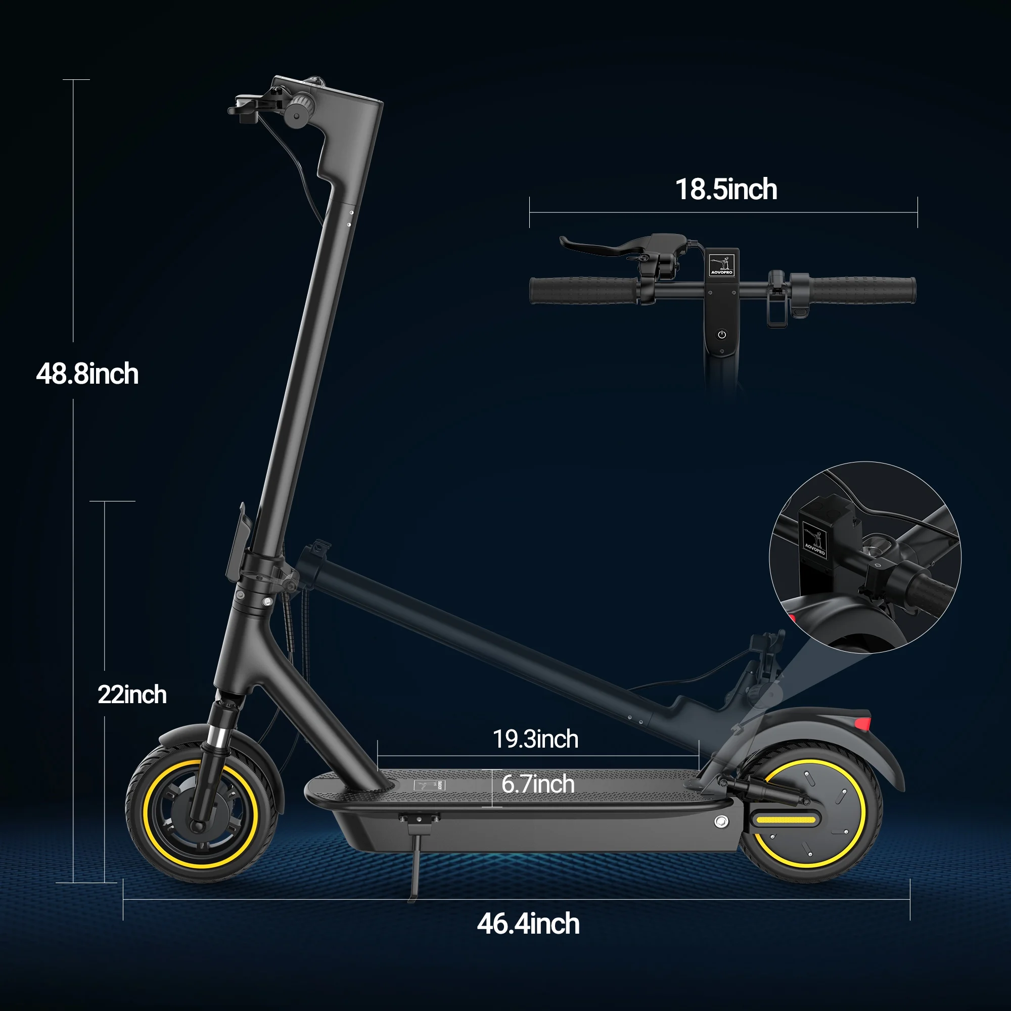 AOVOPRO Esmax 500W 10′ Foldable Electric Scooter for Adults with Air Tire and Dual Shock Absorption, Dual Braking With APP Model No: ESMAX Unisex Electric Scooter Lithium Battery: 14.5 Ah lithium battery App name: AOVOPRO/TUYA Tire:10 inches anti-puncture tire, 500W motor Frame Material: Aluminum Alloy Brake: Electronic Brake + drum brake Lighting: LED Shock Absorption: Front and rear suspension Charging Period: 7 Hours Max Load: 265 lbs (120KG) Gross Weight: 47 lbs (21.5KG) Net Weight: 41 lbs (18.5KG) Folding Size: 47 *18*23 inch (1210*470*590MM ) Produce Size: 47 *18*50 inch (1210*470*1260MM) Bottom footboard size : 23*7.5 inch Carton Size : 48 *8*25 inch (1230*205*635MM) 100-240V(Input)/42V(Output)/2A