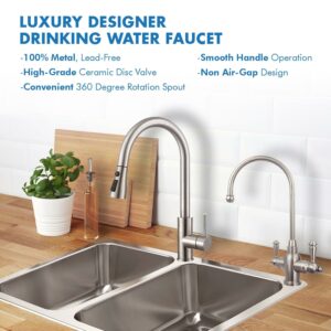 This APEC Water 100% metal and lead-free, dual-temperature designer faucet is an essential upgrade to your kitchen. It delivers both hot and cold water when connecting to your reverse osmosis system and instant hot water system. It features an easy-to-use dual handle and a high arc 360-degree swivel spout for convenient water use and contemporary look. Solid metal handle controls the smooth and durable 1/4 turn ceramic disc valve, allowing pure water to pour at any rate you desire. Superior anti corrosion and rust-resistant finish prevents dirty from sticking to faucet surface. The non-air gap design enables water moving faster and easier to the faucet without any noise and clogging. This sophisticated and stylish hot and cold drinking water faucet is a perfect supplement to your kitchen decor and makes your counter-top look great!