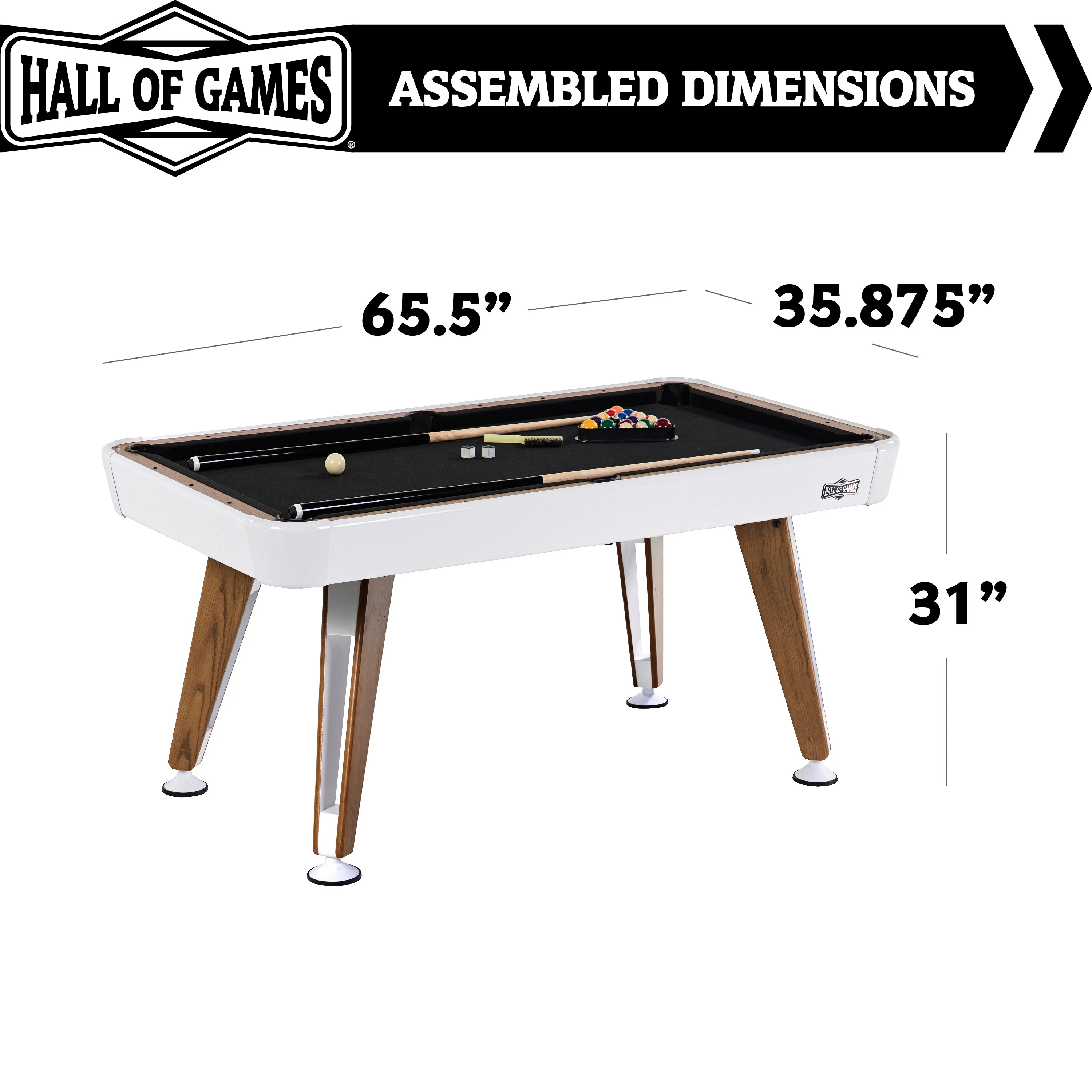 Hall of Games 5.5′ Apex Drop Pocket Table With Pool Ball and Cue Stick Set COMPACT SIZE & DURABLE: This high-quality 5.5’ Modern style billiard table is compact and designed for real game action at a size that will fit in many game rooms, and ships mostly preassembled with all the accessories you need for a classic game of pool CRAFTSMANSHIP: The top rail and apron of this table are made of MDF and PVC laminated with an oak wood finish on top and a white laminate side, the playing surface is over ½” thick (15mm) and made of engineered wood PLAYING SURFACE & BALL ROLL: The 57.875 ” x 28.25” playfield of this drop pocket table is velvet cloth-covered with L-shaped rubber bumpers for a smooth ball roll of the included 1.75” pool ball set STURDY LEG DESIGN: The table legs are made of MDF and designed with a white and wood grain PVC laminate to create a Modern style. The legs have adjustable 4” oversized leg levelers and the tables playfield has an adjustable bracket to help even the surface ROOM SIZE & ASSEMBLY: The playfield mainframe is preassembled, the assembly process mostly consists of building and attaching the legs, the recommended room size for this table is 13.5’ x 11’ to allow for cue stick movement around the table ACCESSORIES INCLUDED: This pool table comes with a complete set of billiard accessories to start playing right away and includes one set of 1.75” billiard balls, two 48” cue sticks, one triangle, two chalks, and one brush