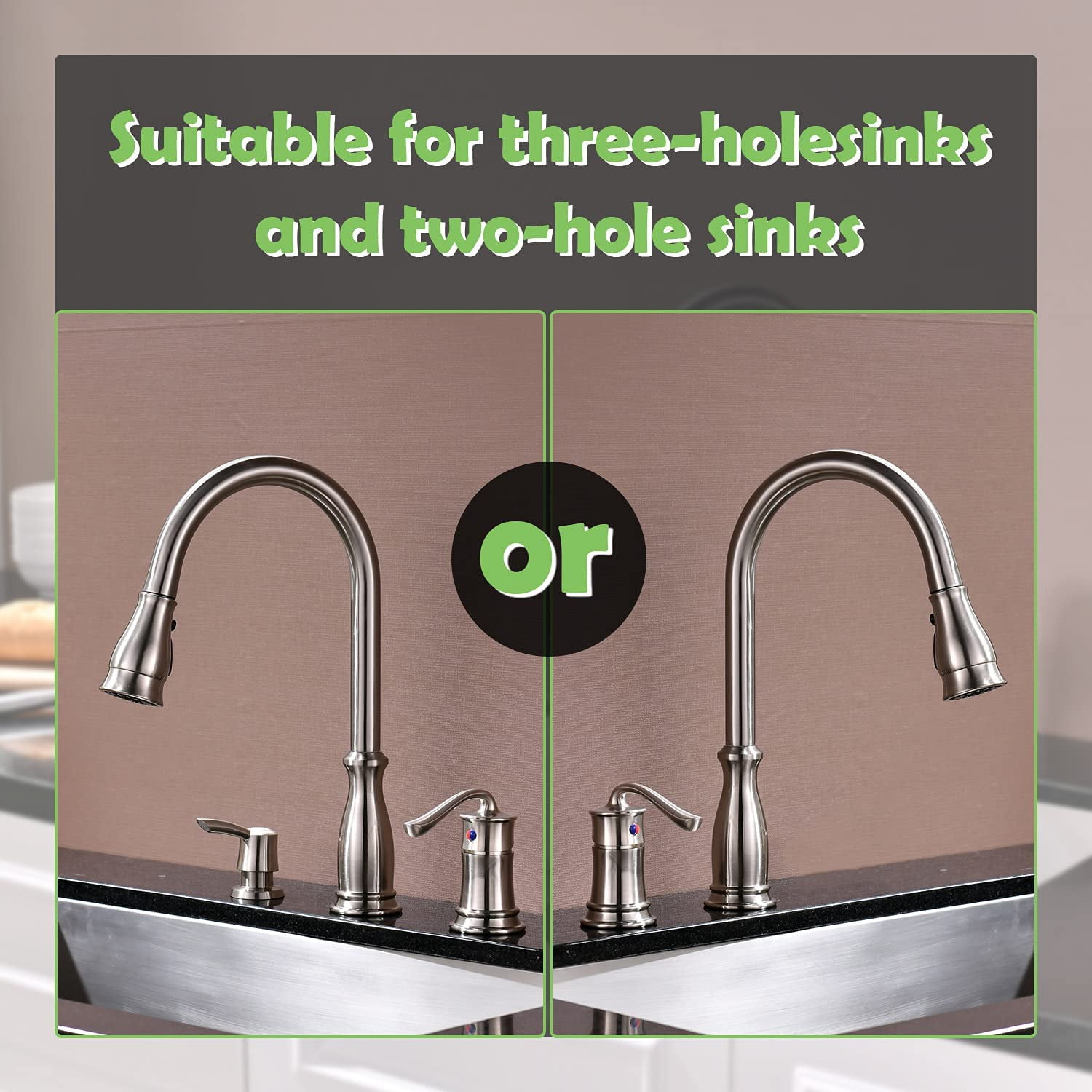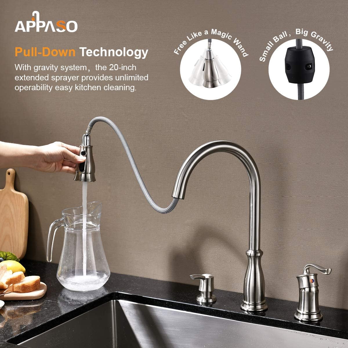 APPASO 3 Hole Kitchen Faucet with Pull Down Sprayer Stainless Steel Brushed Nickel Single Handle Pull Out Kitchen Sink Faucet with Soap Dispenser. Patented Design: Rejecting the ordinary, our kitchen faucet will give you a new vision, making your eyes shine. More than 200,000 families have upgraded their kitchens with our faucets, which are highly praised. Multi-scene Use: If your kitchen sink has 3-holes, use it together with the soap dispenser to cover your sink holes perfectly. If your kitchen sink is 2-hole, you can choose not to install the soap dispenser.