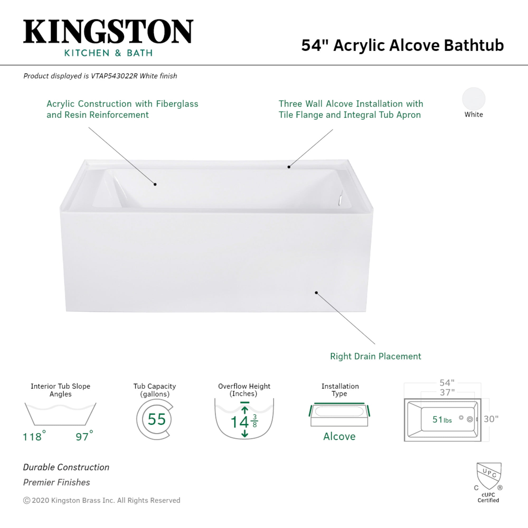 Aqua Eden VTAP543022R 54-Inch Acrylic Rectangular 3-Wall Alcove Tub, Right Hand Drain in Glossy White