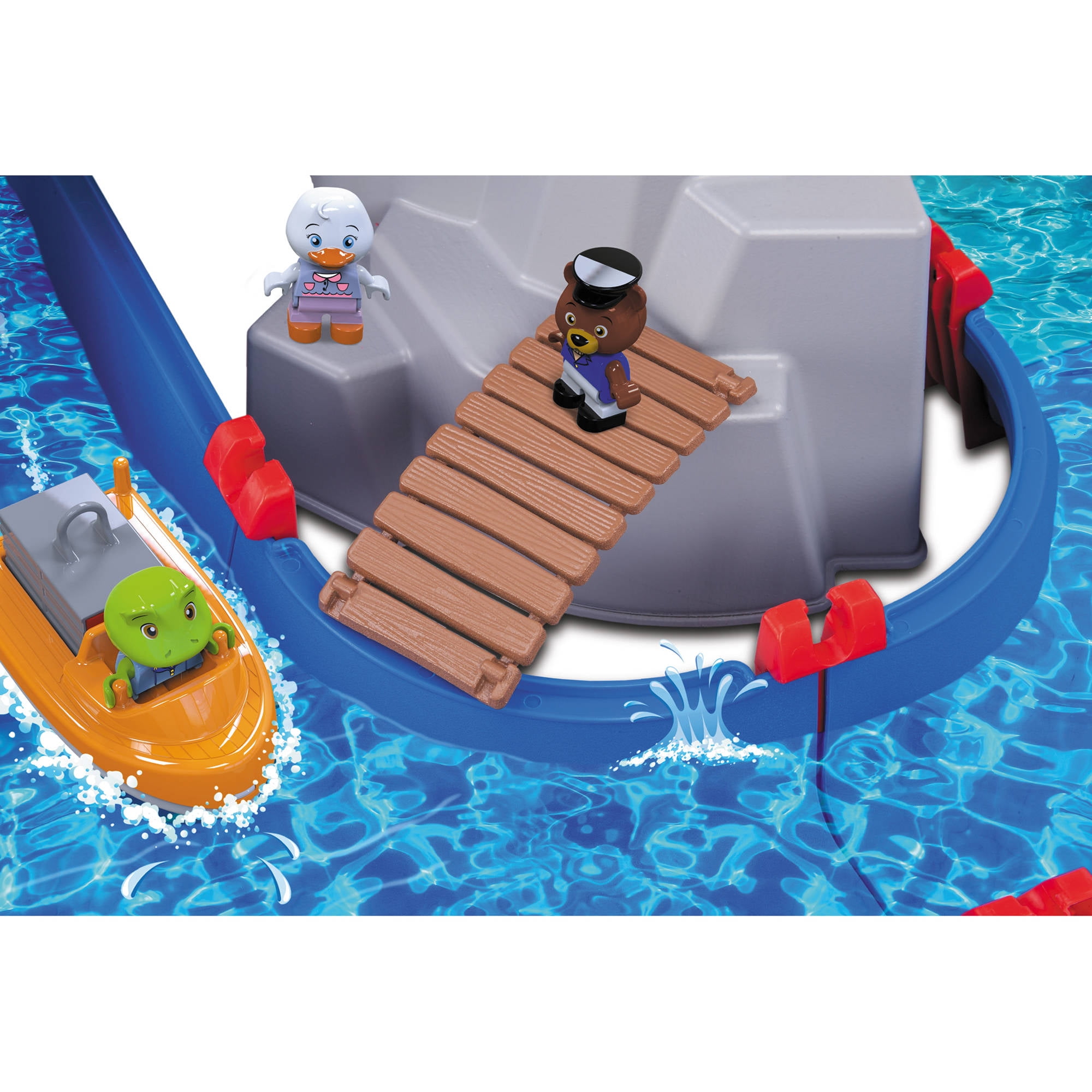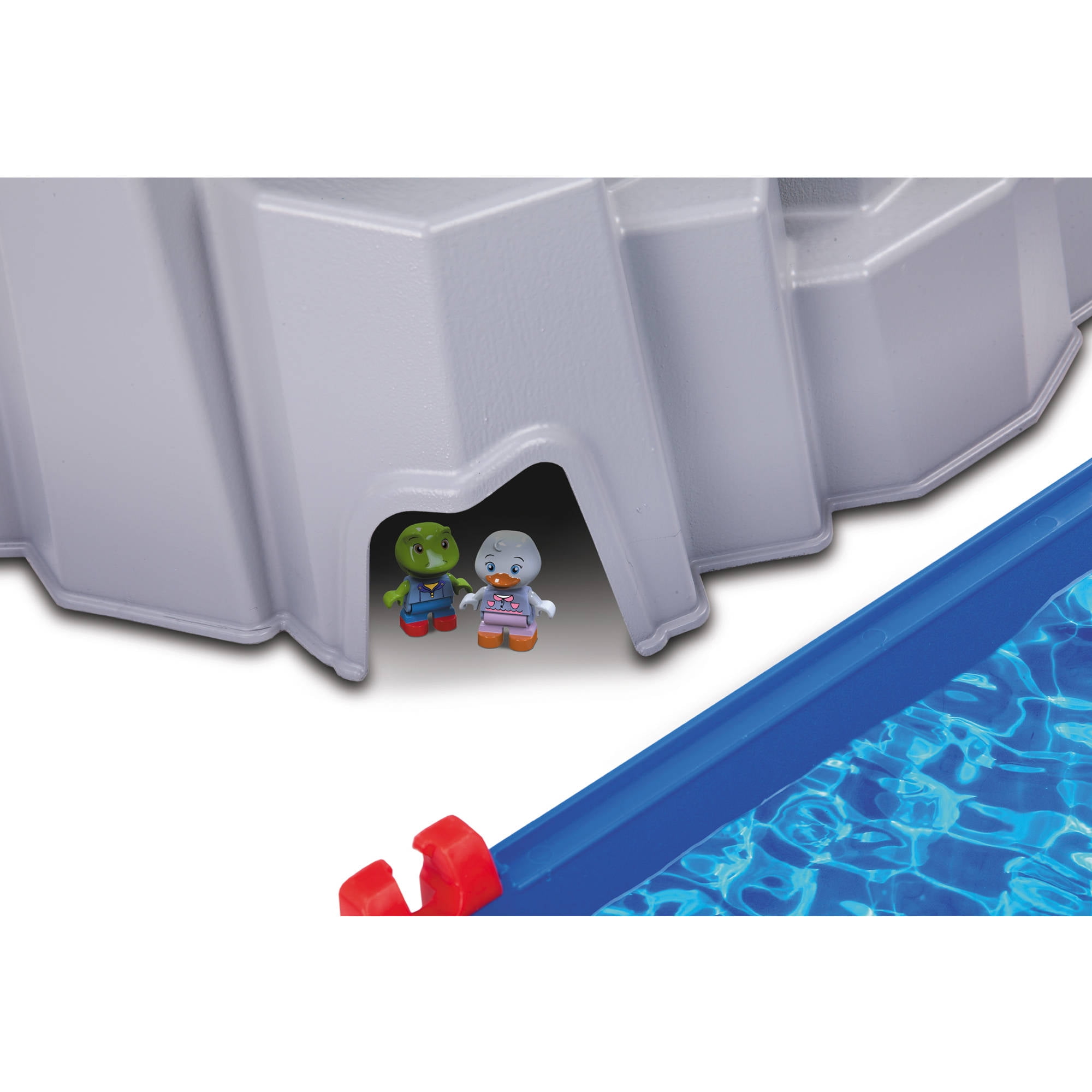Meet Aquaplay’s new adventure, the Mountain Lake. This large cal system will keep your children occupied for hours with the brand new play feature; the big mountain with a lake. It also contains a speedboat, a container boat with container and the three animal figures; Lotta the Duck, Nils the Frog and Bo the Bear. Together with the figures, children can explore the mountain’s mysterious cave, climb the steep cliffs, take the speedboat down the hilarious waterfall or search for treasures in the cals. Set the water into motion by paddling the water wheel and pass through the enormous lock system. You regulate the water level by using the pump and opening the lock gates. This is a creative and playful way of educating how water moves, lifts and climbs.